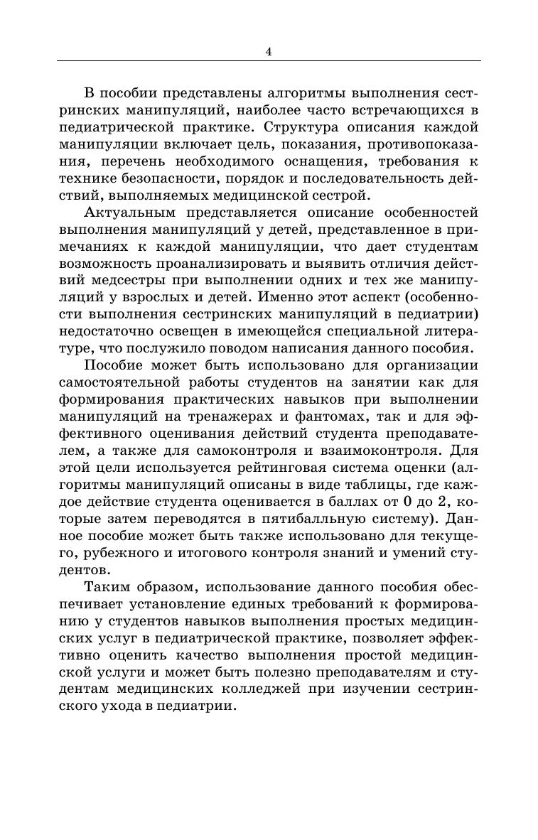 В учебном пособии описаны алгоритмы выполнения основных манипуляций, наиболее часто встречающихся в педиатрической практике.Пособие может быть использовано как для организации самостоятельной работы студентов на занятии и формирования практических навыков при выполнении манипуляций на тренажерах и фантомах, так и для эффективного оценивания действий студента преподавателем, а также для самоконтроля и взаимоконтроля. Соответствует современным требованиям Федерального государственного образовательного стандарта среднего профессионального образования и профессиональным квалификационным требованиям. Данное пособие предназначено для студентов медицинских колледжей, обучающихся по специальностям «Сестринское дело», «Лечебное дело», а также для практикующих медицинских сестер.