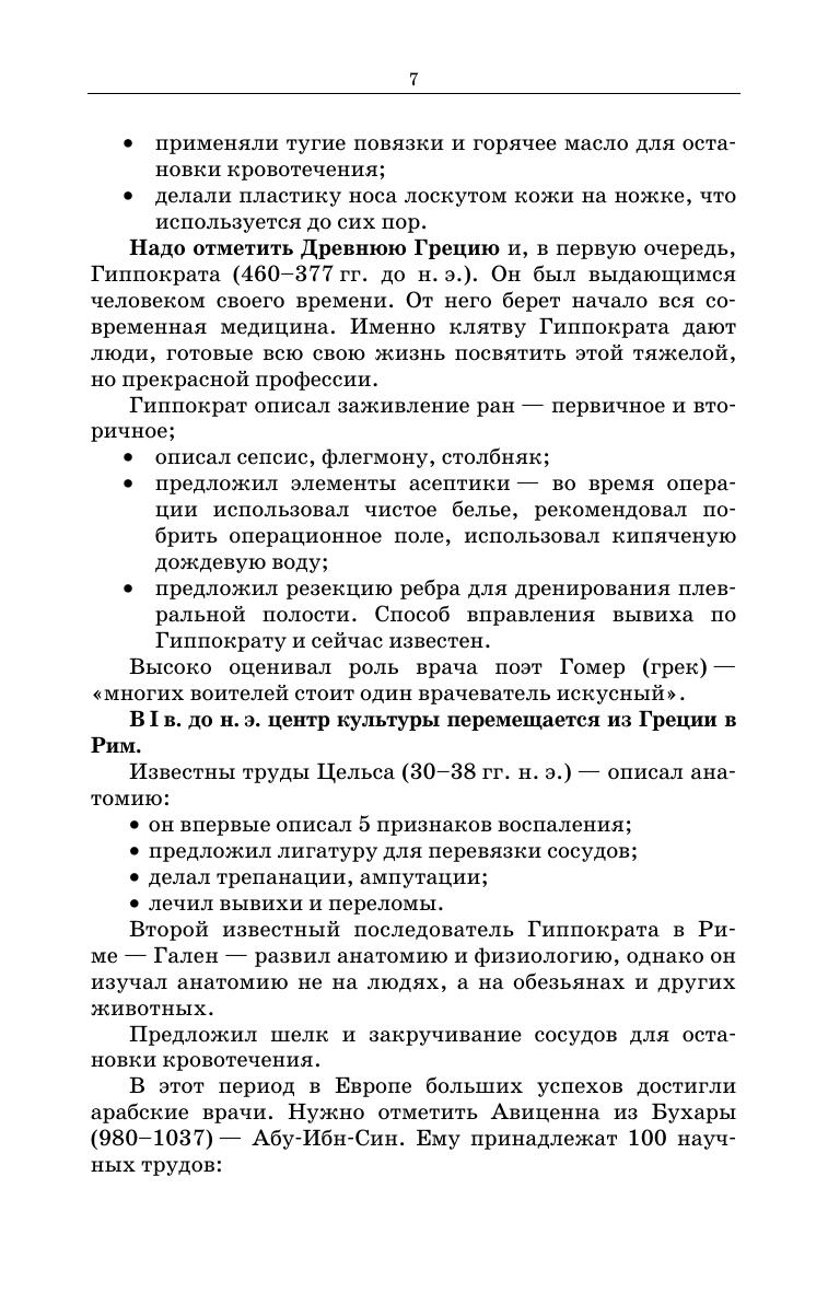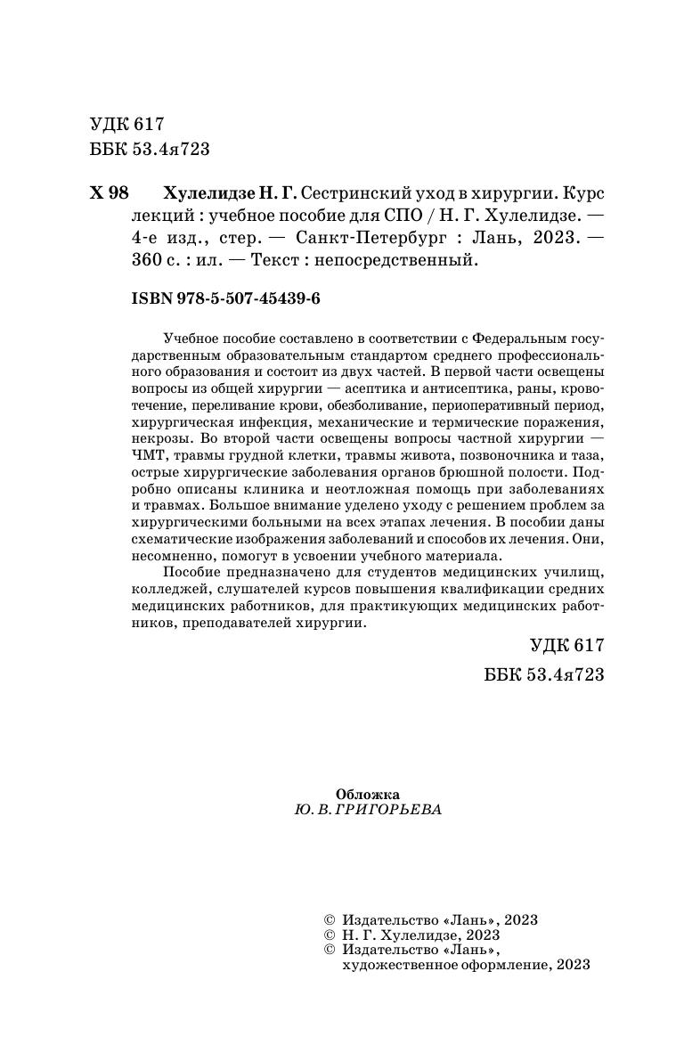 Учебное пособие составлено в соответствии с Федеральным государственным образовательным стандартом среднего профессионального образования и состоит из двух частей. В первой части освещены вопросы из общей хирургии — асептика и антисептика, раны, кровотечение, переливание крови, обезболивание, периоперативный период, хирургическая инфекция, механические и термические поражения, некрозы. Во второй части освещены вопросы и частной хирургии — ЧМТ, травмы грудной клетки, травмы живота, позвоночника и таза, острые хирургические заболевания органов брюшной полости. Подробно описаны клиника и неотложная помощь при заболеваниях и травмах. Большое внимание уделено уходу с решением проблем за хирургическими больными на всех этапах лечения. В пособии даны схематические изображения заболеваний и способов их лечения. Они, несомненно, помогут в усвоении учебного материала. Соответствует современным требованиям Федерального государственного образовательного стандарта среднего профессионального образования и профессиональным квалификационным требованиям. Пособие предназначено для студентов медицинских училищ, колледжей, слушателей курсов повышения квалификации средних медицинских работников, для практикующих медицинских работников, преподавателей хирургии.