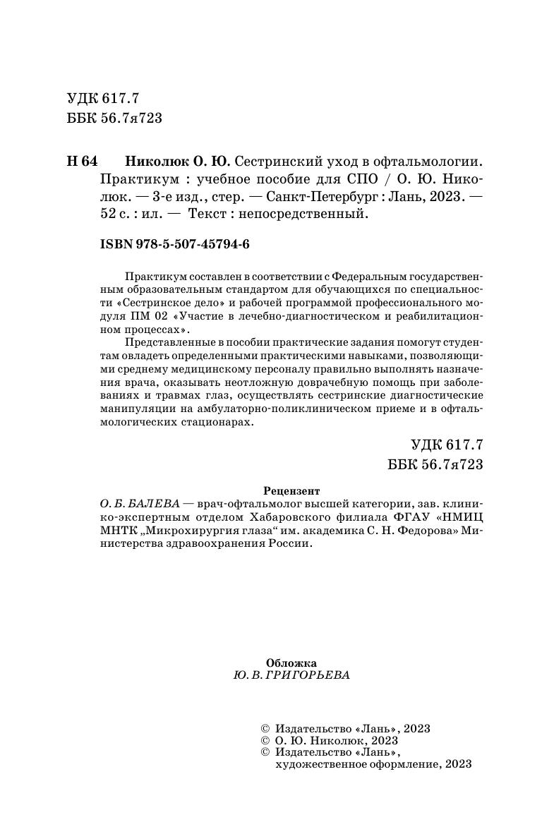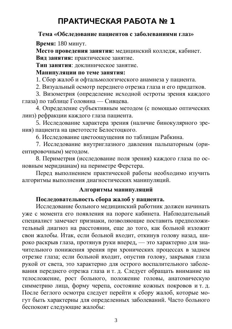 Практикум составлен в соответствии с Федеральным государственным образовательным стандартом для обучающихся по специальности «Сестринское дело» и рабочей программы профессионального модуля ПМ 02 «Участие в лечебно-диагностическом и реабилитационном процессах». Представленные в пособии практические задания помогут студентам овладеть определенными практическими навыками, позволяющими среднему медицинскому персоналу правильно выполнять назначения врача, оказывать неотложную доврачебную помощь при заболеваниях и травмах глаз, осуществлять сестринские диагностические манипуляции на амбулаторно-поликлиническом приеме и в офтальмологических стационарах.