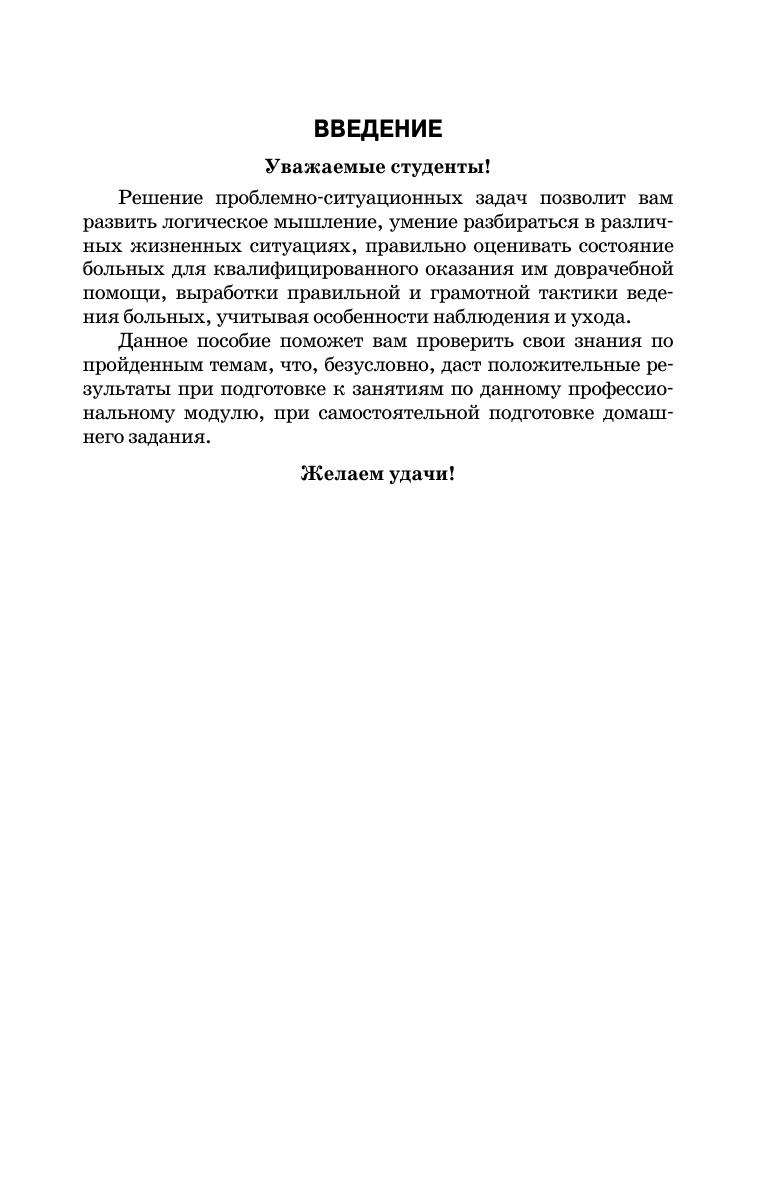 В сборнике представлены проблемно ситуационные задачи по основным разделам дисциплины и по неотложным состояниям, встречающимся в практике медицинской сестры. Большинство задач сопровождаются иллюстрационным материалом. В процессе усвоения модуля студент должен научиться мыслить клинически. Решение задач предполагает выявить у студентов способность определять нарушенные потребности и проблемы пациента, выделять цели и составлять план сестринских вмешательств. Для контроля усвоения материала студентам предлагаются эталоны решений задач по всем нозологическим формам. Сборник задач написан в соответствии с ФГОС для специальности «Сестринское дело» ПМ 02. «Участие в лечебно диагностическом и реабилитационных процессах», МДК 02.01. «Сестринский уход при различных заболеваниях и состояниях», раздел 02.01. «Проведение сестринского ухода в терапии». Пособие может быть использовано как для аудиторной, так и для внеаудиторной работы студентами в плане самоподготовки по дисциплине, удобно в проведении педагогического процесса начинающими преподавателями для рубежного и итогового контроля, так как отражает все темы изучаемой дисциплины.