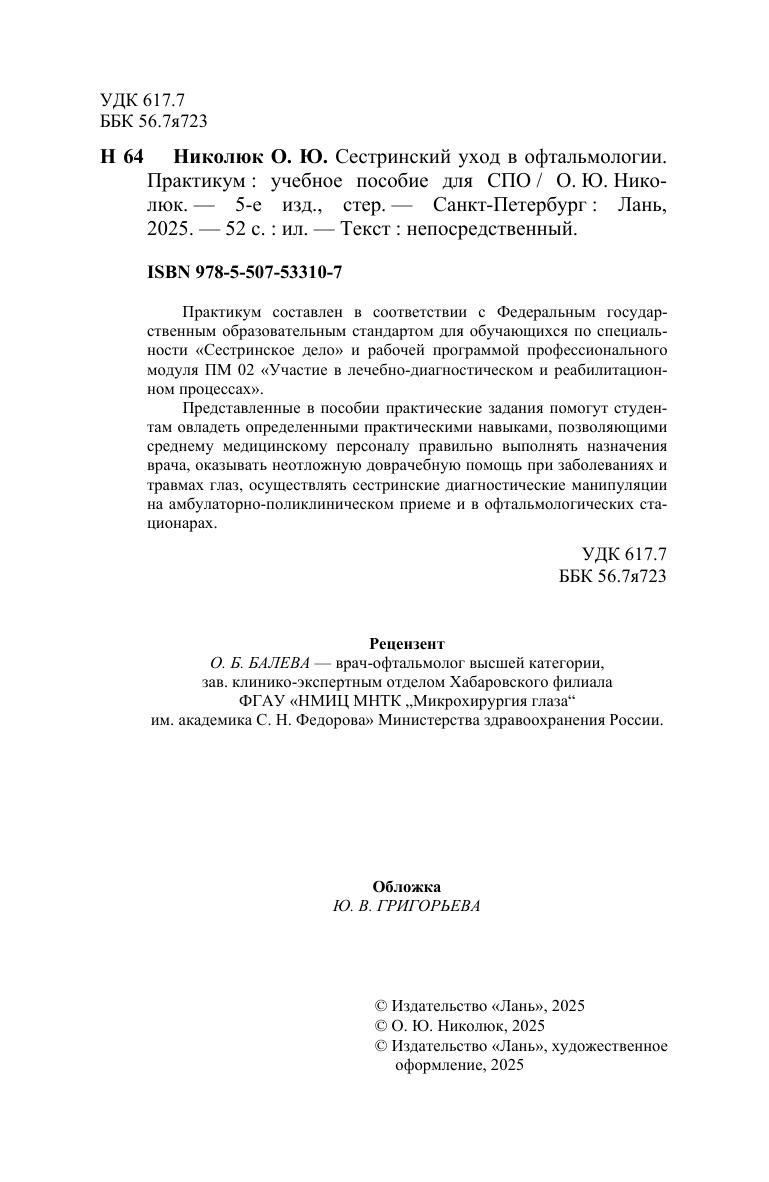 Практикум составлен в соответствии с Федеральным государственным образовательным стандартом для обучающихся по специальности «Сестринское дело» и рабочей программой профессионального модуля ПМ 02 «Участие в лечебно-диагностическом и реабилитационном процессах». Представленные в пособии практические задания помогут студентам овладеть определенными практическими навыками, позволяющими среднему медицинскому персоналу правильно выполнять назначения врача, оказывать неотложную доврачебную помощь при заболеваниях и травмах глаз, осуществлять сестринские диагностические манипуляции на амбулаторно-поликлиническом приеме и в офтальмологических стационарах.