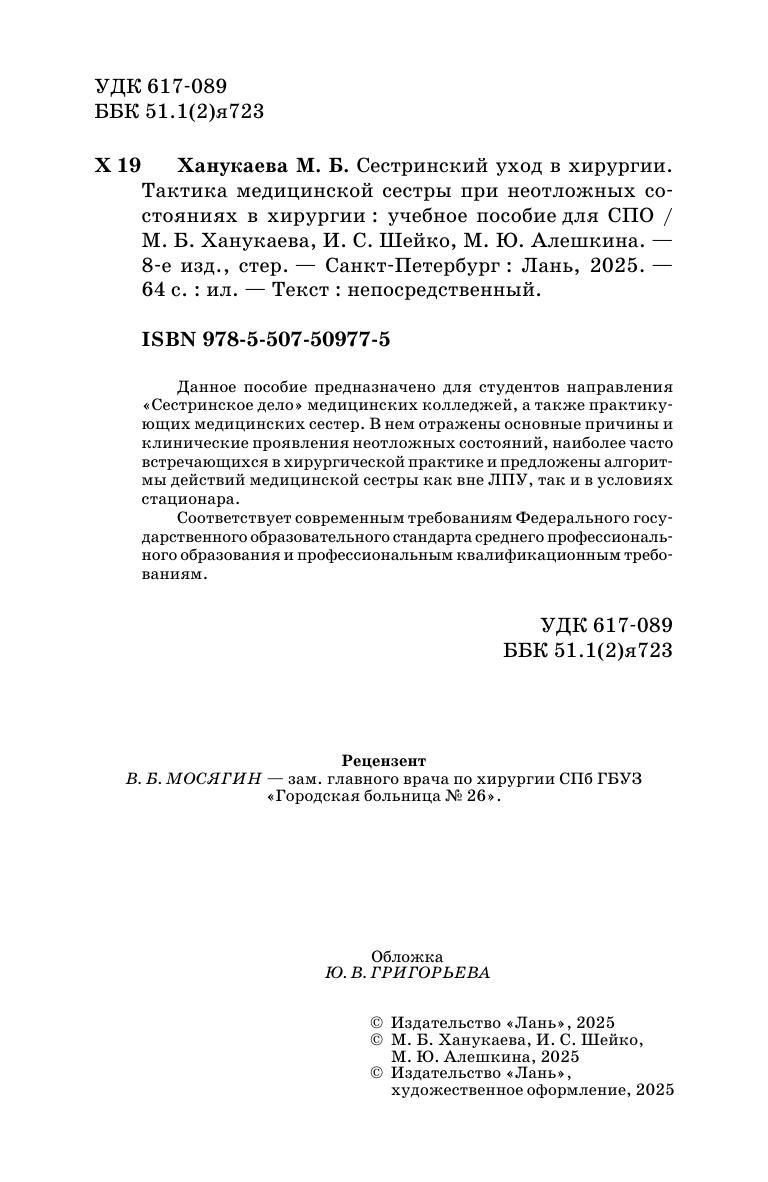 Данное пособие предназначено для студентов медицинских колледжей, а также практикующих медицинских сестер. В нем отражены основные причины и клинические проявления неотложных состоянии, наиболее часто встречающихся в хирургической практике и предложены алгоритмы действий медицинской сестры как вне ЛПУ, так и в условиях стационара. Соответствует современным требованиям Федерального государственного образовательного стандарта среднего профессионального образования и профессиональным квалификационным требованиям.