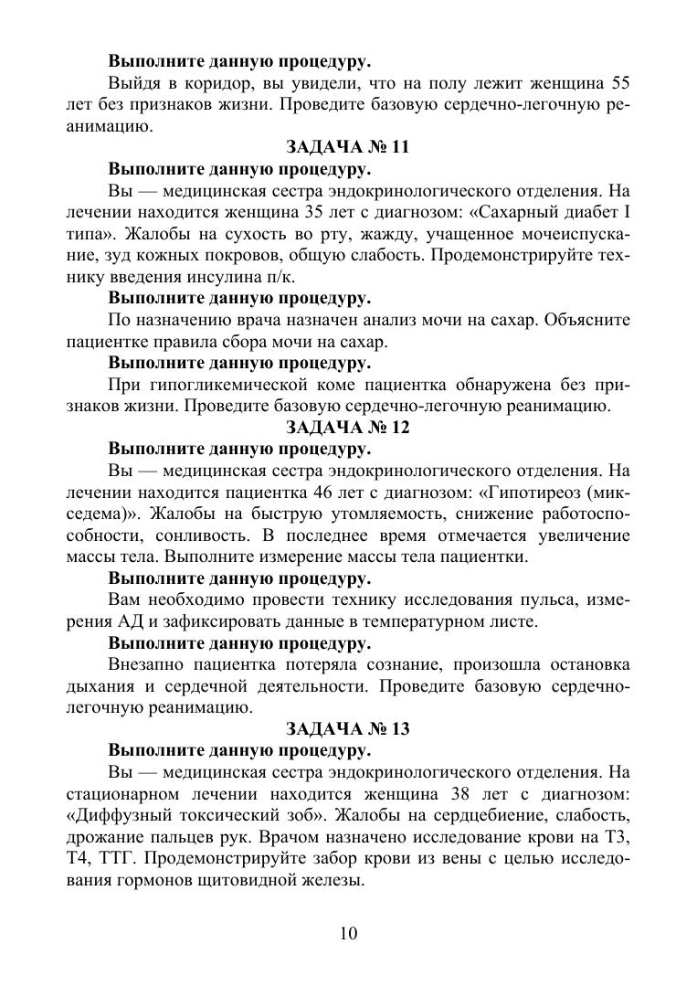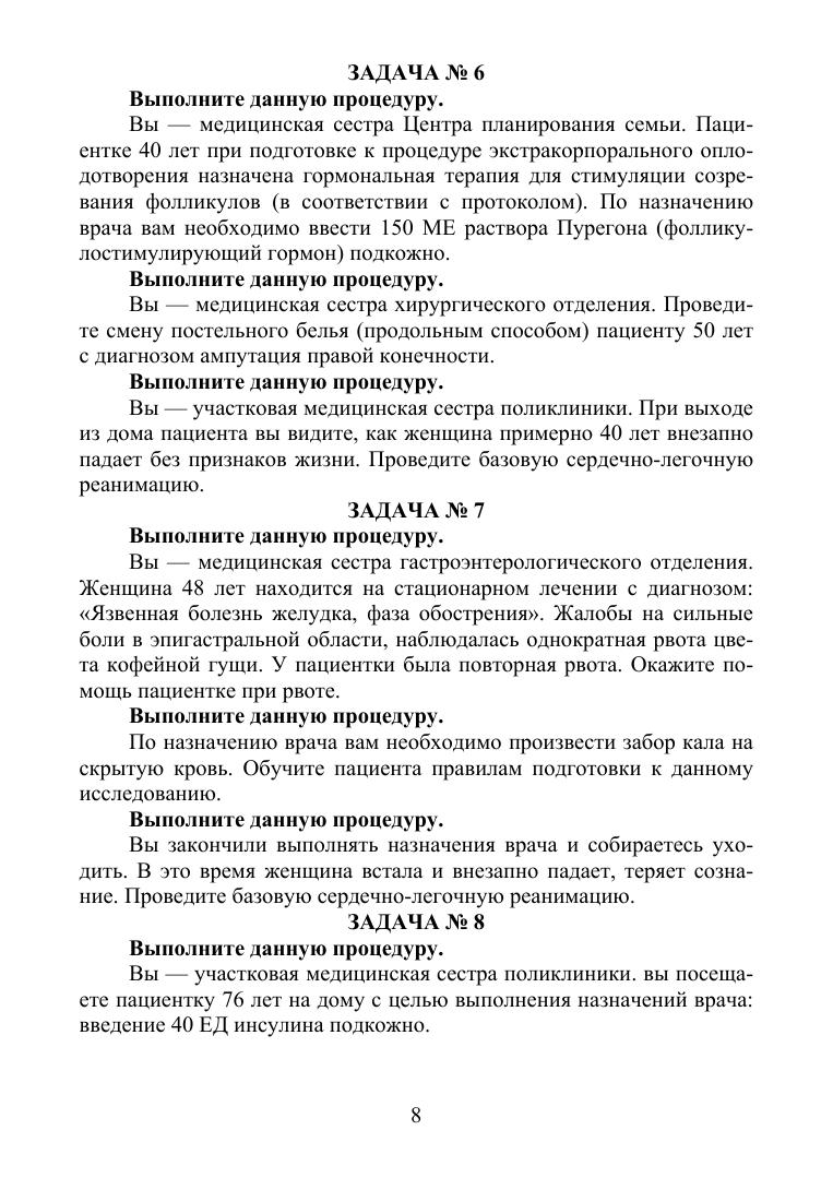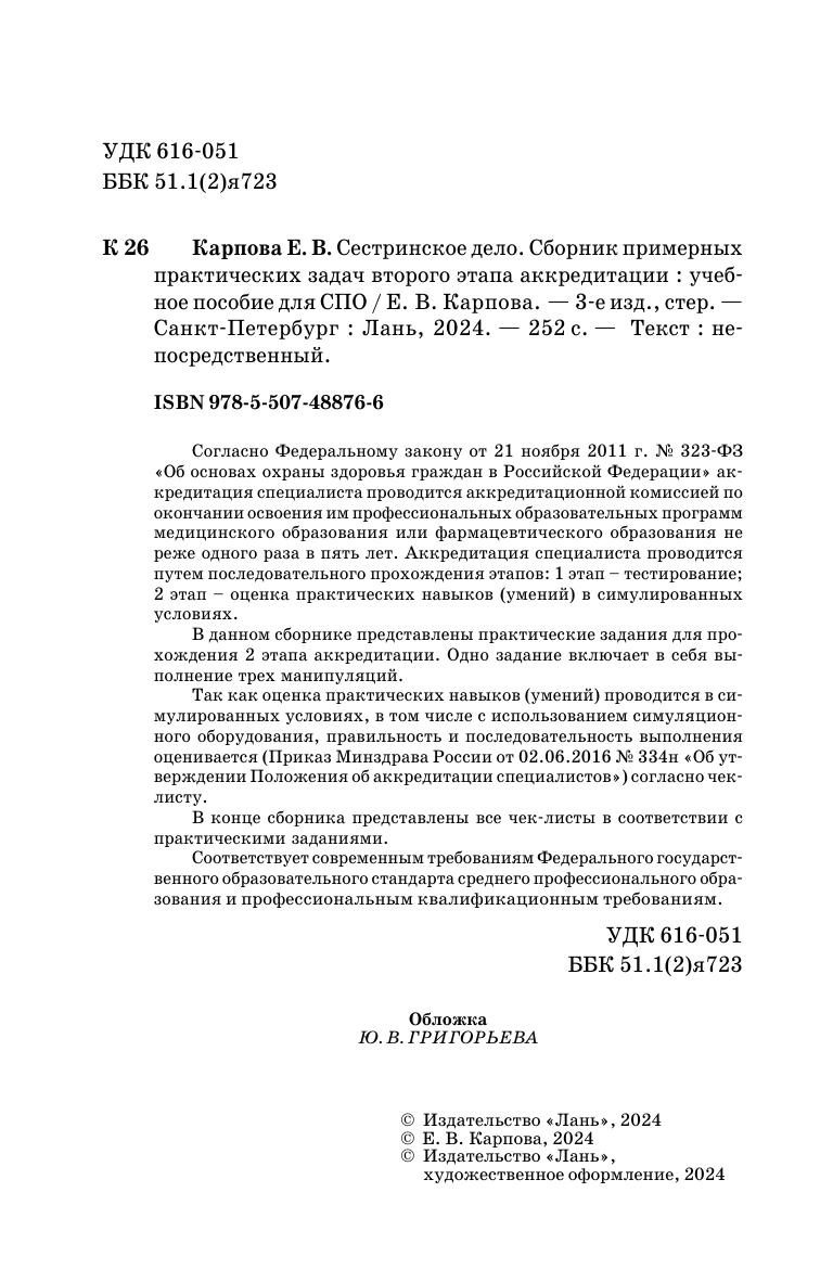 Согласно Федеральному закону от 21 ноября 2011 г. № 323-ФЗ «Об основах охраны здоровья граждан в Российской Федерации» аккредитация специалиста проводится аккредитационной комиссией по окончании освоения им профессиональных образовательных программ медицинского образования или фармацевтического образования не реже одного раза в пять лет. Аккредитация специалиста проводится путем последовательного прохождения этапов: 1 этап – тестирование, 2 этап – оценка практических навыков (умений) в симулированных условиях. В данном сборнике представлены практические задания для прохождения 2 этапа аккредитации. Одно задание включает в себя выполнение трех манипуляций. Так как оценка практических навыков (умений) проводится в симулированных условиях, в том числе с использованием симуляционного оборудования, правильность и последовательность выполнения оценивается (Приказ Минздрава России от 02.06.2016 № 334н «Об утверждении Положения об аккредитации специалистов») согласно чек-листу. В конце сборника представлены все чек-листы в соответствии с практическими заданиями. Соответствует современным требованиям Федерального государственного образовательного стандарта среднего профессионального образования и профессиональным квалификационным требованиям.