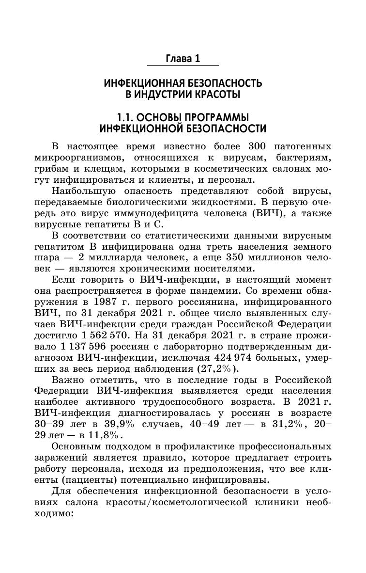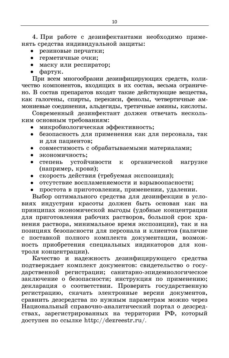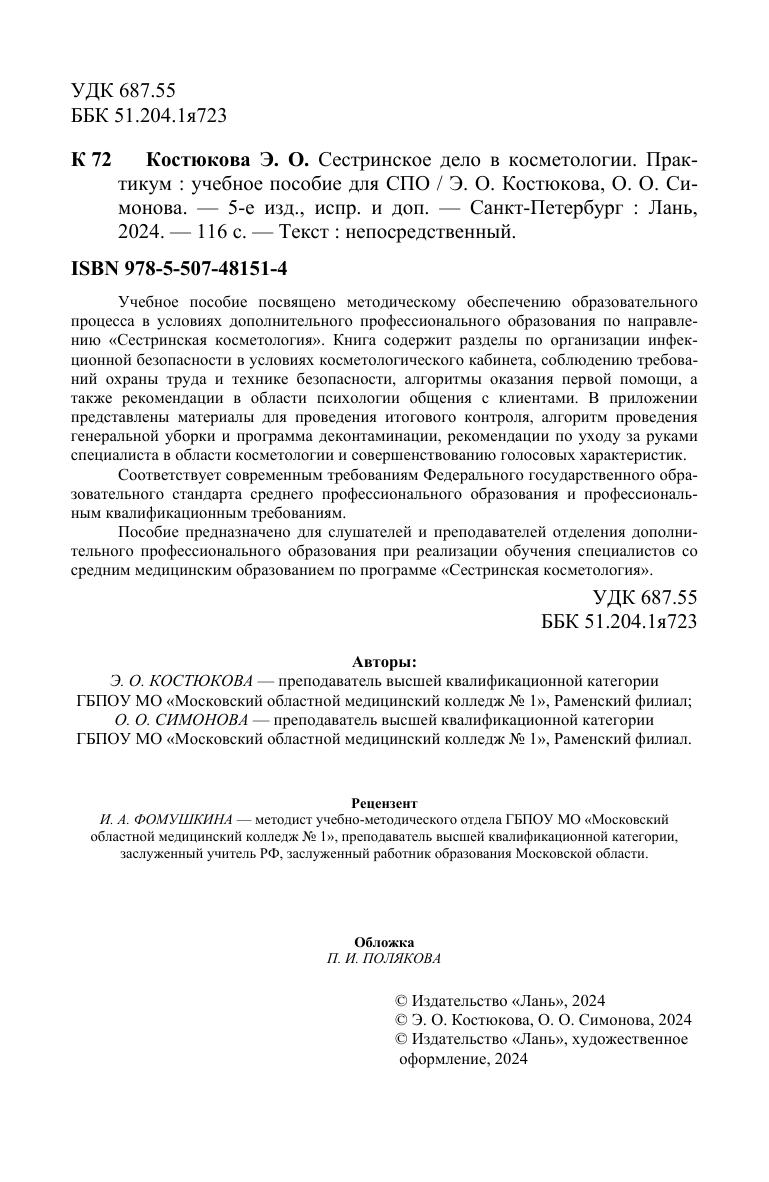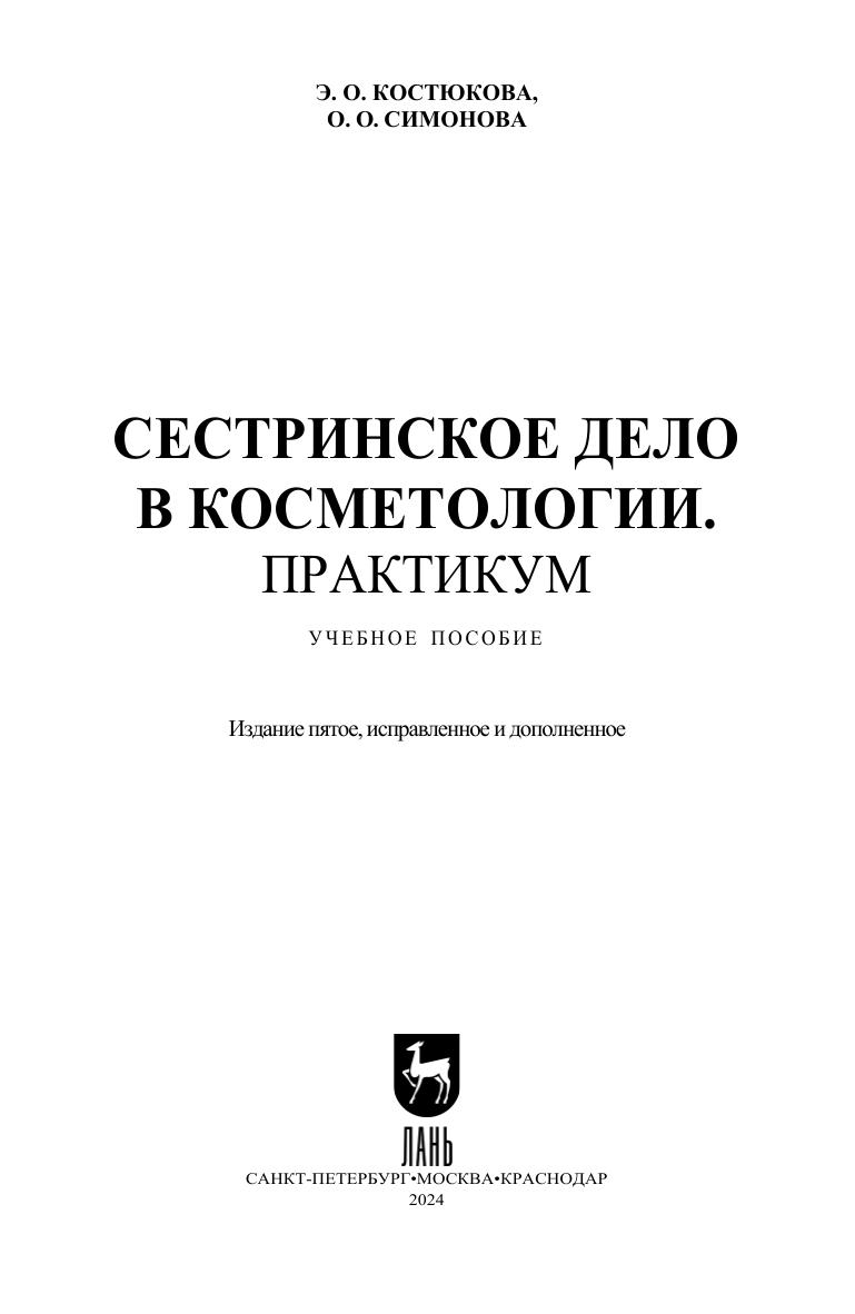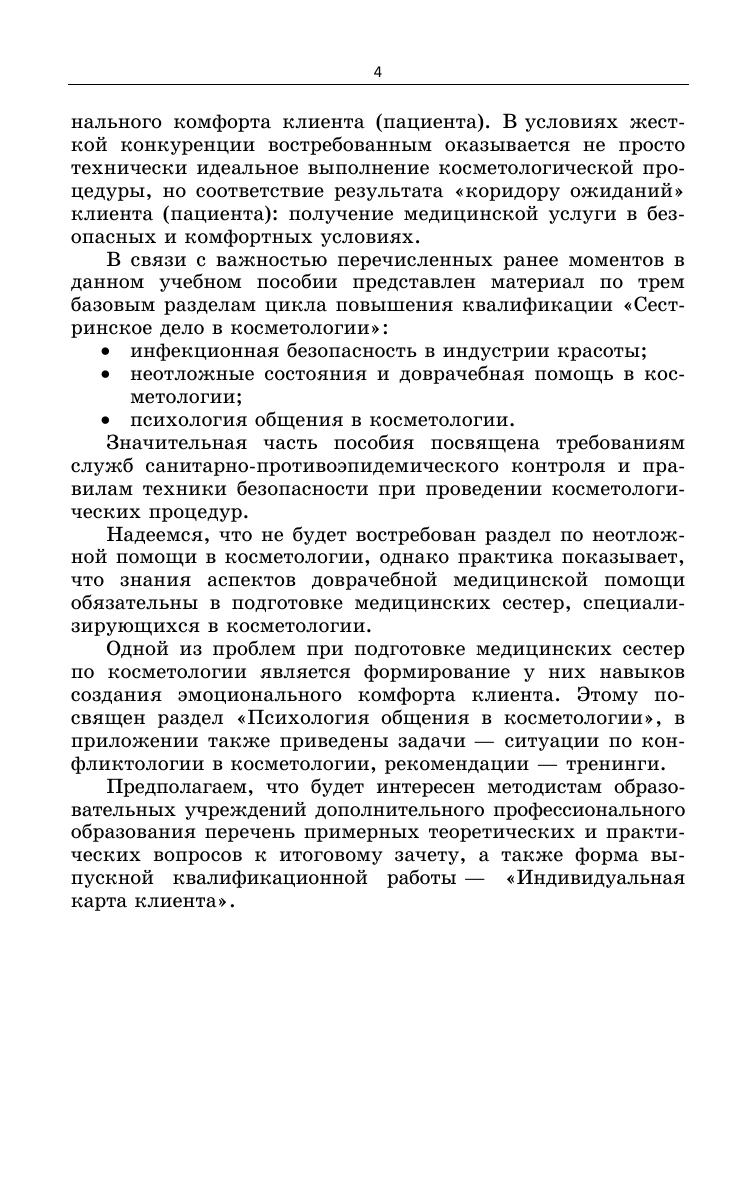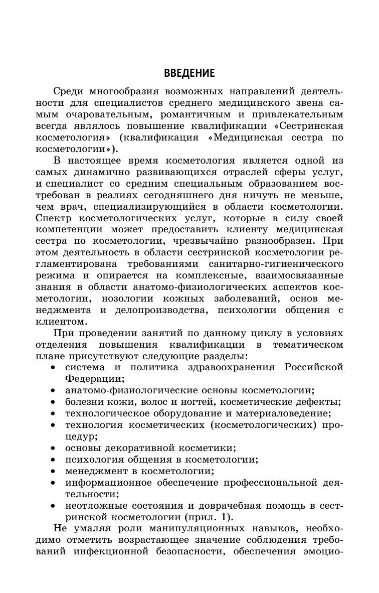 Учебное пособие посвящено методическому обеспечению образовательного процесса в условиях дополнительного профессионального образования по направлению «Сестринская косметология». Книга содержит разделы по организации инфекционной безопасности в условиях косметологического кабинета, соблюдению требований охраны труда и технике безопасности, алгоритмы оказания первой помощи, а также рекомендации в области психологии общения с клиентами. В приложении представлены материалы для проведения итогового контроля, алгоритм проведения генеральной уборки, и программа деконтаминации, рекомендации по уходу за руками специалиста в области косметологии и совершенствованию голосовых характеристик. Соответствует современным требованиям Федерального государственного образовательного стандарта среднего профессионального образования и профессиональным квалификационным требованиям. Пособие предназначено для слушателей и преподавателей отделения дополнительного профессионального образования при реализации обучения специалистов со средним медицинским образованием по программе «Сестринская косметология».