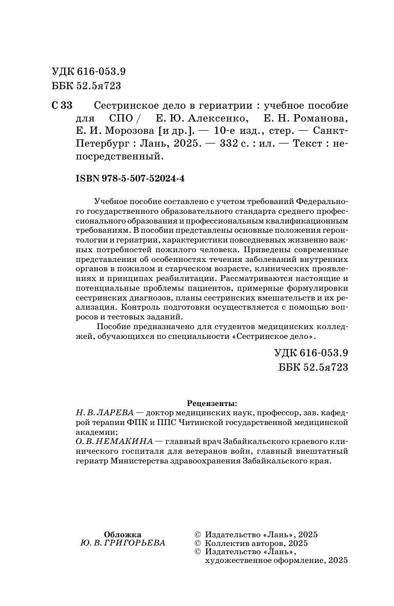 Учебное пособие составлено с учетом требований Федерального государственного образовательного стандарта. В пособии представлены основные положения геронтологии и гериатрии, характеристики повседневных жизненно важных потребностей пожилого человека. Приведены современные представления об особенностях течения заболеваний внутренних органов в пожилом и старческом возрасте, клинических проявлениях и принципах реабилитации. Рассматриваются проблемы пациентов (настоящие и потенциальные), примерные формулировки сестринских диагнозов, планы сестринских вмешательств и их реализация. Контроль подготовки осуществляется с помощью вопросов и тестовых заданий. Соответствует современным требованиям Федерального государственного образовательного стандарта среднего профессионального образования и профессиональным квалификационным требованиям. Пособие предназначено для студентов, обучающихся по специальности «Сестринское дело» медицинских колледжей.