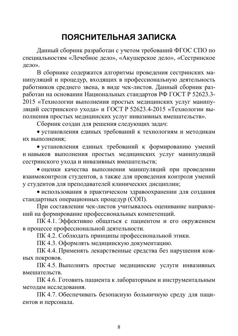 Сборник содержит алгоритмы проведения сестринских манипуляций и процедур, входящих в профессиональную деятельность специалистов среднего звена, в виде чек-листов. Соответствует современным требованиям Федерального государственного образовательного стандарта среднего профессионального образования и профессиональным квалификационным требованиям.