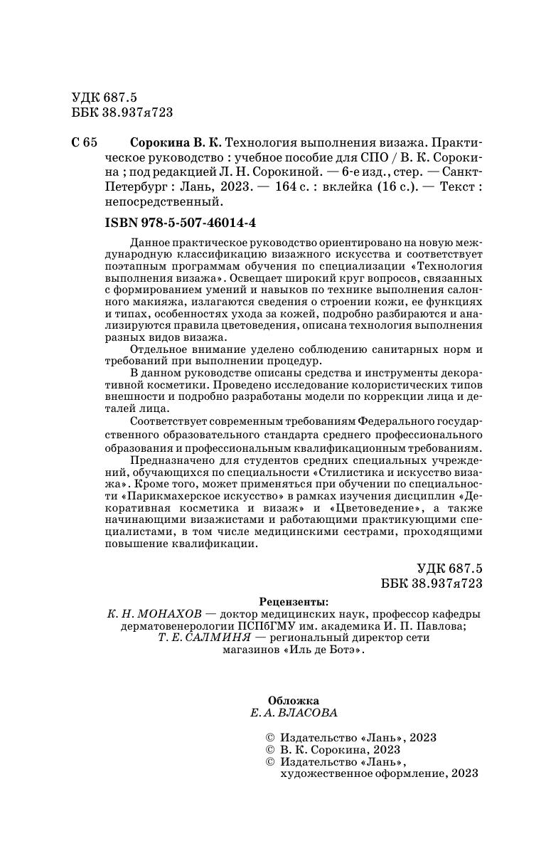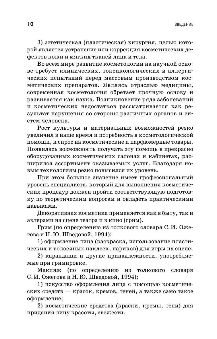 Данное практическое руководство ориентировано на новую международную классификацию визажного искусства и соответствует поэтапным программам обучения по специализации «Технология выполнения визажа». Освещает широкий круг вопросов, связанных с формированием умений и навыков по технике выполнения салонного макияжа, излагаются сведения о строении кожи, ее функции и типах, особенностях ухода за кожей, подробно разбираются и анализируются правила цветоведения, описана технология выполнения разных видов визажа. Отдельное внимание уделено соблюдению санитарных норм и требований при выполнении процедур.В данном руководстве описаны средства и инструменты декоративной косметики. Проведено исследование колористических типов внешности и подробно разработаны модели по коррекции лица и деталей лица. Соответствует современным требованиям Федерального государственного образовательного стандарта среднего профессионального образования и профессиональным квалификационным требованиям. Предназначено для студентов, обучающихся по специальности «Стилистика и искусство визажа». Кроме того, может применяться при обучении по специальности «Парикмахерское искусство» в рамках изучения дисциплин «Декоративная косметика и визаж» и «Цветоведение», а также начинающими визажистами и работающими практикующими специалистами, в том числе, медицинскими сестрами, проходящими повышение квалификации.