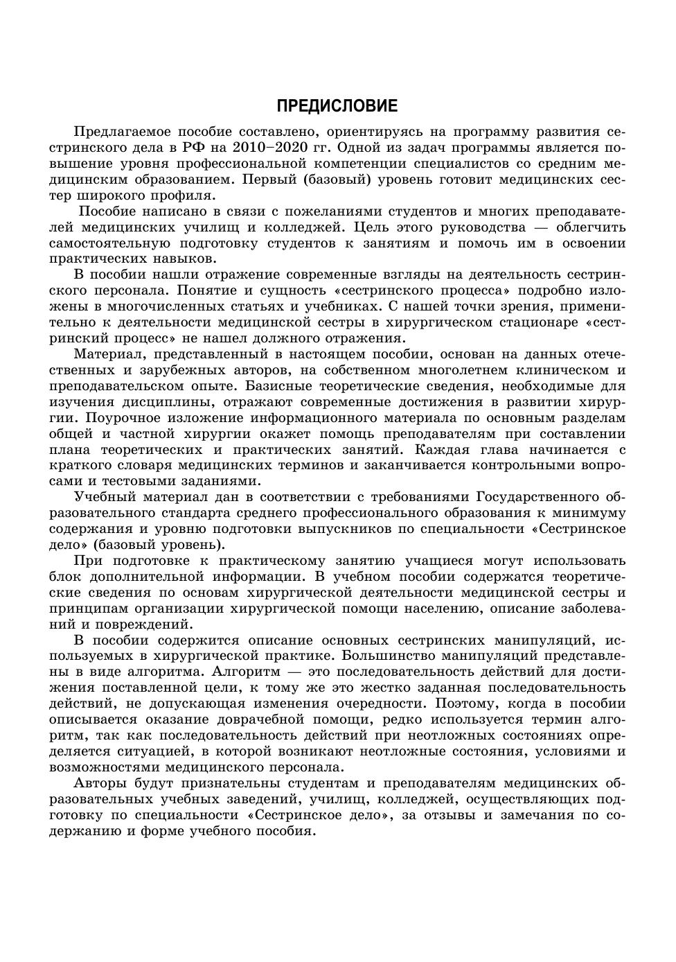 Учебное пособие содержит подробное описание практических манипуляций, которыми в процессе обучения должны овладеть студенты отделения «Сестринское дело». Освещены теоретические вопросы из курса общей и частной хирургии в объёме требований программы обучения медицинских сестер, но пособие может использоваться также и для обучения фельдшеров. Каждый тематический раздел завершается вопросами, ситуационными задачами и тестами для самопроверки. Соответствует современным требованиям Федерального государственного образовательного стандарта среднего профессионального образования и профессиональным квалификационным требованиям. Для студентов медицинских училищ и колледжей.