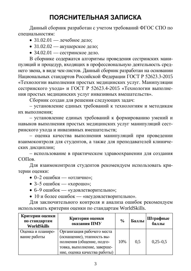 В учебном пособии содержатся алгоритмы проведения сестринских манипуляций и процедур, входящих в профессиональную деятельность среднего звена в виде чек-листов. Пособие создано для установления единых требований к технологиям и методик их выполнения, к формированию умений и навыков выполнения простых медицинских услуг манипуляций сестринского ухода и инвазивных вмешательств, к оценке качества выполнения манипуляций при проведении взаимоконтроля для студентов, а также для преподавателей клинических дисциплин. Пособие разработано с учетом требований ФГОС СПО по специальностям «Лечебное дело», «Акушерское дело», «Сестринское дело». Также может использоваться практикующими специалистами.