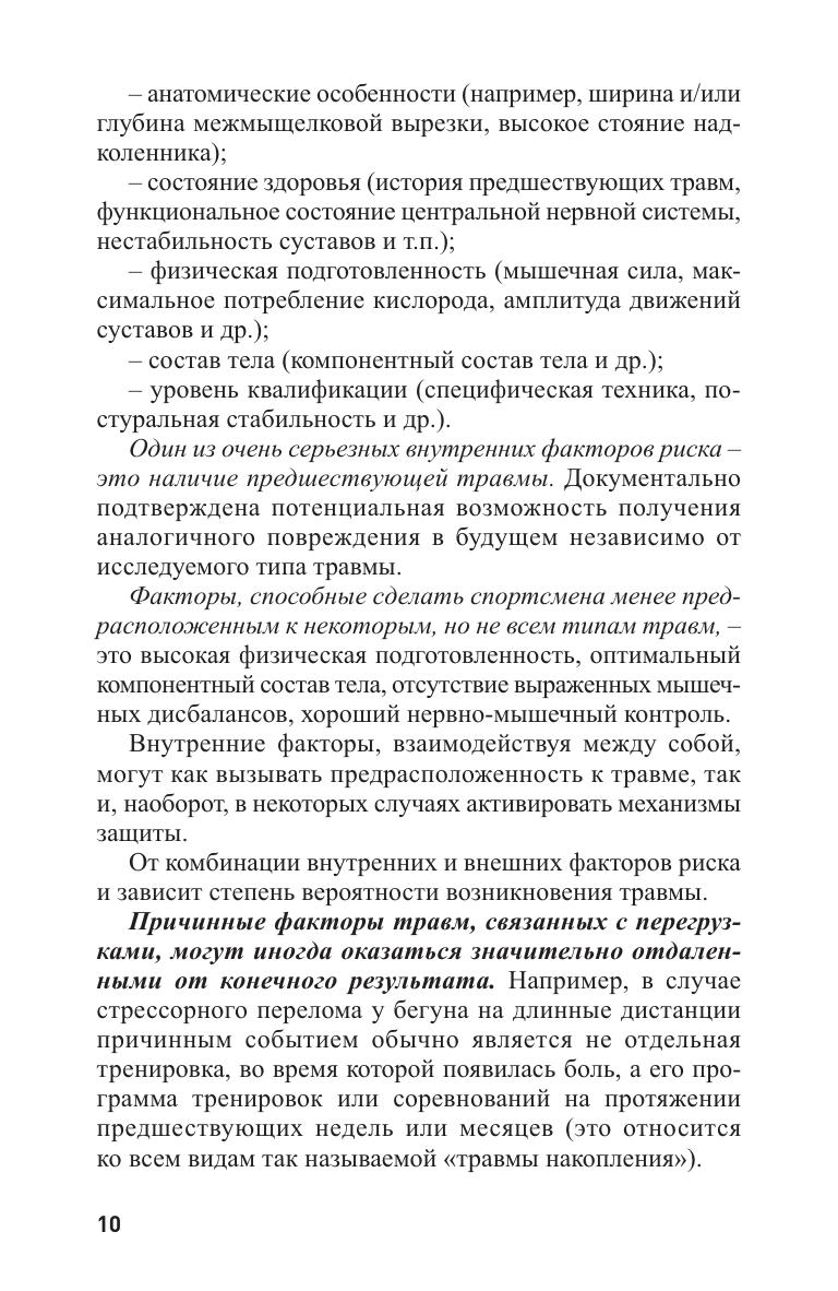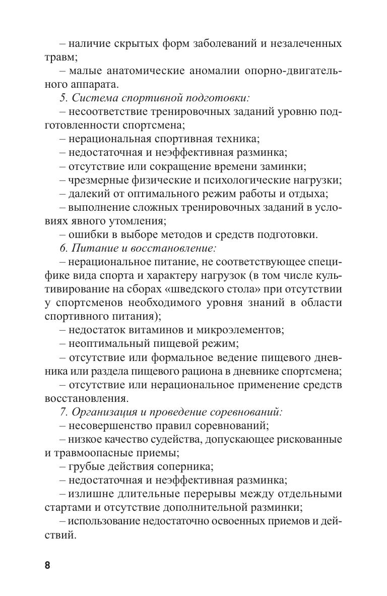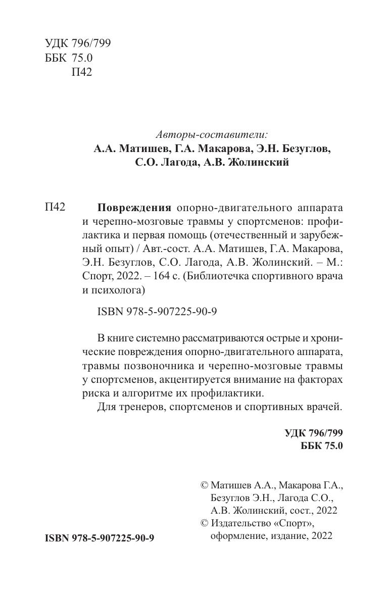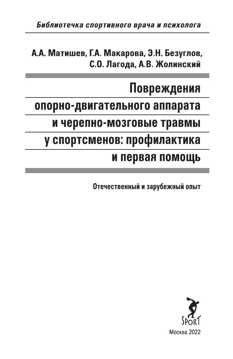 В книге системно рассматриваются острые и хронические повреждения опорно-двигательного аппарата, травмы позвоночника и черепно-мозговые травмы у спортсменов, акцентируется внимание на факторах риска и алгоритме их профилактики.