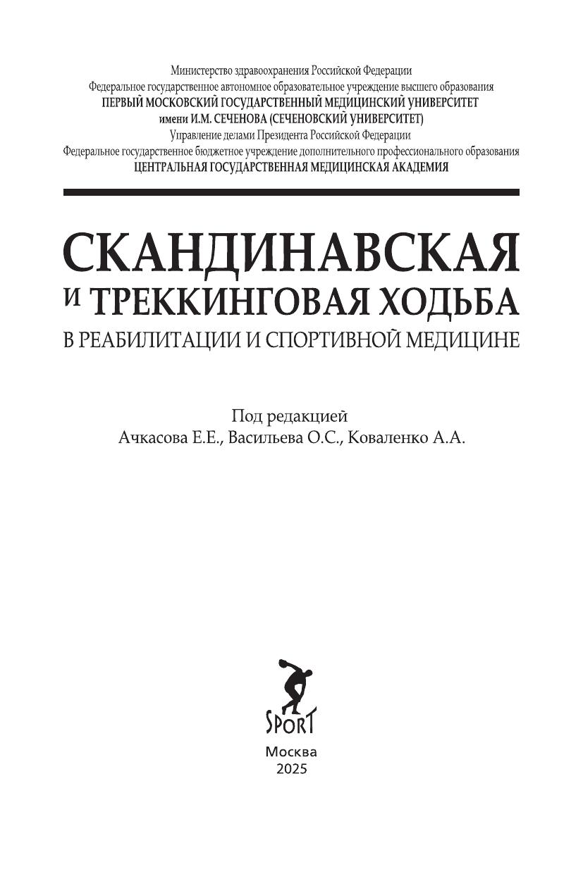 В монографии проведен систематический анализ литературы и обобщен более чем 10-летний опыт авторов по использованию скандинавской и треккинговой ходьбы в медицинской реабилитации пациентов с различными соматическими заболеваниями и поражениями опорно-двигательного аппарата. Изложены история развития, клинико-функциональное обоснование использования, особенности врачебного контроля, санитарно-гигиенические требования, экипировка и техническое оснащение занятий скандинавской и треккинговой ходьбой. Приведены упражнения с палками как на открытой площадке, так и в условиях крытого зала. Прочтение монографии будет полезно врачам по лечебной физкультуре, спортивной медицине, физической и реабилитационной медицине, врачам смежных специальностей, клиническим ординаторам, специалистам в области физической культуры и спорта, студентам образовательных учреждений в сфере медицины, физической культуры и спорта.