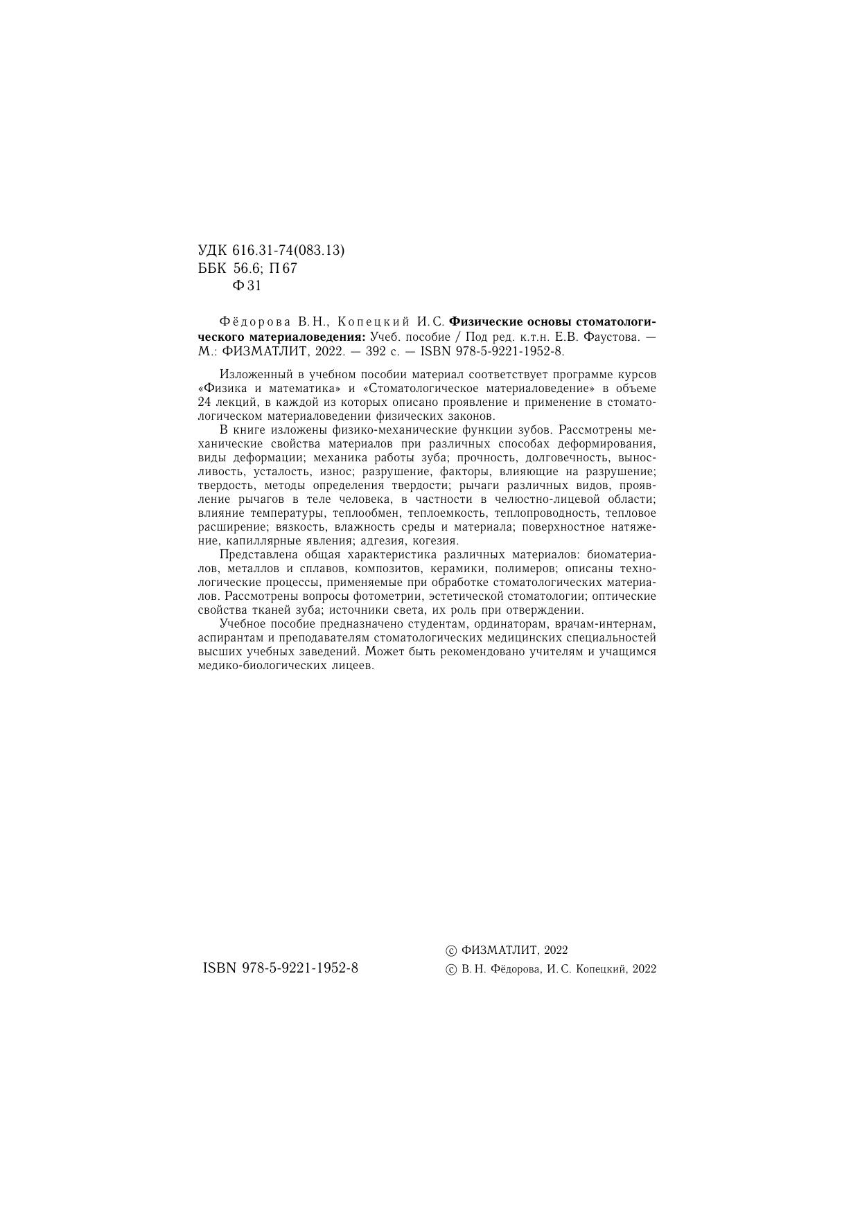 влияние температуры, теплообмен, теплоемкость, теплопроводность, тепловое расширение; вязкость, влажность среды и материала; поверхностное натяжение, капиллярные явления; адгезия, когезия. Представлена общая характеристика различных материалов: биоматериалов, металлов и сплавов, композитов, керамики, полимеров; описаны технологические процессы, применяемые при обработке стоматологических материалов. Рассмотрены вопросы фотометрии, эстетической стоматологии; оптические свойства тканей зуба; источники света, их роль при отверждении. Учебное пособие предназначено студентам, ординаторам, врачам-интернам, аспирантам и преподавателям стоматологических медицинских специальностей высших учебных заведений. Может быть рекомендовано учителям и учащимся медико-биологических лицеев.