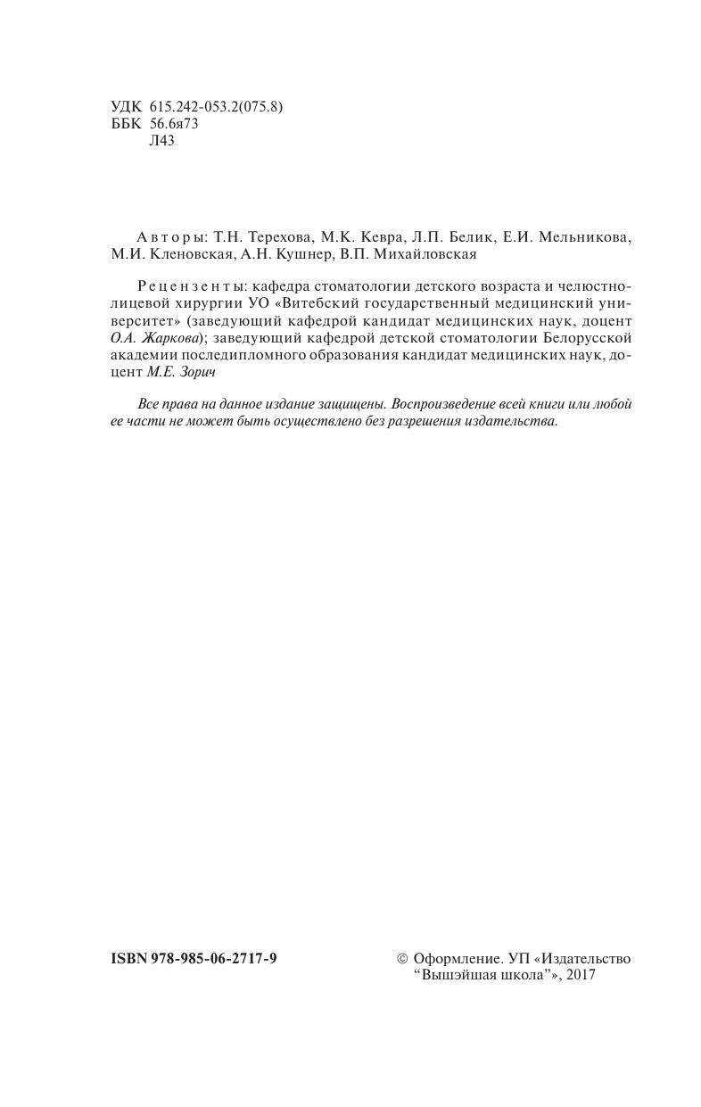 Даны сведения о лекарственных средствах, используемых в работе детского стоматолога для местного обезболивания, профилактики и лечения кариеса зубов и его осложнений, заболеваний маргинального периодонтита, слизистой оболочки полости рта. Для студентов стоматологических факультетов учреждений высшего образования, врачей-интернов.