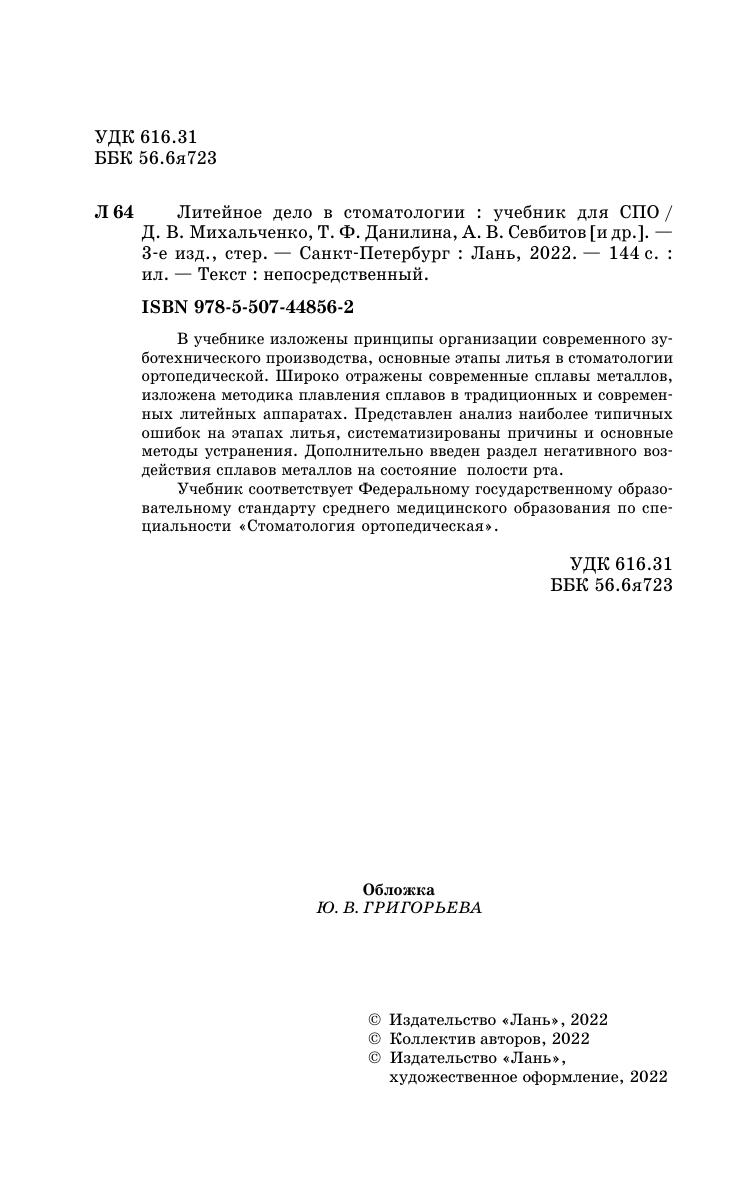 В учебнике изложены принципы организации современного зуботехнического производства, основные этапы литья в стоматологии ортопедической. Широко отражены современные сплавы металлов, изложена методика плавления сплавов в традиционных и современных литейных аппаратах. Представлен анализ наиболее типичных ошибок на этапах литья, систематизированы причины и основные методы устранения. Дополнительно введен раздел негативного воздействия сплавов металлов на состояние полости рта.