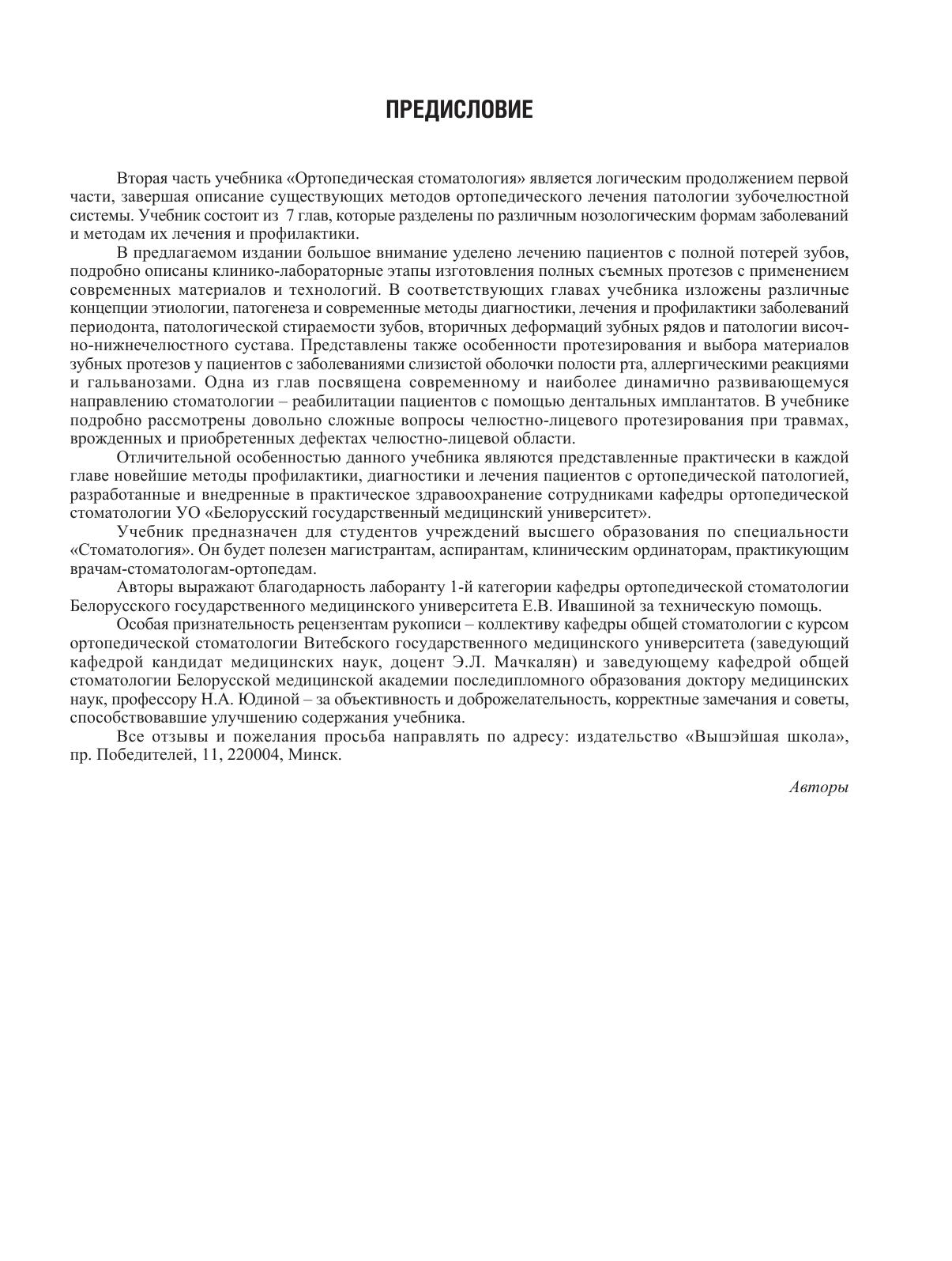 Изложены систематизированные научные знания о профилактике, этиологии, патогенезе и ортопедических методах лечения заболеваний периодонта, полной потери зубов, патологической стираемости, заболеваний височно-нижнечелюстного сустава, аномалий развития, приобретенных дефектов, повреждений, деформаций и функциональных расстройств жевательного аппарата и других органов зубочелюстной системы. Освещены вопросы зубного протезирования при заболеваниях слизистой оболочки полости рта, непереносимости материалов протезов аллергической и гальванической природы. Для студентов учреждений высшего образования по специальности «Стоматология». Будет полезен магистрантам, аспирантам, клиническим ординаторам, практикующим врачам-стоматологам-ортопедам.
