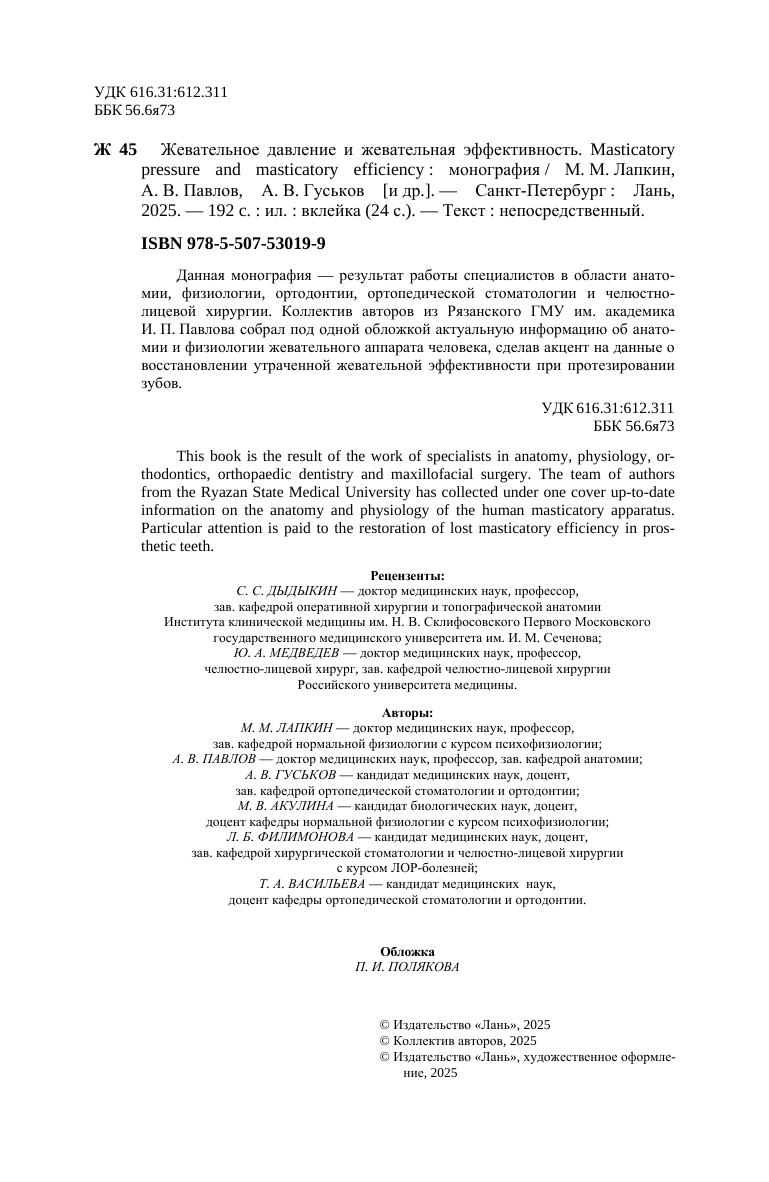 Данная монография — результат работы специалистов в области анатомии, физиологии, ортодонтии, ортопедической стоматологии и челюстно-лицевой хирургии. Коллектив авторов из Рязанского ГМУ им. академика И. П. Павлова собрал под одной обложкой актуальную информацию об анатомии и физиологии жевательного аппарата человека, сделав акцент на данные о восстановлении утраченной жевательной эффективности при протезировании зубов. This book is the result of the work of specialists in anatomy, physiology, orthodontics, orthopaedic dentistry and maxillofacial surgery. The team of authors from the Ryazan State Medical University has collected under one cover up-to-date information on the anatomy and physiology of the human masticatory apparatus. Particular attention is paid to the restoration of lost masticatory efficiency in prosthetic teeth.
