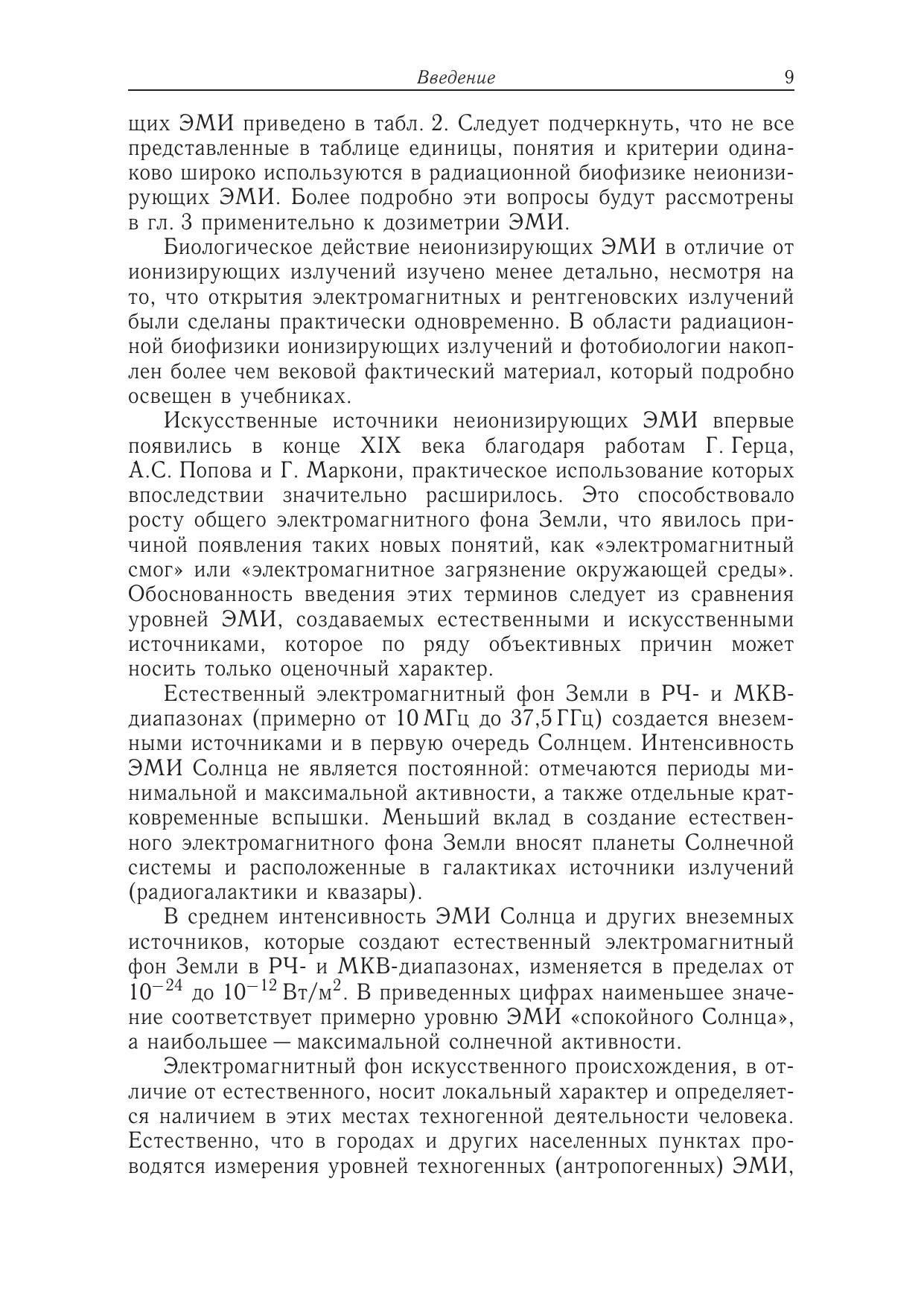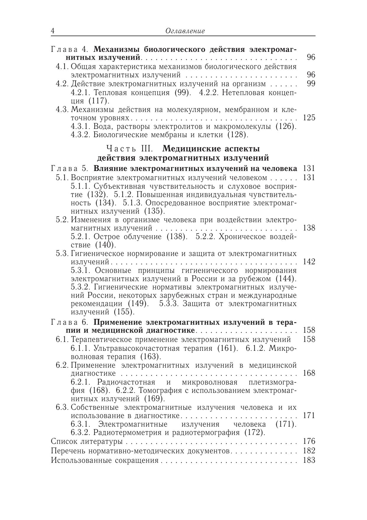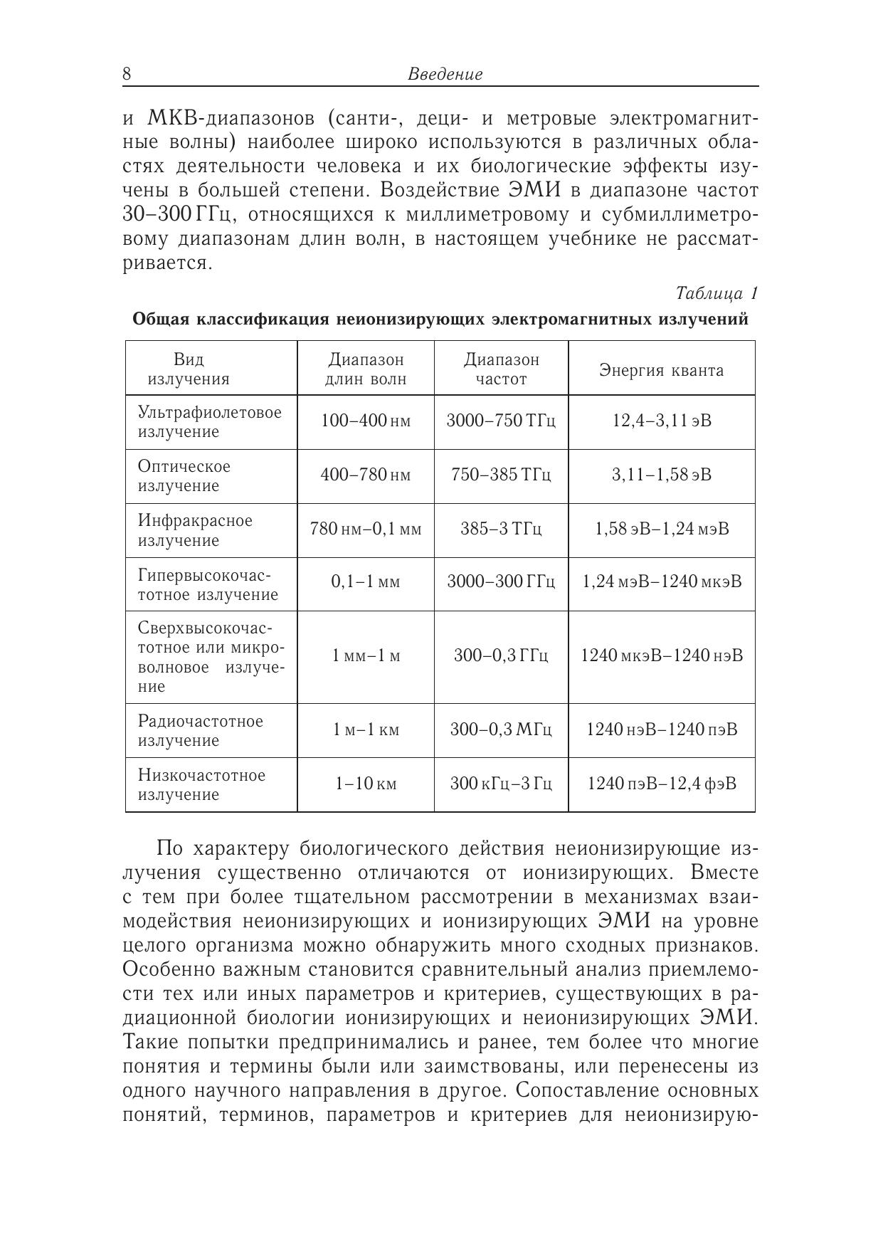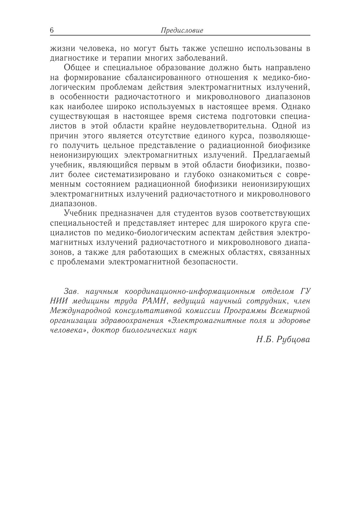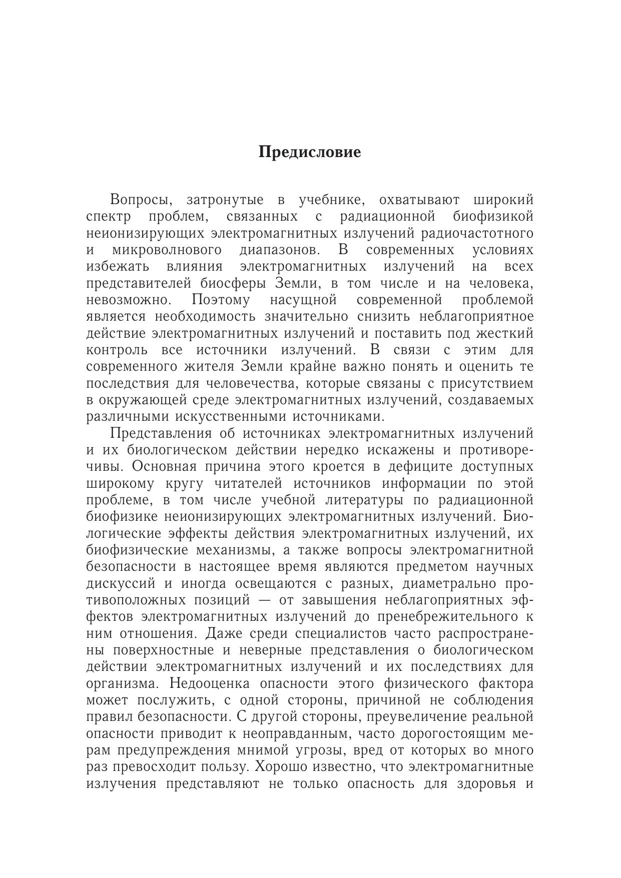 Предлагаемая книга является первой попыткой изложить учебный курс радиационной биофизики неионизирующих электромагнитных излучений (ЭМИ) радиочастотного и микроволнового диапазонов. Учебник состоит из трех логически связанных частей. В первой части приведены основные физические характеристики ЭМИ, классификация излучений, их естественные и техногенные источники. Рассмотрены биофизические закономерности взаимодействия радиочастотных и микроволновых ЭМИ с биологическими объектами. Во второй части изложены особенности поглощения энергии и механизмы биологического действия ЭМИ. Рассмотрены проблемы теоретической и практической дозиметрии, проанализированы механизмы теплового и нетеплового действия ЭМИ. Третья часть посвящена действию ЭМИ на человека, вопросам гигиенического нормирования и способам защиты от излучений. Приведены основные современные направления применения ЭМИ в терапии и медицинской диагностике.