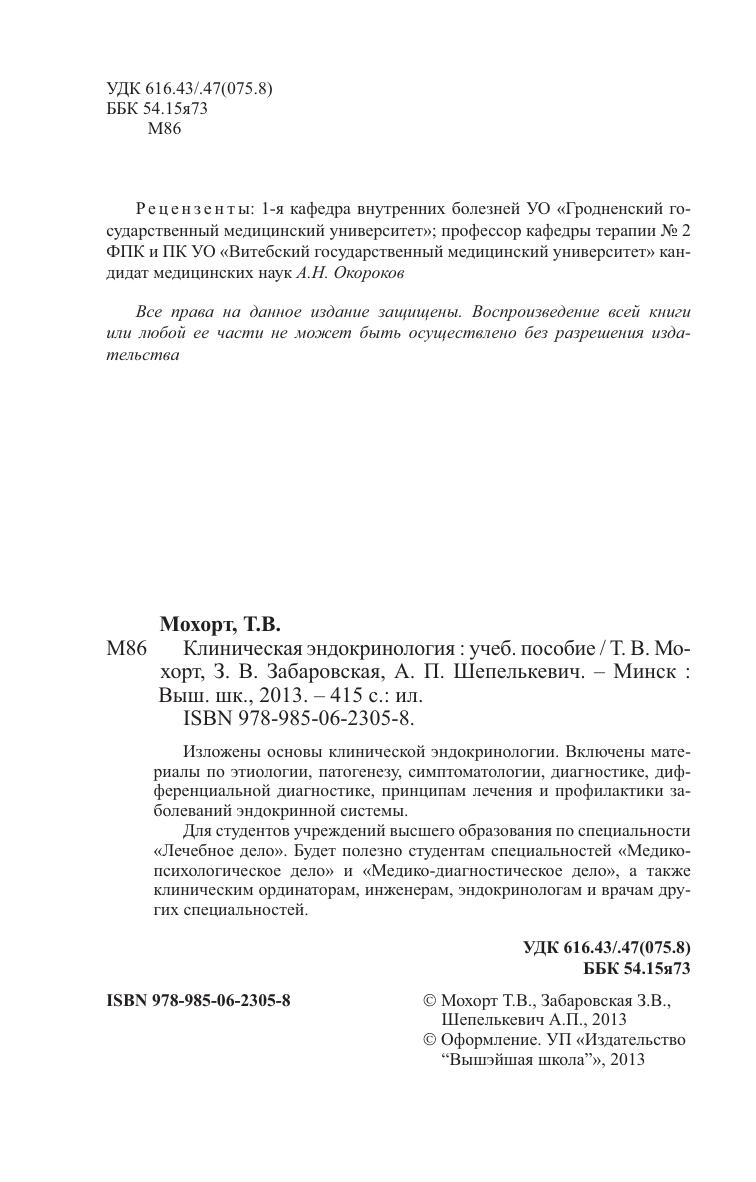 Изложены основы клинической эндокринологии. Включены материалы по этиологии, патогенезу, ситмптоматологии, диагностике, дифференциальной диагностике, принципам лечения и профилактики заболеваний эндокринной системы. Для студентов медицинских вузов по специальности "Лечебное дело". Будет полезно студентам специальностей "Медико-психологическое дело" и "Медико-диагностическое дело", а также клиническим ординаторам, инженерам, эндокринологам и врачам других специальност