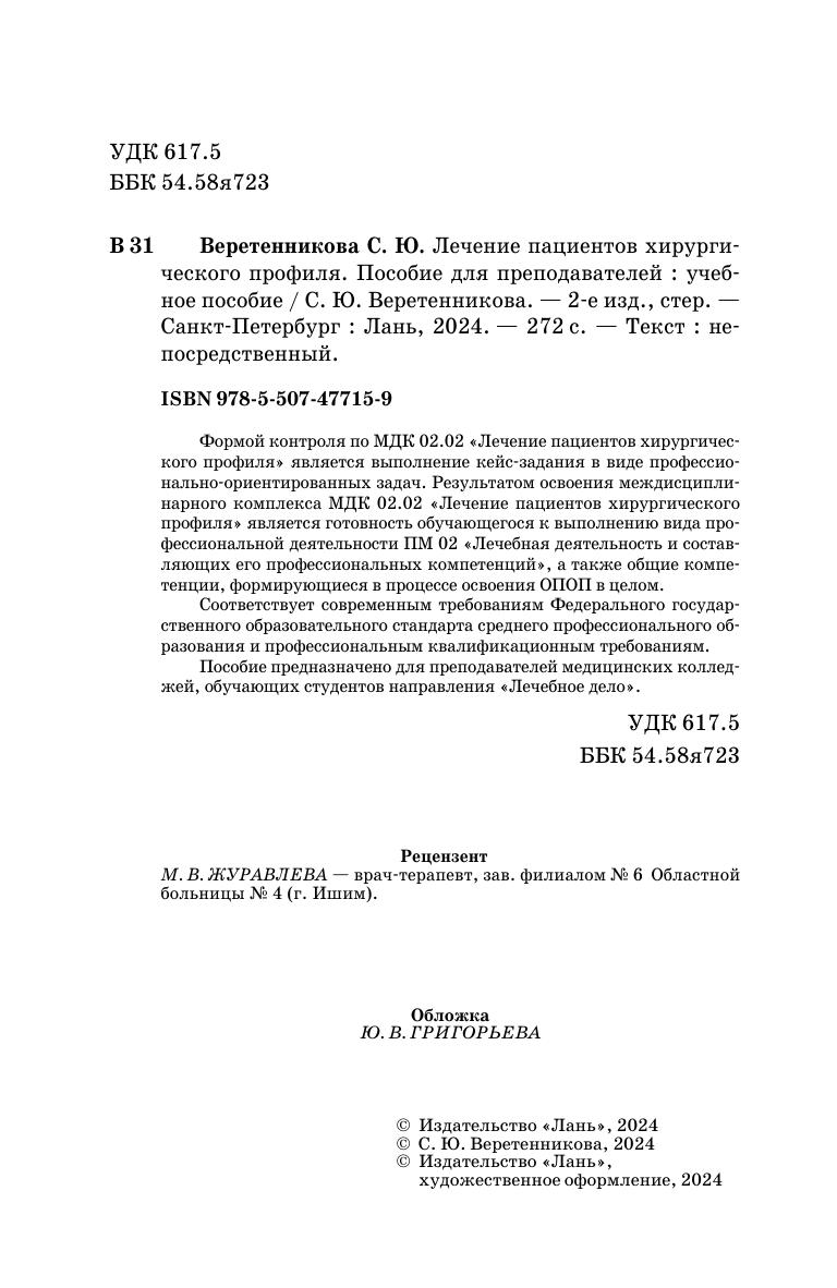 Формой контроля по МДК 02.02 «Лечение пациентов хирургического профиля» является выполнение кейс-задания в виде профессионально-ориентированных задач. Результатом освоения междисциплинарного комплекса МДК 02.02 «Лечение пациентов хирургического профиля» является готовность обучающегося к выполнению вида профессиональной деятельности ПМ 02 «Лечебная деятельность и составляющих его профессиональных компетенций», а также общие компетенции, формирующиеся в процессе освоения ОПОП в целом. Соответствует современным требованиям Федерального государственного образовательного стандарта среднего профессионального образования и профессиональным квалификационным требованиям. Пособие предназначено для преподавателей медицинских колледжей, обучающих студентов направления «Лечебное дело».