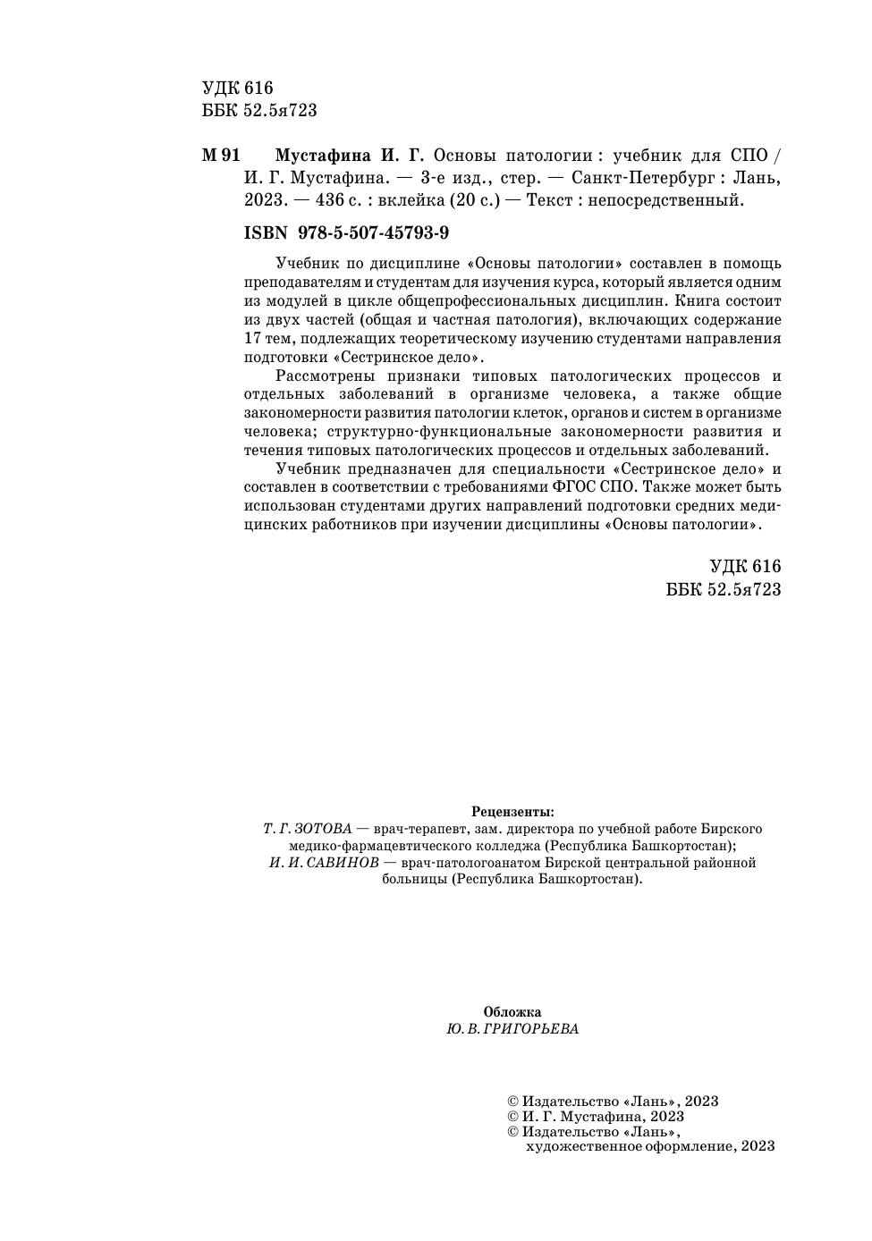 Учебник по дисциплине Основы патологии составлен в помощь преподавателям и студентам для изучения курса, который является одним из модулей в цикле общепрофессиональных дисциплин. Книга состоит из двух частей - общая и частная патология, включающих содержание 17 тем, подлежащих теоретическому изучению студентами направления подготовки Сестринское дело.Рассмотрены признаки типовых патологических процессов и отдельных заболеваний в организме человека, а также общие закономерности развития патологии клеток, органов и систем в организме человека, структурно-функциональные закономерности развития и течения типовых патологических процессов и отдельных заболеваний.Учебник предназначен для специальности «Сестринское дело» и составлен в соответствии с требованиями ФГОС СПО. Также пособие может быть использовано студентами других направлений подготовки средних медицинских работников при изучении дисциплины Основы патологии.