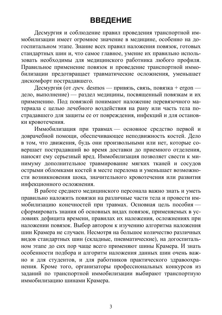 Учебное пособие составлено в соответствии с ФГОС по направлению «Лечебное дело» при изучении темы «Десмургия» в курсах хирургии. Содержит основные сведения о правилах наложения бинтовых повязок, показания и алгоритмы выполнения бинтовых повязок и алгоритм проведения транспортной иммобилизации шинами Крамера, которые в работе среднего медицинского работника на догоспитальном этапе просты в применении и наложение которых не приносит дополнительных болевых ощущений пострадавшему. Пособие предназначено для студентов медицинских колледжей, среднего медицинского персонала лечебно-профилактических учреждений, а также для обучения на курсах повышения квалификации.