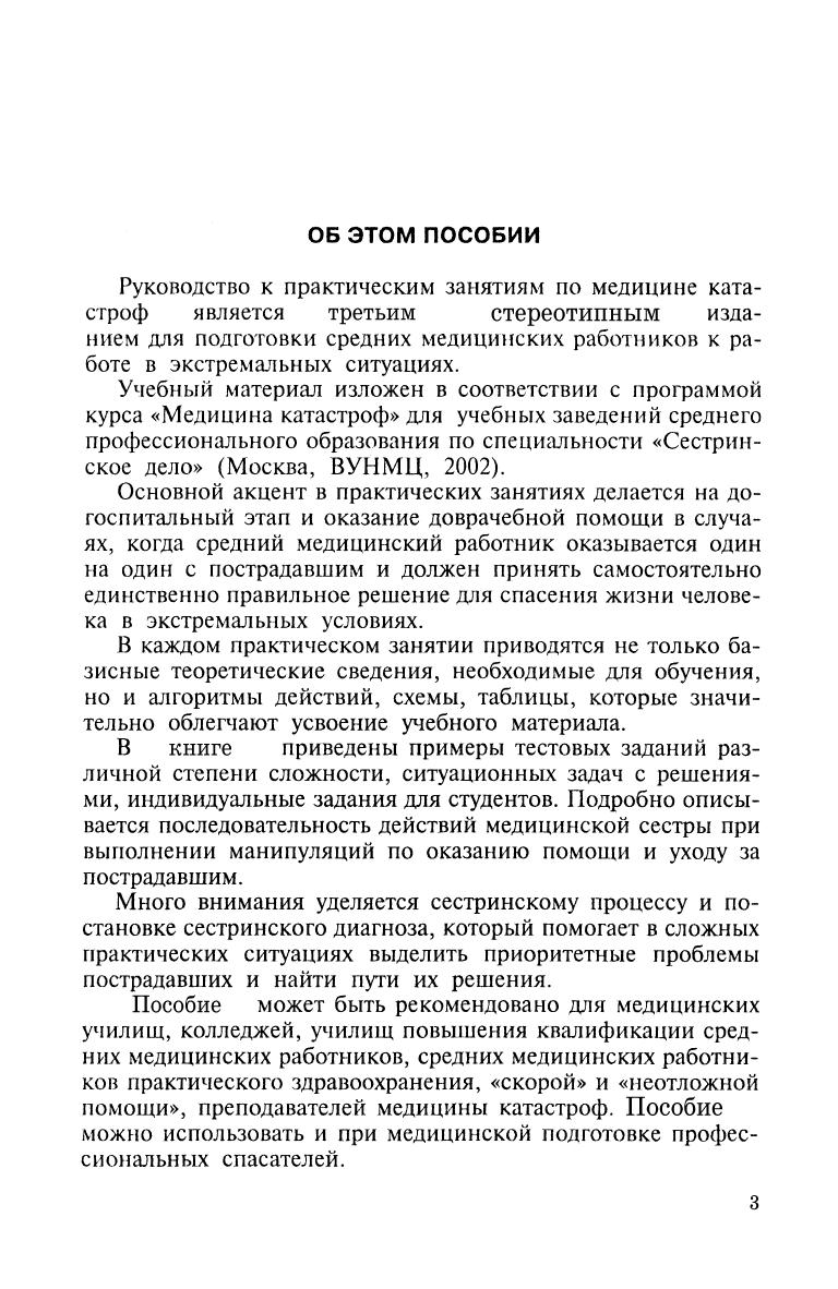 Пособие составлено в соответствии с программой курса «Медицина катастроф» для учебных заведений среднего профессионального образования по специальности «Сестринское дело» и снабжено алгоритмами действий, схемами, таблицами, планами проведения каждого занятия, тестами и ситуационными задачами с ответами для исходного, текущего и итогового контроля уровня знаний. Уделяется внимание сестринскому процессу при оказании помощи пострадавшим.Книга предназначена для студентов медицинских училищ, колледжей, слушателей курсов повышения квалификации средних медицинских работников, для средних медицинских работников практического здравоохранения, скорой и неотложной помощи, преподавателей медицины катастроф, а также может быть использована при медицинской подготовке профессиональных спасателей. Соответствует современным требованиям Федерального государственного образовательного стандарта среднего профессионального образования и профессиональным квалификационным требованиям.