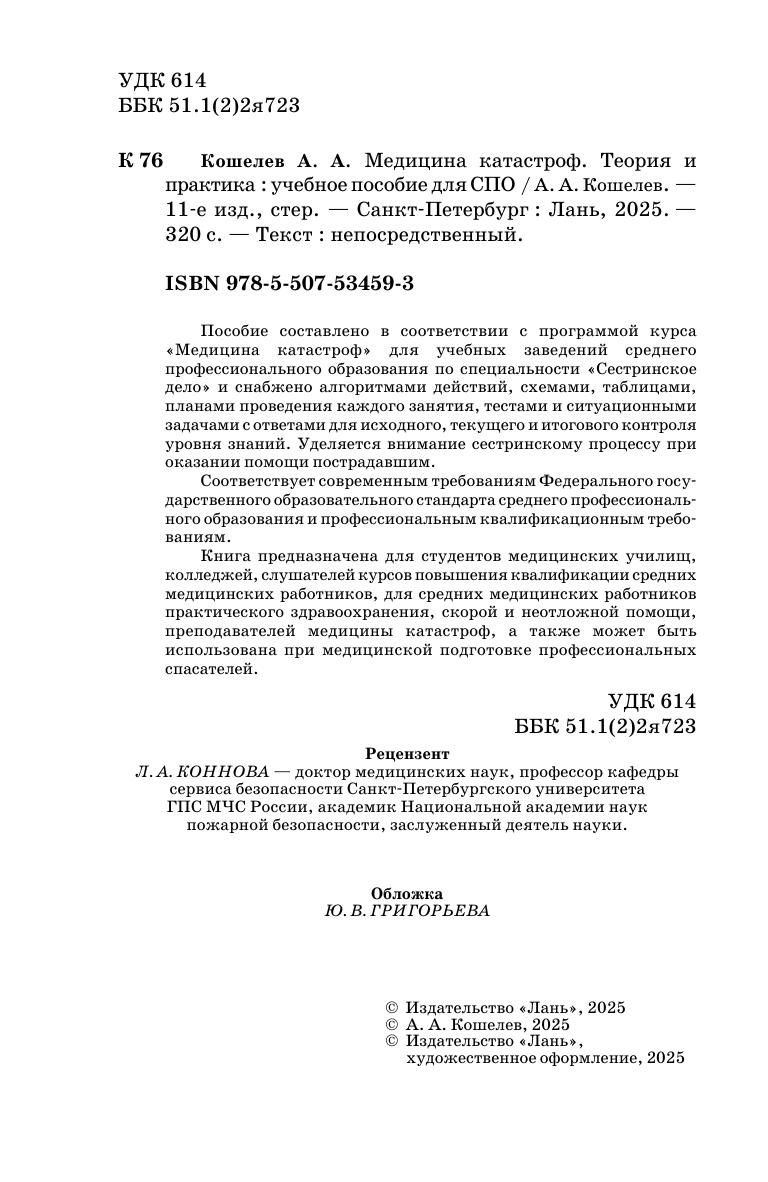 Пособие составлено в соответствии с программой курса «Медицина катастроф» для учебных заведений среднего профессионального образования по специальности «Сестринское дело» и снабжено алгоритмами действий, схемами, таблицами, планами проведения каждого занятия, тестами и ситуационными задачами с ответами для исходного, текущего и итогового контроля уровня знаний. Уделяется внимание сестринскому процессу при оказании помощи пострадавшим. Книга предназначена для студентов медицинских училищ, колледжей, слушателей курсов повышения квалификации средних медицинских работников, для средних медицинских работников практического здравоохранения, скорой и неотложной помощи, преподавателей медицины катастроф, а также может быть использована при медицинской подготовке профессиональных спасателей. Соответствует современным требованиям Федерального государственного образовательного стандарта среднего профессионального образования и профессиональным квалификационным требованиям.