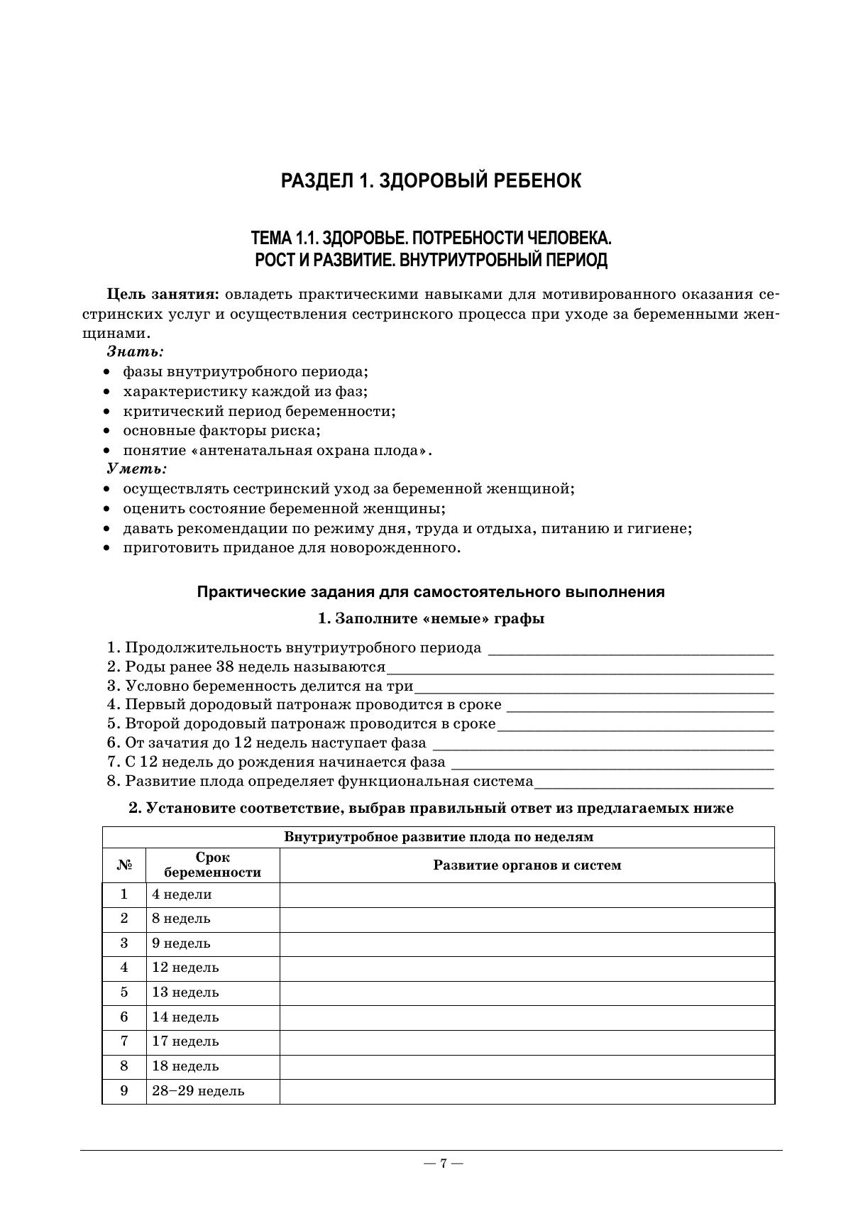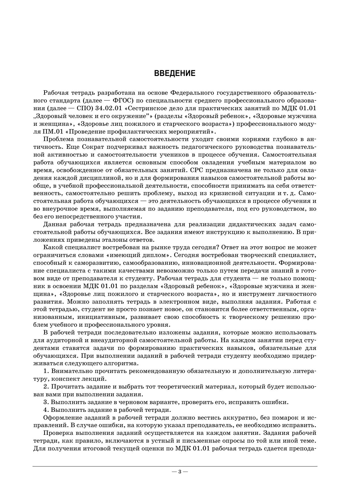 Рабочая тетрадь подготовлена в соответствии с действующим Федеральным государственным образовательным стандартом для студентов среднего профессионального образования по специальности «Сестринское дело» и примерной программой ПМ.01 «Проведение профилактических мероприятий» МДК 01.01 «Здоровый человек и его окружение».Пособие соответствует требованиям ФГОС по профессиональному модулю, перечень компетенций. Каждое практическое занятие содержит разнохарактерные задания для всех его этапов: проверка исходного уровня знаний, актуализация и закрепление учебного материала — вопросы, тестовые задания, ситуационные задачи, творческие задания. Тетрадь включает богатый иллюстративный материал, таблицы, схемы, эталоны ответов к заданиям.Издание предназначено для студентов медицинских училищ и колледжей.