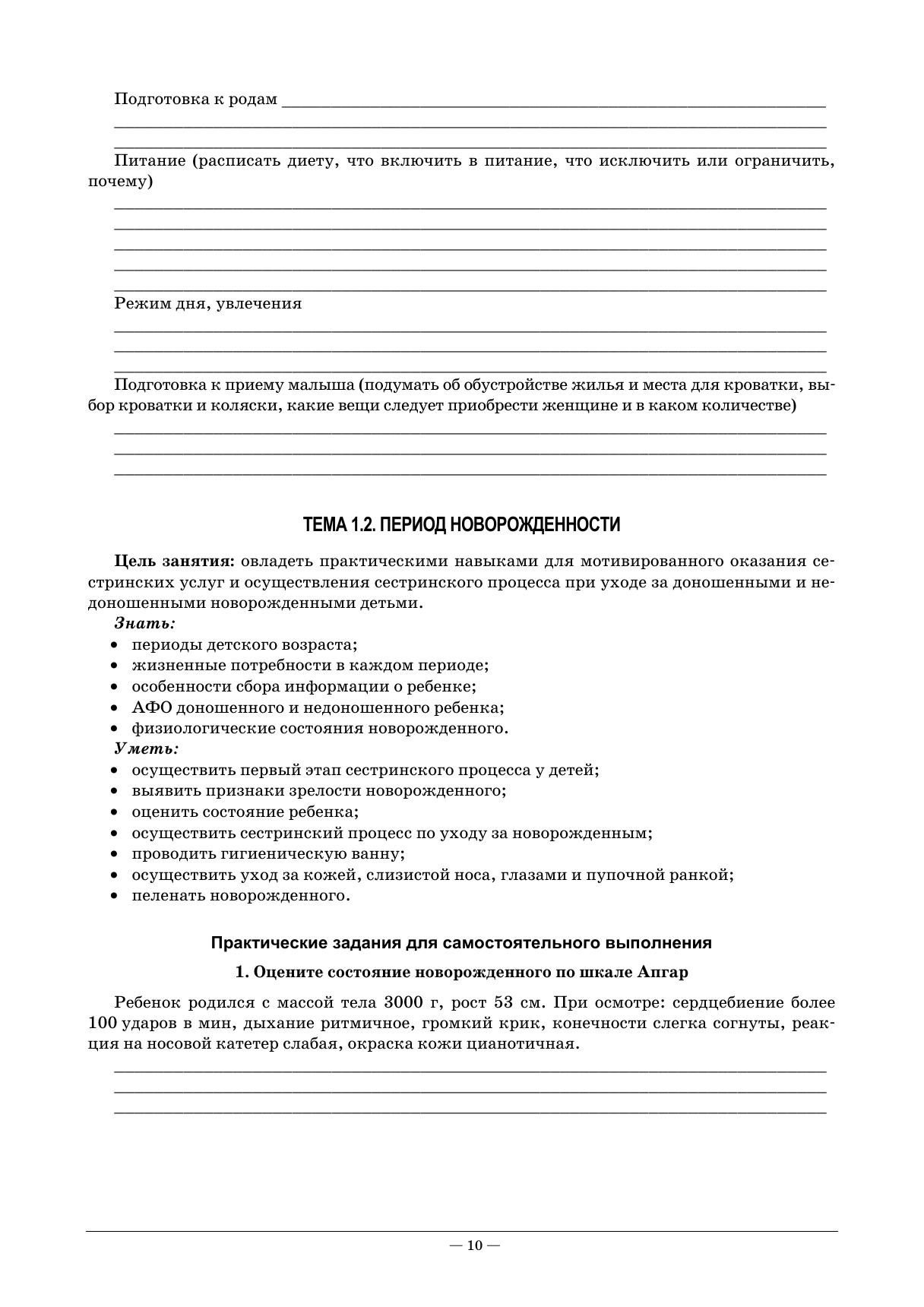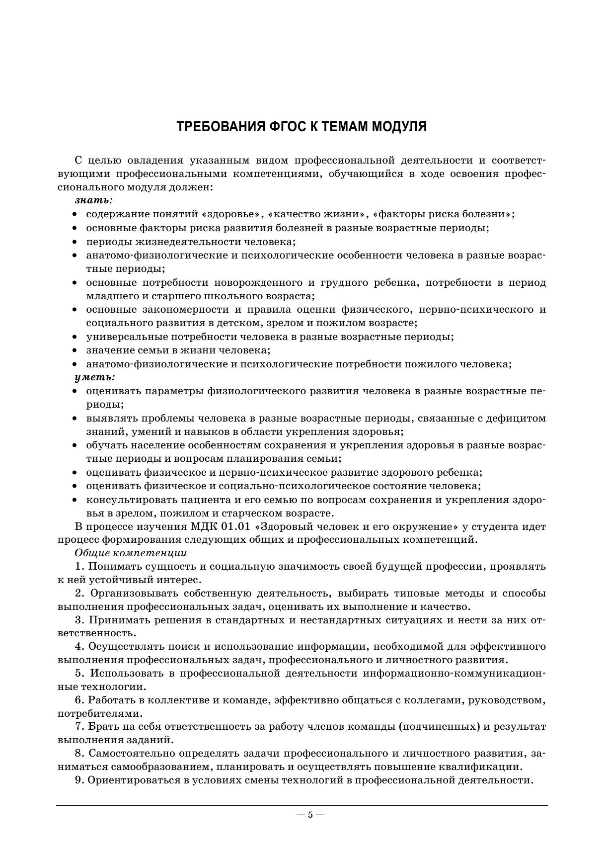 Рабочая тетрадь подготовлена в соответствии с действующим Федеральным государственным образовательным стандартом для студентов среднего профессионального образования по специальности «Сестринское дело» и примерной программой ПМ.01 «Проведение профилактических мероприятий» МДК 01.01 «Здоровый человек и его окружение». Пособие соответствует требованиям ФГОС по профессиональному модулю, перечень компетенций. Каждое практическое занятие содержит разнохарактерные задания для всех его этапов: проверка исходного уровня знаний, актуализация и закрепление учебного материала — вопросы, тестовые задания, ситуационные задачи, творческие задания. Тетрадь включает богатый иллюстративный материал, таблицы, схемы, эталоны ответов к заданиям. Издание предназначено для студентов медицинских училищ и колледжей.