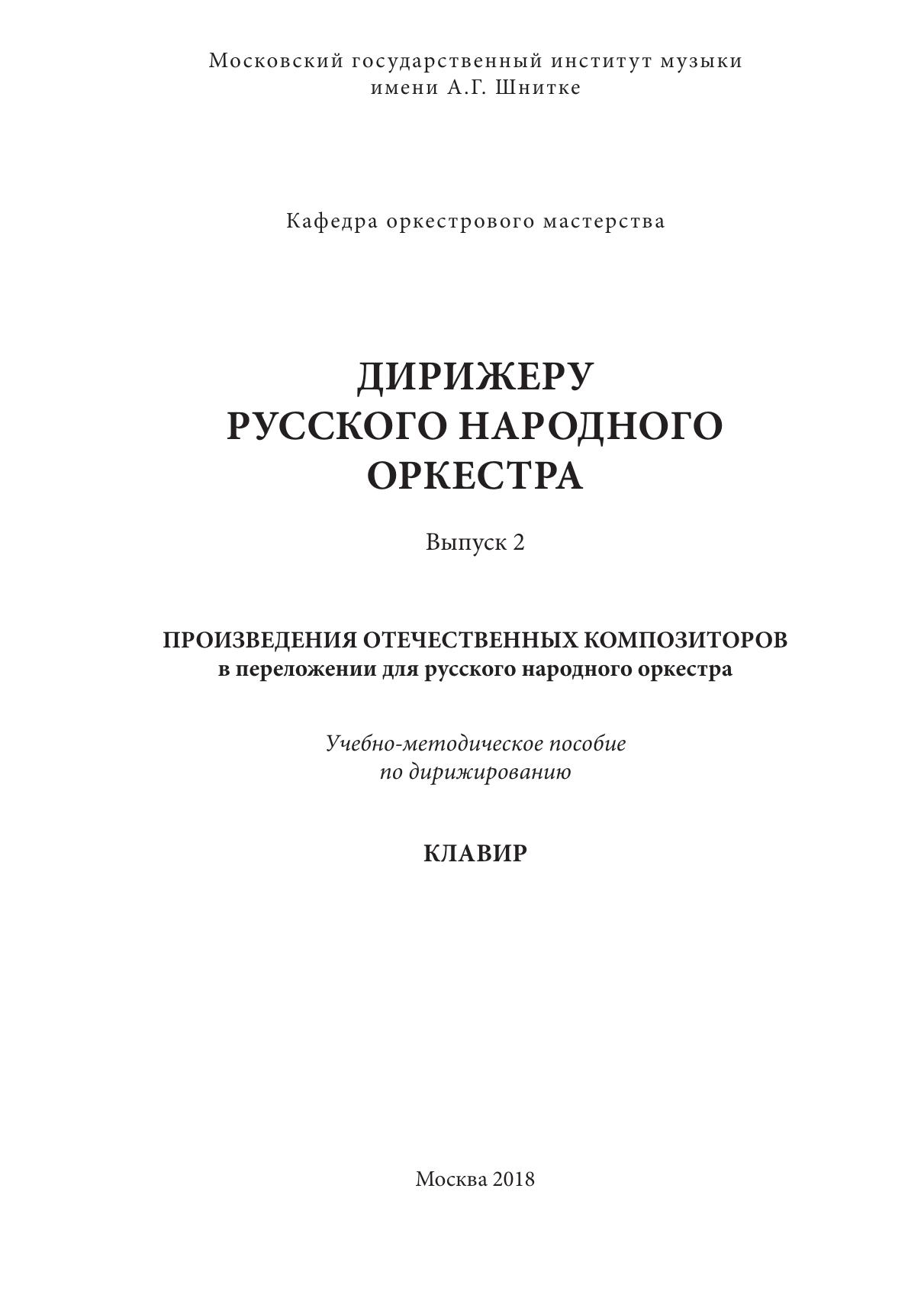 Учебно-методическое пособие «Дирижеру русского народного оркестра», созданное преподавателямии кафедры оркестрового мастерства МГИМ им. А. Г. Шнитке предназначено студентам специальности 53.02.03 «Инструментальное исполнительство», обучающимся в классе оркестрового дирижирования. Учебно-методическое пособие состоит из партитур и клавиров. Первый выпуск «Дирижеру русского народного оркестра», вышедший в издательстве «Согласие» в 2016 году, посвящен изучению произведений с переменными размерами. Во втором выпуске представлены отечественные композиторы XIX-XX века: П. И. Чайковский, С. В. Рахманинов, Р. М. Глиэр, А. Т. Гречанинов, С. Н. Василенко, В. Я. Шебалин, С. С. Прокофьев, А. Г. Шнитке. Содержание составили различные по стилю и жанру фортепианные и симфонические произведения, которые в русском народном оркестре приобретают новое звучание. Инструментовки для оркестра и переложения для фортепиано выполнили преподаватели кафедры оркестрового мастерства МГИМ им. А. Г. Шнитке. Произведения отличаются сложностью музыкально-исполнительских и технических задач, поэтому изучаются на разных этапах обучения дирижированию. Клавир предназначен для занятий студентов с концертмейстером в дирижерском классе. Учебно-методическое пособие содержит комментарии с краткими сведениями о композиторах, музыкально-теоретическим разбором произведений и рекомендациями для самостоятельной работы студента.