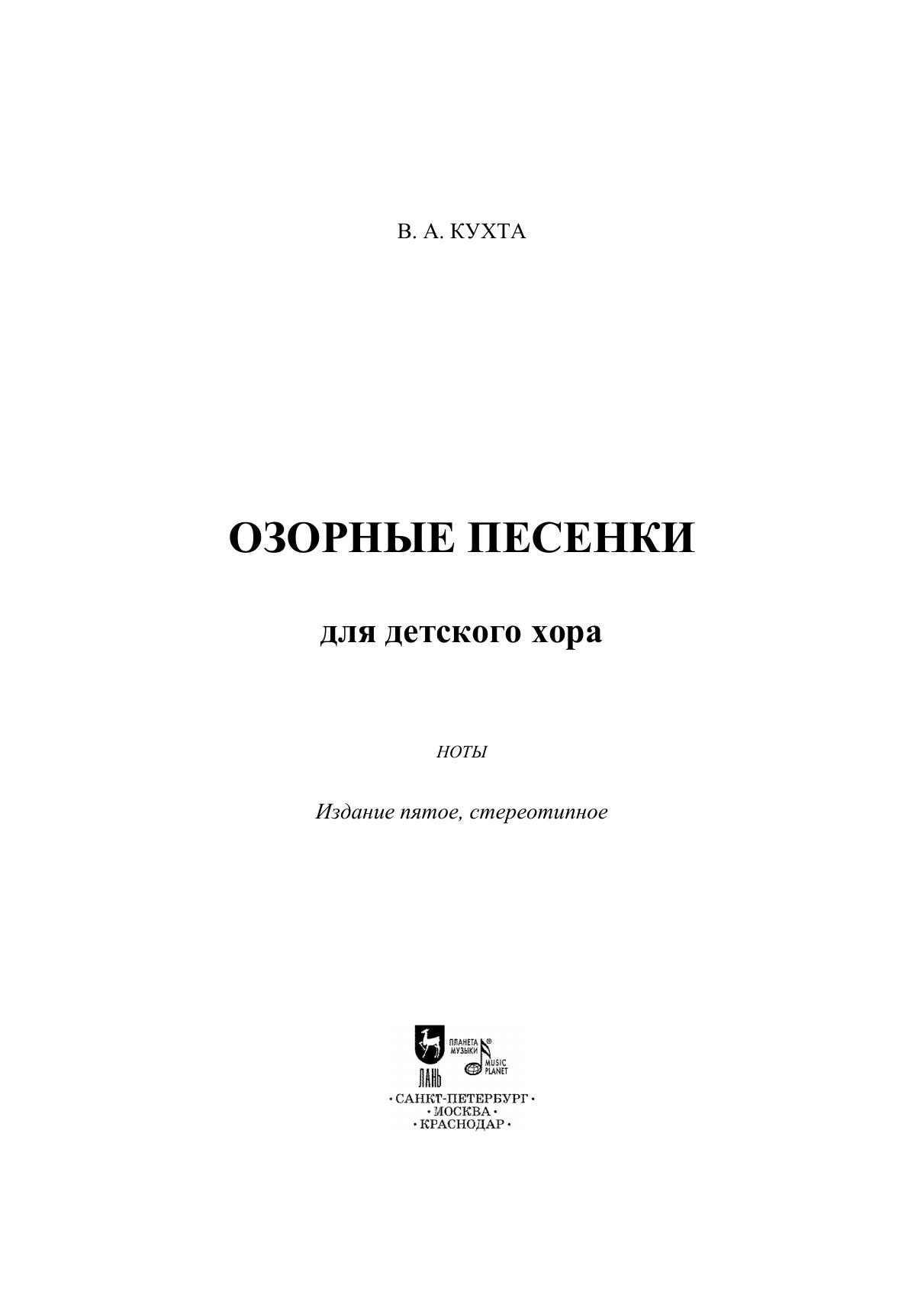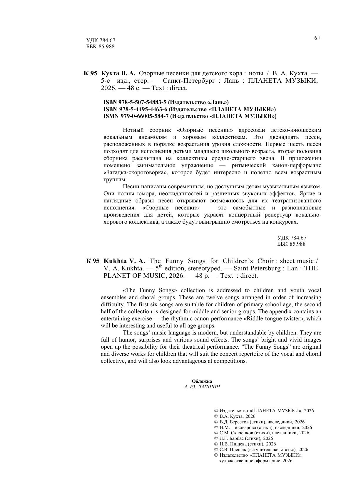 Нотный сборник «Озорные песенки» адресован детско-юношеским вокальным ансамблям и хоровым коллективам. Это двенадцать песен, расположенных в порядке возрастания уровня сложности. Первые шесть песен подходят для исполнения детьми младшего школьного возраста, вторая половина сборника рассчитана на коллективы средне-старшего звена. В приложении помещено занимательное упражнение – ритмический канон-перформанс «Загадка-скороговорка», которое будет интересно и полезно всем возрастным группам. Песни написаны современным, но доступным детям, музыкальным языком. Они полны юмора, неожиданностей и различных звуковых эффектов. Яркие и наглядные образы песен открывают возможность для их театрализованного исполнения. «Озорные песенки» – это самобытные и разноплановые произведения для детей, которые украсят концертный репертуар вокально-хорового коллектива, а также будут выигрышно смотреться на конкурсах. "The Funny Songs" collection is addressed to children and youth vocal ensembles and choral groups. These are twelve songs arranged in order of increasing difficulty. The first six songs are suitable for children of primary school age, the second half of the collection is designed for middle and senior groups. The appendix contains an entertaining exercise – the rhythmic canon-performance "Riddle-tongue twister", which will be interesting and useful to all age groups. The songs’ music language is modern, but understandable by children. They are full of humor, surprises and various sound effects. The songs’ bright and vivid images open up the possibility for their theatrical performance. “The Funny Songs” are original and diverse works for children that will suit the concert repertoire of the vocal and choral collective, and will also look advantageous at competitions.