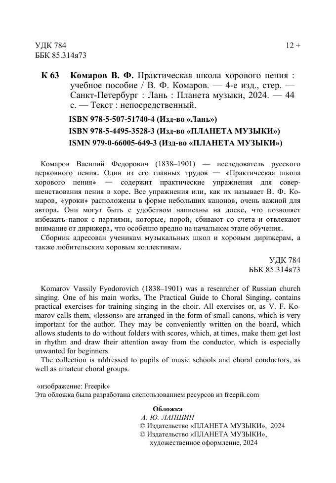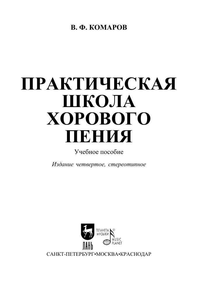Комаров Василий Федорович (1838–1901) — исследователь русского церковного пения. Один из его главных трудов — «Практическая школа хорового пения» — содержит практические упражнения для совершенствования пения в хоре. Все упражнения или, как их называет В. Ф. Комаров, «уроки» расположены в форме небольших канонов , очень важной для автора. Они могут быть с удобством написаны на доске, что позволяет избежать папок с партиями, которые, порой, сбивают со счета и отвлекают внимание от дирижера, что особенно вредно на начальном этапе обучения. Сборник адресован ученикам музыкальных школ и хоровым дирижерам, а также любительским хоровым коллективам. Komarov Vassily Fyodorovich (1838–1901) was a researcher of Russian church singing. One of his main works, The Practical Guide to Choral Singing, contains practical exercises for training singing in the choir. All exercises or, as V. F. Ko-marov calls them, «lessons» are arranged in the form of small canons, which is very important for the author. They may be conveniently written on the board, which allows students to do without folders with scores, which, at times, make them get lost in rhythm and draw their attention away from the conductor, which is especially unwanted for beginners. The collection is addressed to pupils of music schools and choral conductors, as well as amateur choral groups.