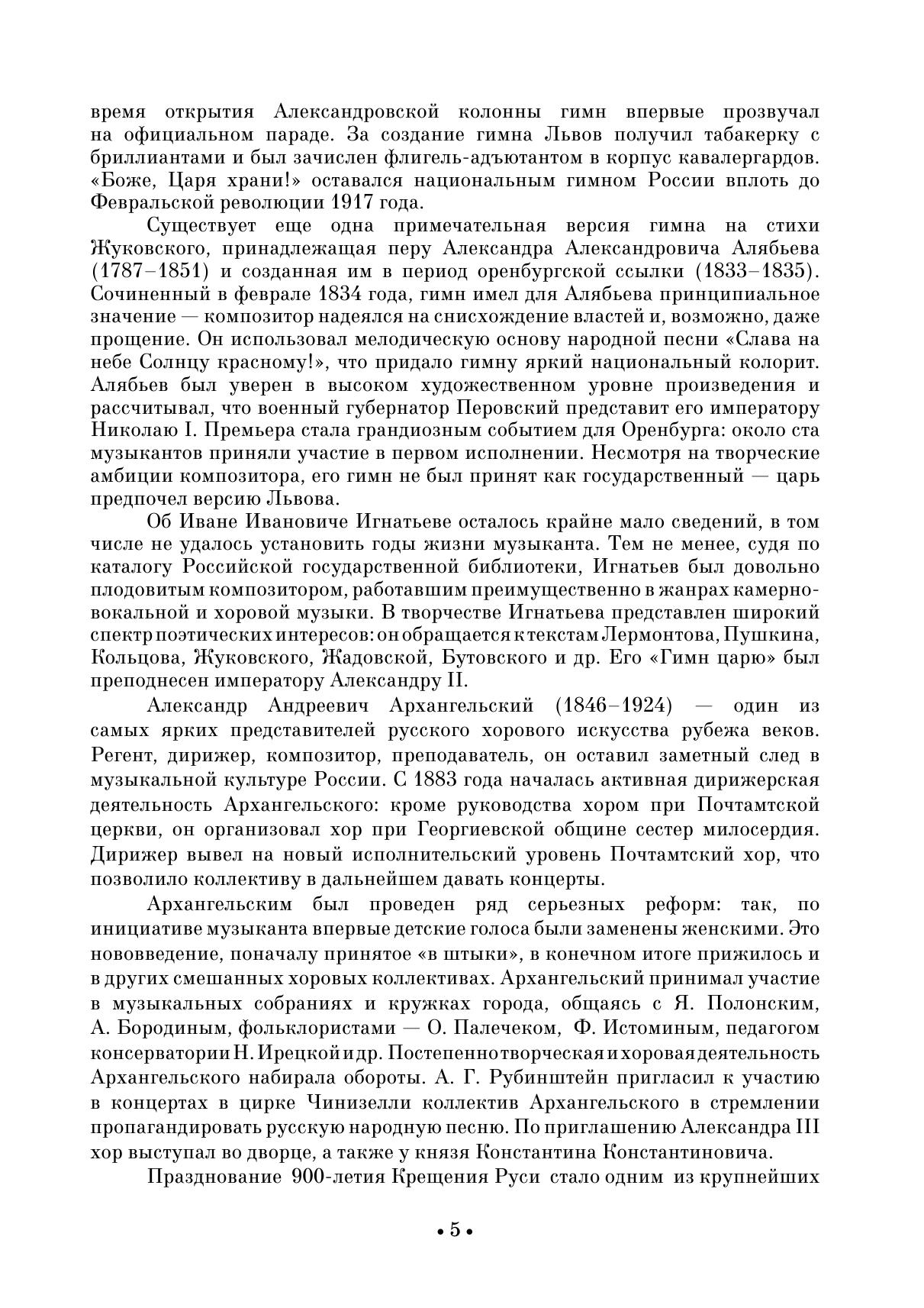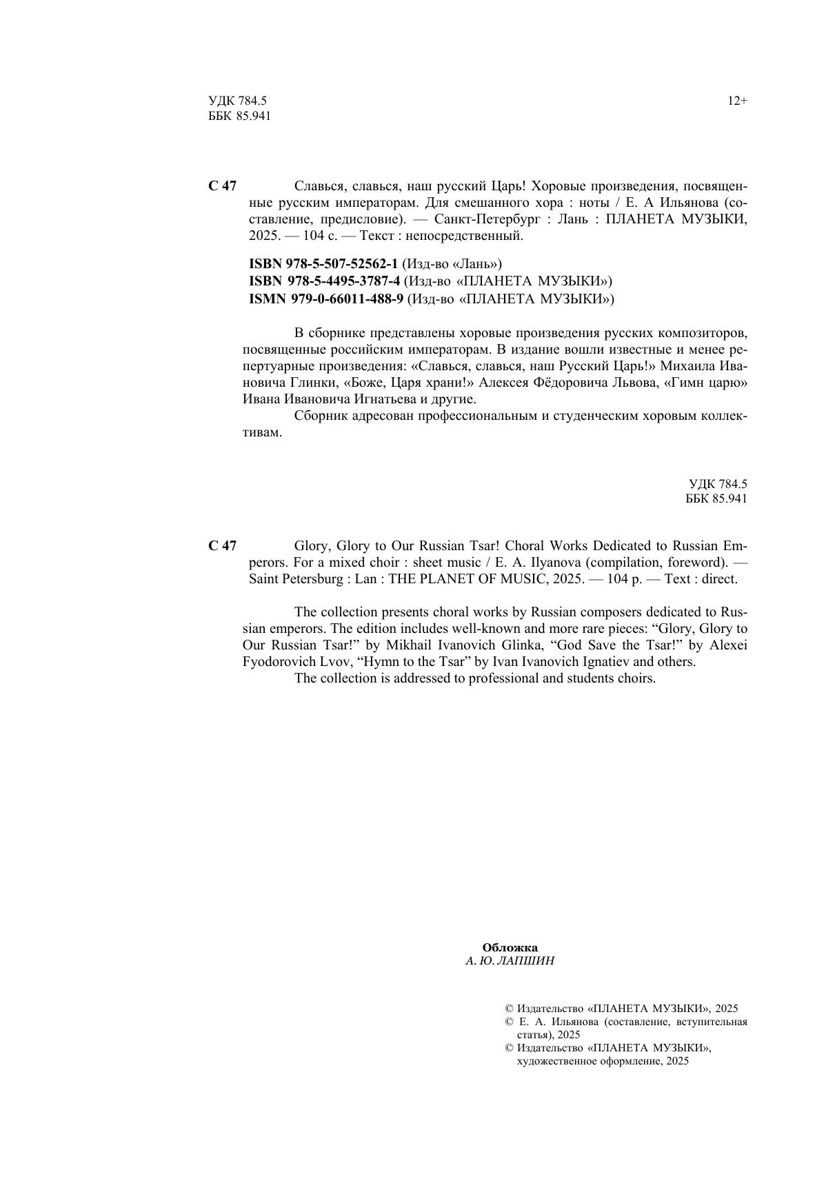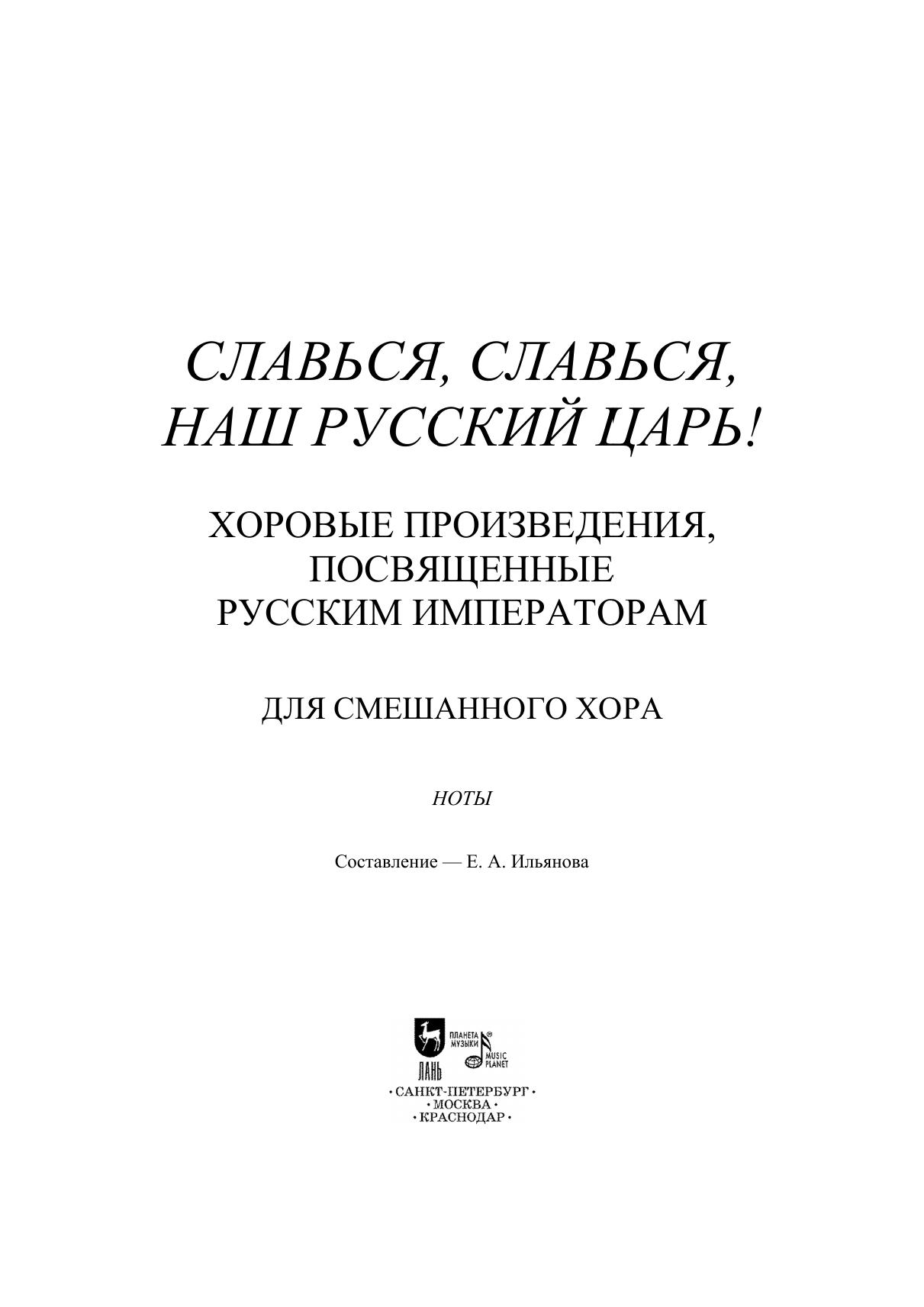 В сборнике представлены хоровые произведения русских композиторов, посвящённые российским императорам. В издание вошли известные и менее репертуарные произведения: «Славься, славься, наш Русский Царь!» Михаила Ивановича Глинки, «Боже, Царя храни!» Алексея Фёдоровича Львова, «Гимн царю» Ивана Ивановича Игнатьева и другие. Сборник адресован профессиональным и студенческим хоровым коллективам. The collection presents choral works by Russian composers dedicated to Russian emperors. The edition includes well-known and more rare pieces: “Glory, Glory to Our Russian Tsar!” by Mikhail Ivanovich Glinka, “God Save the Tsar!” by Alexei Fyodorovich Lvov, “Hymn to the Tsar” by Ivan Ivanovich Ignatiev and others. The collection is addressed to professional and students choirs.