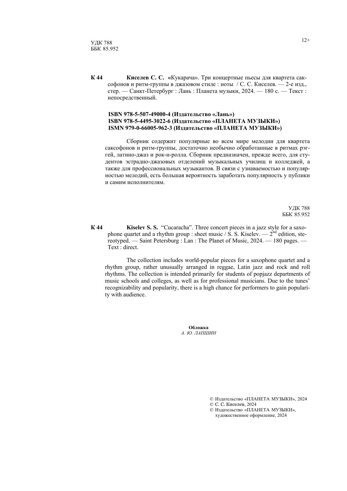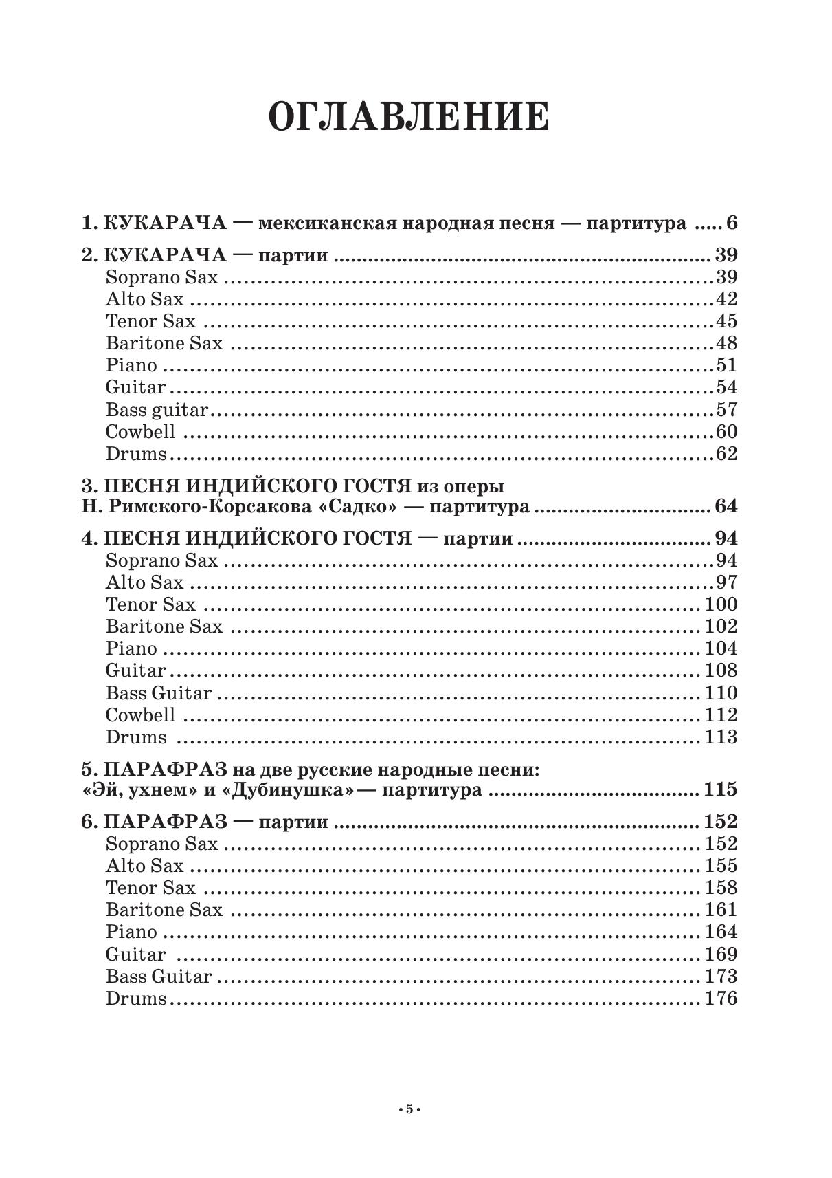 Сборник содержит достаточно необычно обработанные в ритмах рэггей, латино-джаз и рок-н-ролла популярные во всем мире мелодии для квартета саксофонов и ритм-группы. Он, прежде всего предназначен для студентов музыкальных училищ и колледжей, имеющих эстрадно-джазовые отделения, а также для профессиональных музыкантов. В связи с общеизвестной узнаваемостью и популярностью мелодий, есть большая вероятность заработать популярность у публики и самим исполнителям. Желаю успеха.