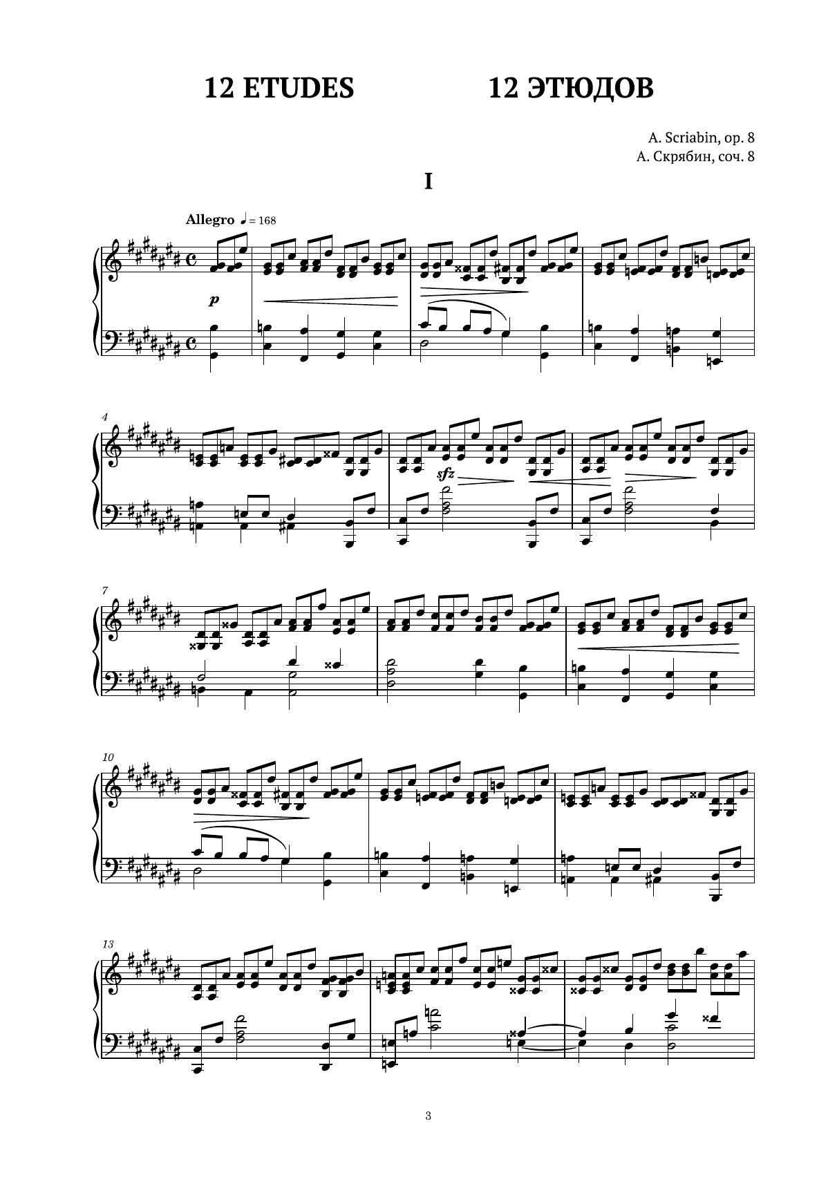 Фортепианные этюды Скрябина, наряду с этюдами Листа, Шопена, Сен-Санса и др., сочетают инструктивное значение с глубоким музыкальным содержанием. Круг образов цикла из 12 этюдов ор. 8 (1894—1895 гг.) разнообразен: лирически взволнованный этюд № 2, тревожно-напряженный № 7, драматический № 9, виртуозный № 10, скорбный № 11. Цикл адресован пианистам различной профессиональной подготовки от учеников старших классов ДМШ до концертирующих пианистов.