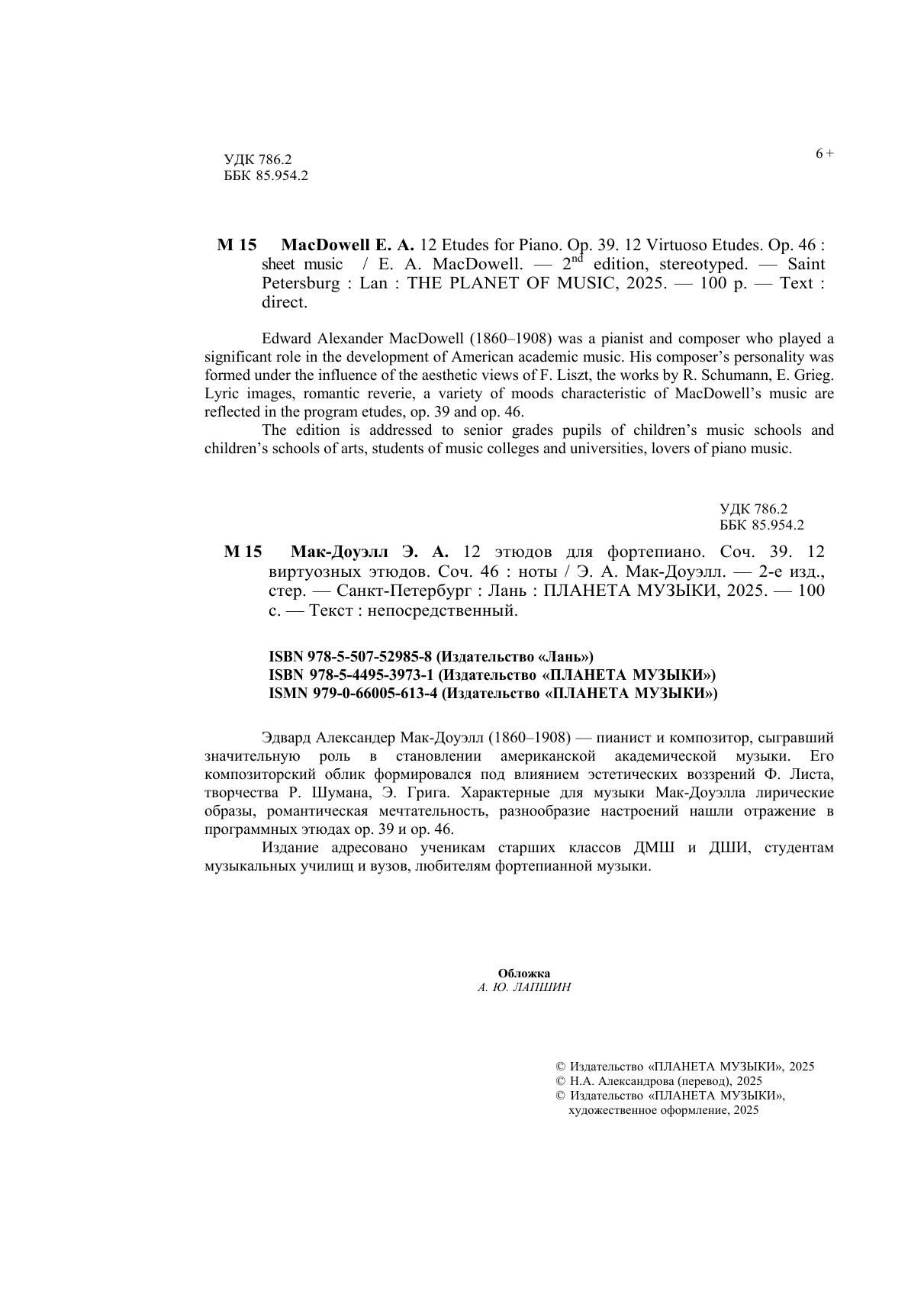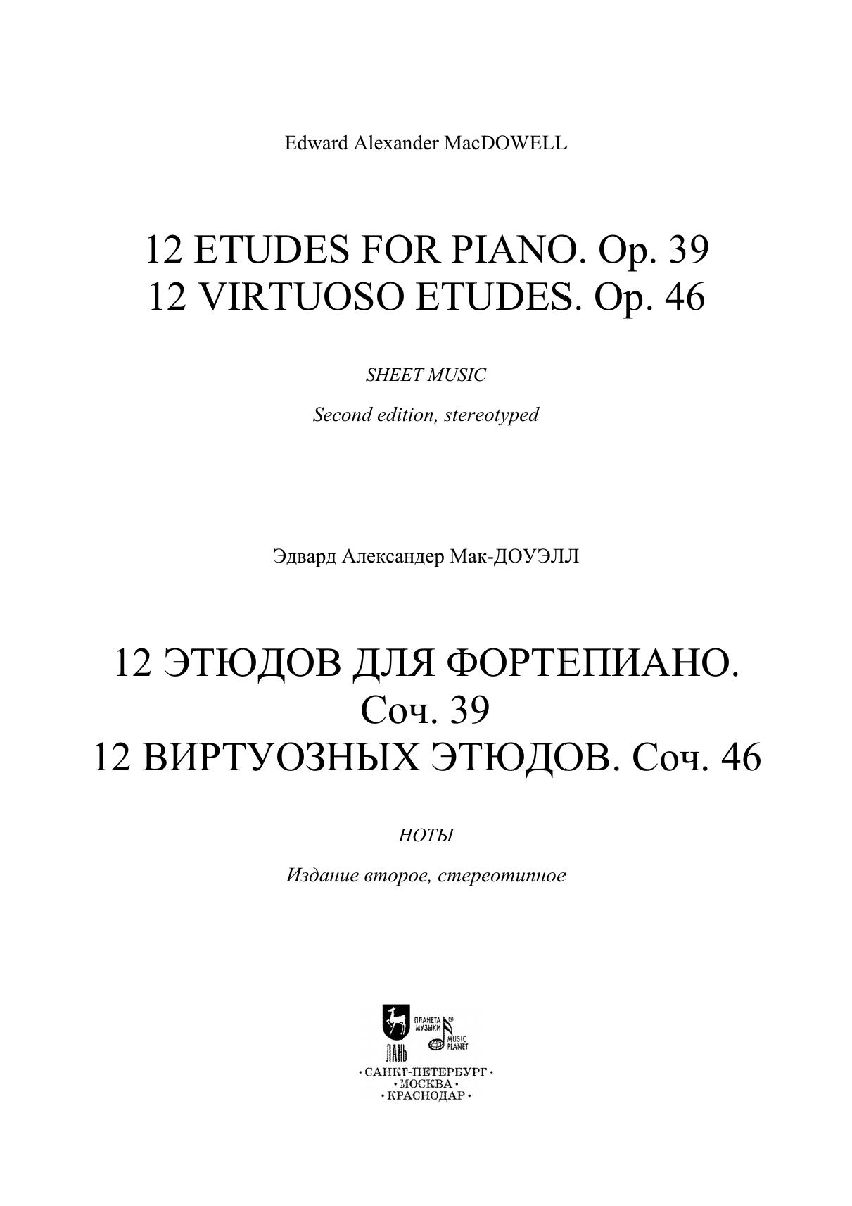 Эдуард Александер Мак-Доуэлл (1860-1908) — пианист и композитор, сыгравший значительную роль в становлении американской академической музыки. Его композиторский облик формировался под влиянием эстетических воззрений Ф. Листа, творчества Р. Шумана, Э. Грига. Характерные для музыки Мак-Доуэлла лирические образы, романтическая мечтательность, разнообразие настроений нашли отражение в программных этюдах ор. 39 и ор. 46. Издание адресовано ученикам старших классов ДМШ и ДШИ, студентам музыкальных училищ и вузов, любителям фортепианной музыки.