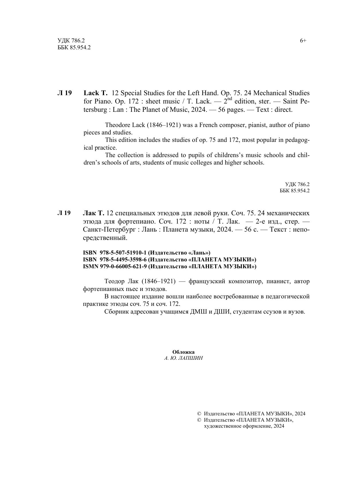 Теодор Лак (1846—1921) — французский композитор, пианист, автор фортепианных пьес и этюдов. В настоящее издание вошли наиболее востребованные в педагогической практике этюды соч. 75 и соч. 172. Сборник адресован учащимся ДМШ и ДШИ, студентам ссузов и вузов.