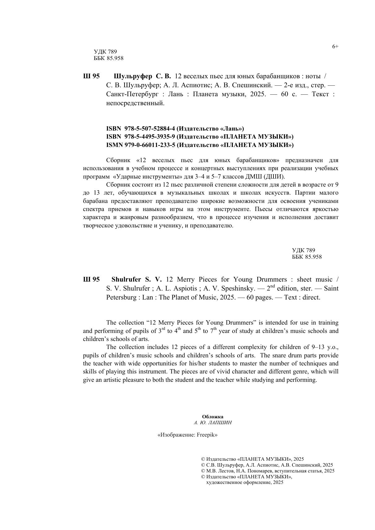 Сборник "12 веселых пьес для юных барабанщиков" предназначен для использования в учебном процессе и концертных выступлениях при реализации учебных программ «Ударные инструменты» для 3-4 и 5-7 классов ДМШ (ДШИ). Сборник состоит из 12 пьес различной степени сложности для детей в возрасте от 9 до 13 лет, обучающихся в музыкальных школах и школах искусств. Партии малого барабана предоставляют преподавателю широкие возможности для освоения учениками спектра приемов и навыков игры на этом инструменте. Пьесы отличаются яркостью характера и жанровым разнообразием, что в процессе изучения и исполнения доставит творческое удовольствие и ученику, и преподавателю. The collection “12 Merry Pieces for Young Drummers” is intended for use in training and performing of pupils of 3rd to 4th and 5th to 7th year of study at children’s music schools and children’s schools of arts. The collection includes 12 pieces of a different complexity for children of 9–13 y.o., pupils of children’s music schools and children’s schools of arts. The snare drum parts provide the teacher with wide opportunities for his/her students to master the number of techniques and skills of playing this instrument. The pieces are of vivid character and different genre, which will give an artistic pleasure to both the student and the teacher while studying and performing.