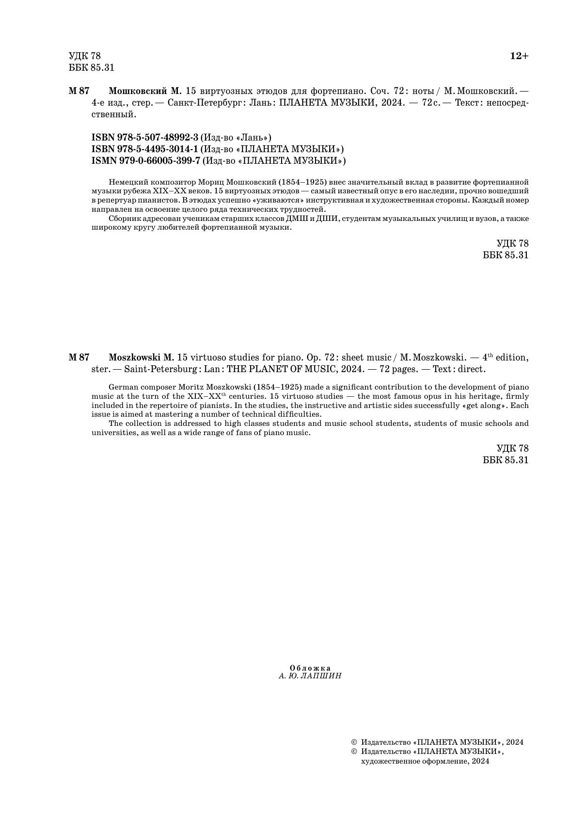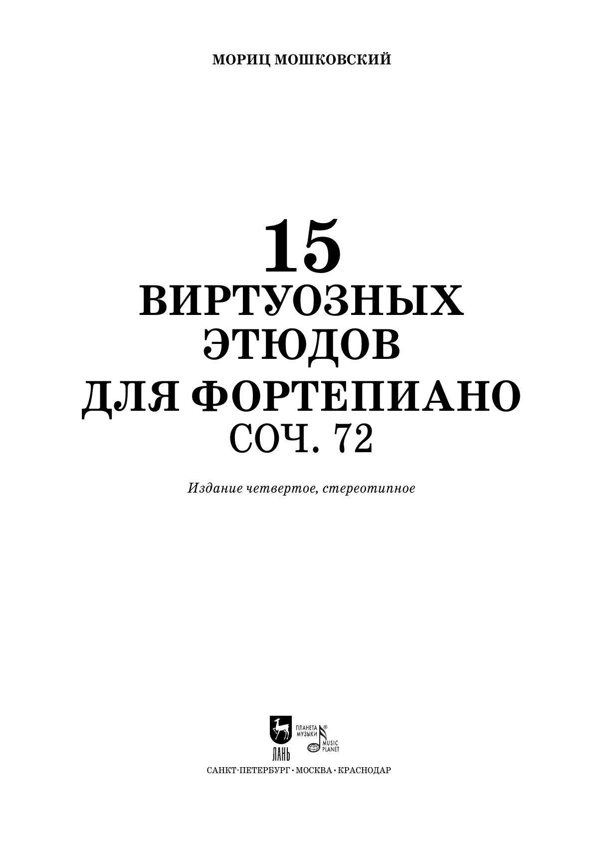 Немецкий композитор Мориц Мошковский (1854–1925) внес значительный вклад в развитие фортепианной музыки рубежа XIX–XX веков. 15 виртуозных этюдов — самый известный опус в его наследии, прочно вошедший в репертуар пианистов. В этюдах успешно «уживаются» инструктивная и художественная стороны. Каждый номер направлен на освоение целого ряда технических трудностей. Сборник адресован ученикам старших классов ДМШ и ДШИ, студентам музыкальных училищ и вузов, а также широкому кругу любителей фортепианной музыки.