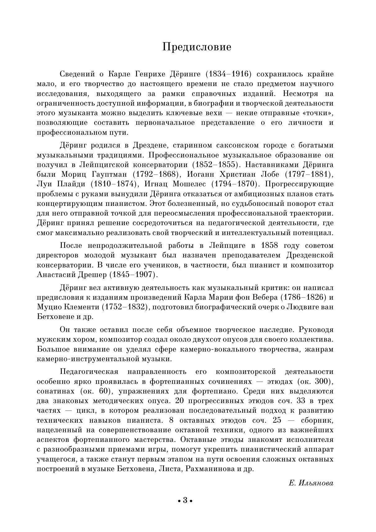 В наследии немецкого композитора Карла Генриха Дёринга (1834–1916) значительную часть занимают вокальные и хоровые сочинения, а также этюды и упражнения для фортепиано. Многое из фортепианной музыки было опубликовано еще при жизни композитора. В настоящее издание вошли 20 прогрессивных этюдов соч. 33 и 8 октавных этюдов соч. 25. Сборник адресован ученикам старших классов детских музыкальных школ, а также студентам музыкальных училищ и вузов в курсе общего фортепиано. The legacy of Carl Heinrich Döring (1834–1916), the German composer, includes mainly vocal and choral works, as well as piano studies and exercises. Much of the piano music was published still during the composer’s lifetime. This edition includes 20 Progressive Studies, op. 33 and 8 Octave Studies, op. 25. The collection is addressed to senior grades pupils of children’s music schools and students of music colleges and higher schools in general piano class.