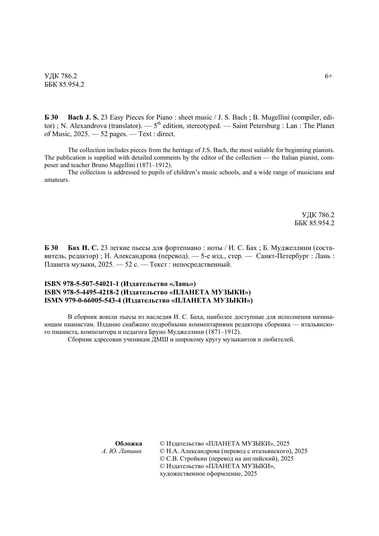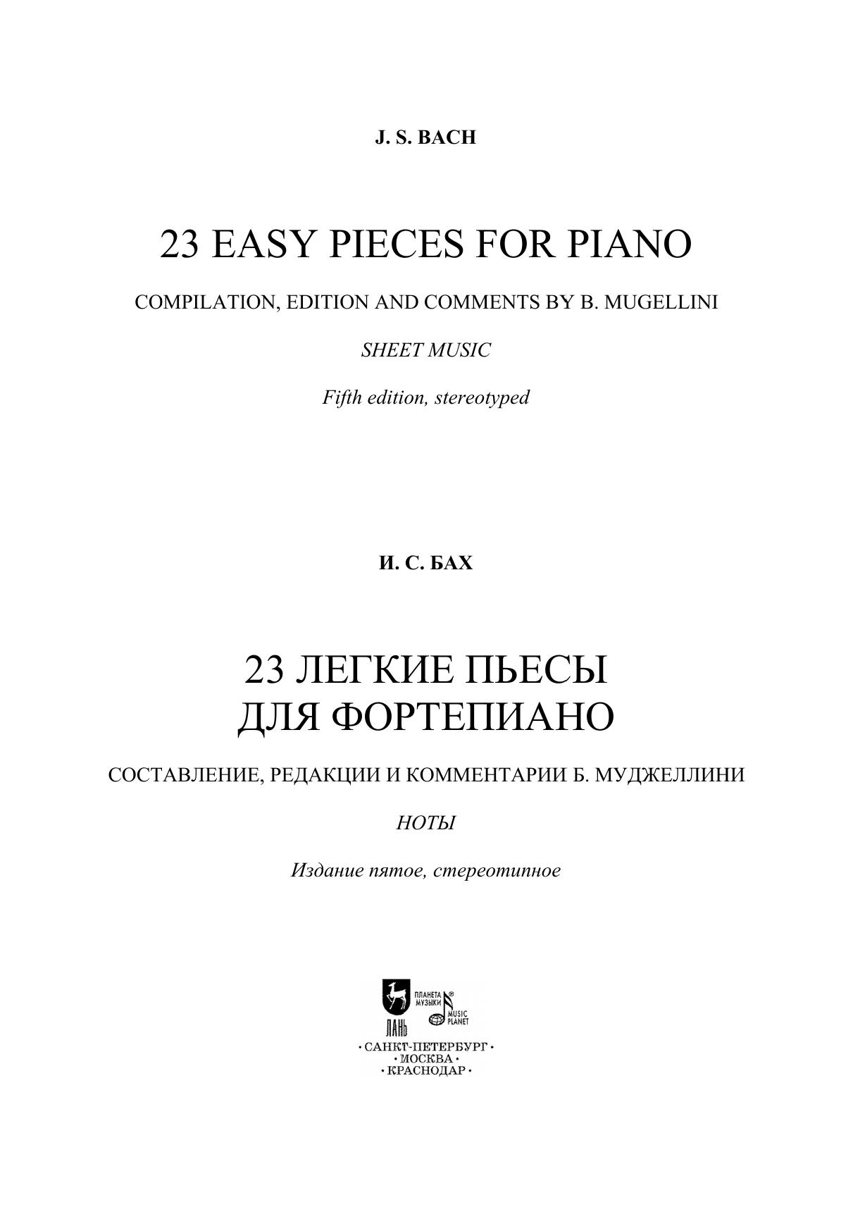В сборник вошли пьесы из наследия И. С. Баха, наиболее доступные для исполнения начинающим пианистам. Издание снабжено подробными комментариями редактора сборника – итальянского пианиста, композитора и педагога Бруно Муджеллини (1871–1912). Сборник адресован ученикам ДМШ и широкому кругу музыкантов и любителей.