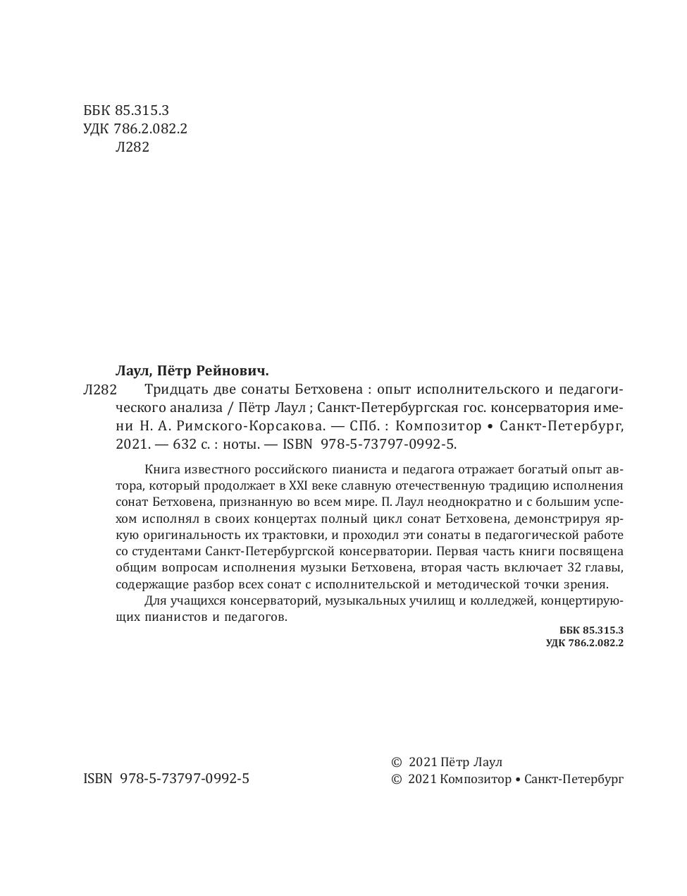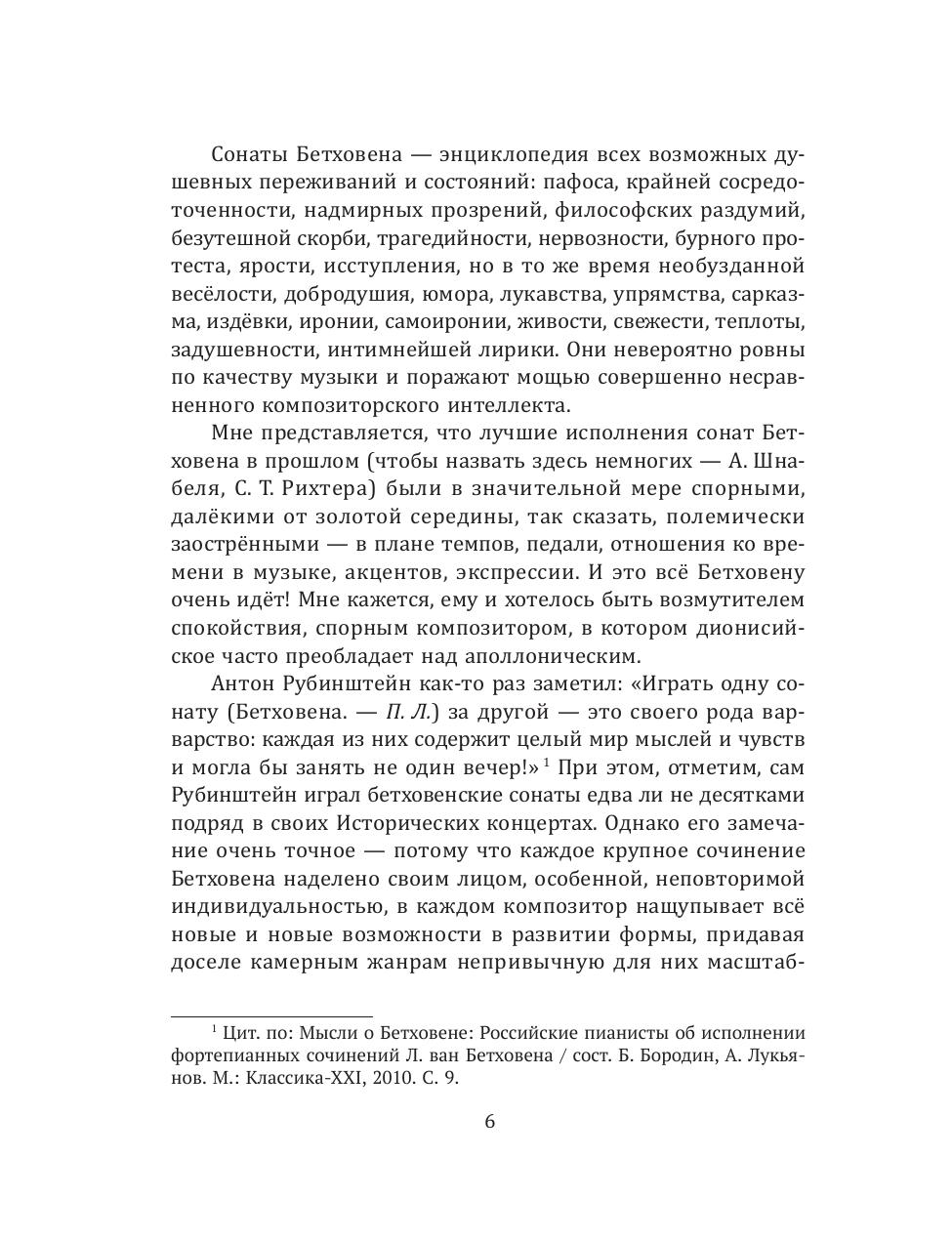 Книга известного российского пианиста и педагога отражает богатый опыт автора, который продолжает в XXI веке славную отечественную традицию исполнения сонат Бетховена, признанную во всем мире. П. Лаул неоднократно и с большим успехом исполнял в своих концертах полный цикл сонат Бетховена, демонстрируя яркую оригинальность их трактовки, и проходил эти сонаты в педагогической работе со студентами Санкт-Петербургской консерватории. Первая часть книги посвящена общим вопросам исполнения музыки Бетховена, вторая часть включает 32 главы, содержащие разбор всех сонат с исполнительской и методической точки зрения.