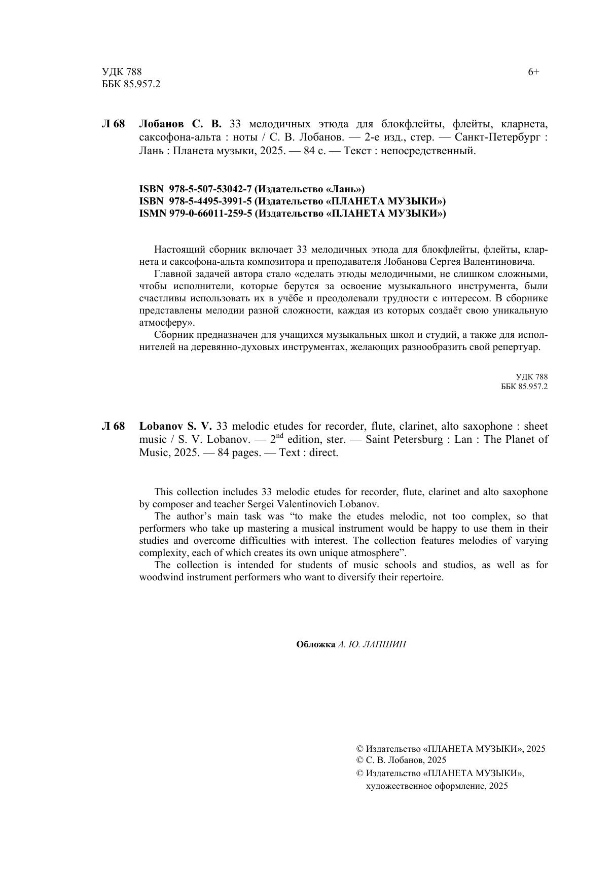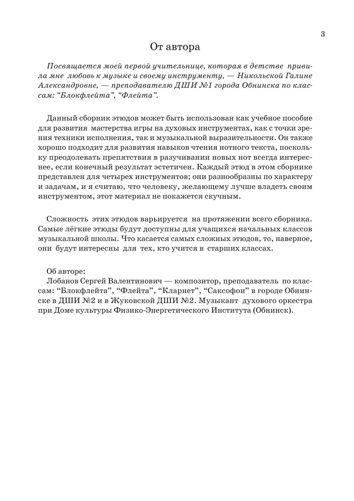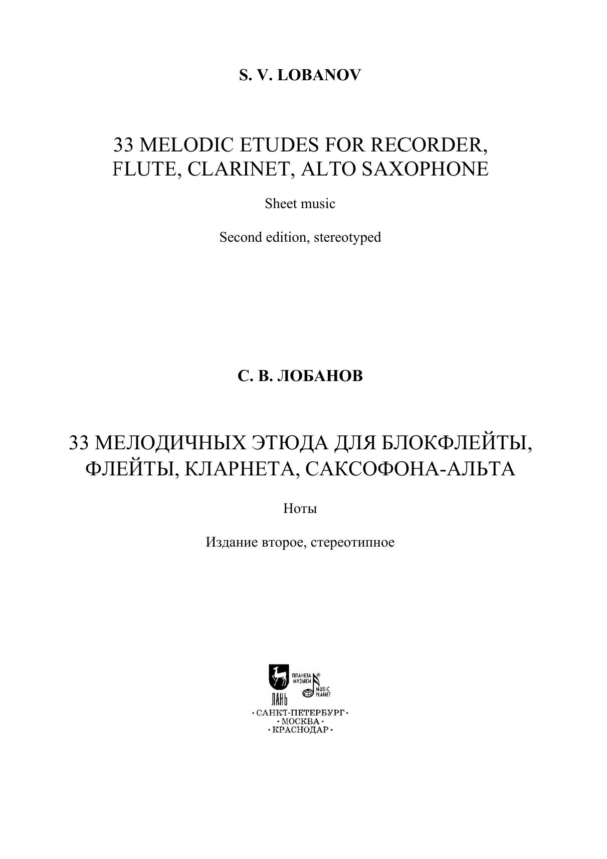 Настоящий сборник включает 33 мелодичных этюда для блокфлейты, флейты, кларнета и саксофона-альта композитора и преподавателя Лобанова Сергея Валентиновича. Главной задачей автора стало «сделать этюды мелодичными, не слишком сложными, чтобы исполнители, которые берутся за освоение музыкального инструмента, были счастливы использовать их в учёбе и преодолевали трудности с интересом. В сборнике представлены мелодии разной сложности, каждая из которых создаёт свою уникальную атмосферу». Сборник предназначен для учащихся музыкальных школ и студий, а также для исполнителей на деревянно-духовых инструментах, желающих разнообразить свой репертуар. This collection includes 33 melodic etudes for recorder, flute, clarinet and alto saxophone by composer and teacher Sergei Valentinovich Lobanov. The author’s main task was “to make the etudes melodic, not too complex, so that performers who take up mastering a musical instrument would be happy to use them in their studies and overcome difficulties with interest. The collection features melodies of varying complexity, each of which creates its own unique atmosphere”. The collection is intended for students of music schools and studios, as well as for woodwind instrument performers who want to diversify their repertoire.