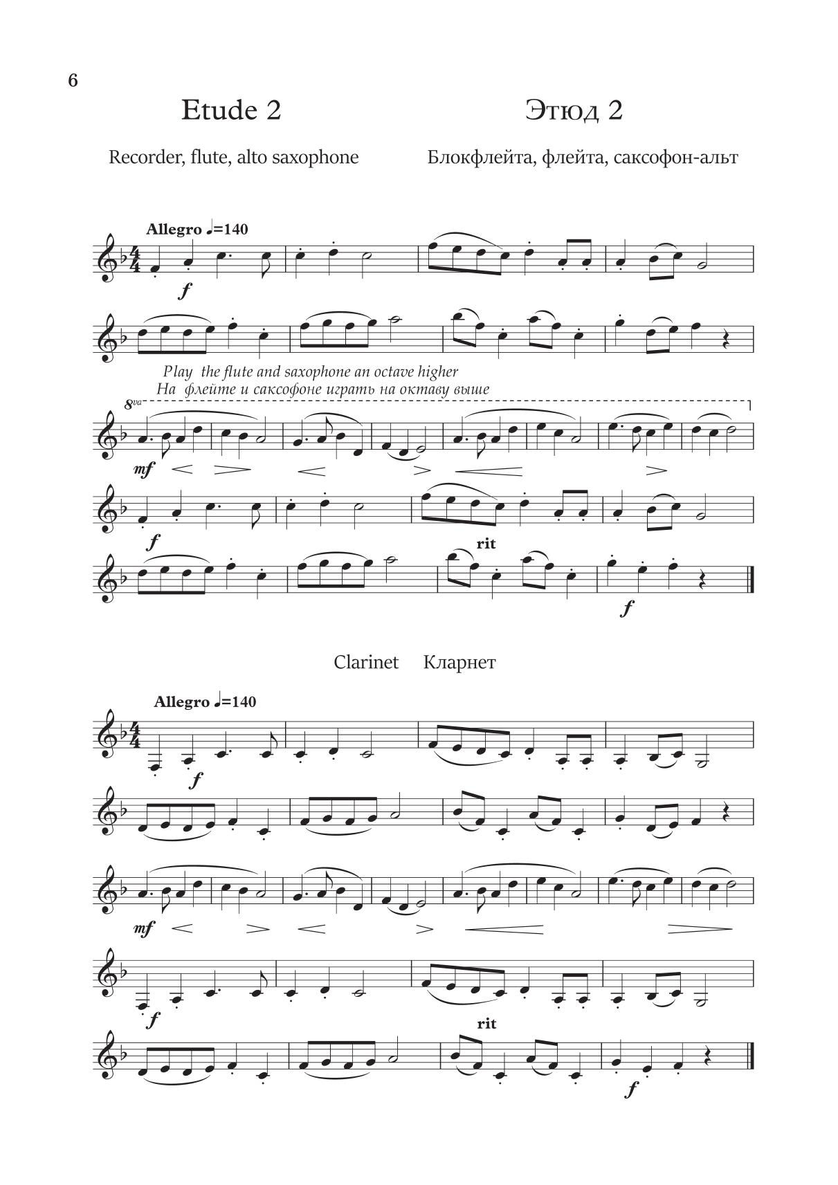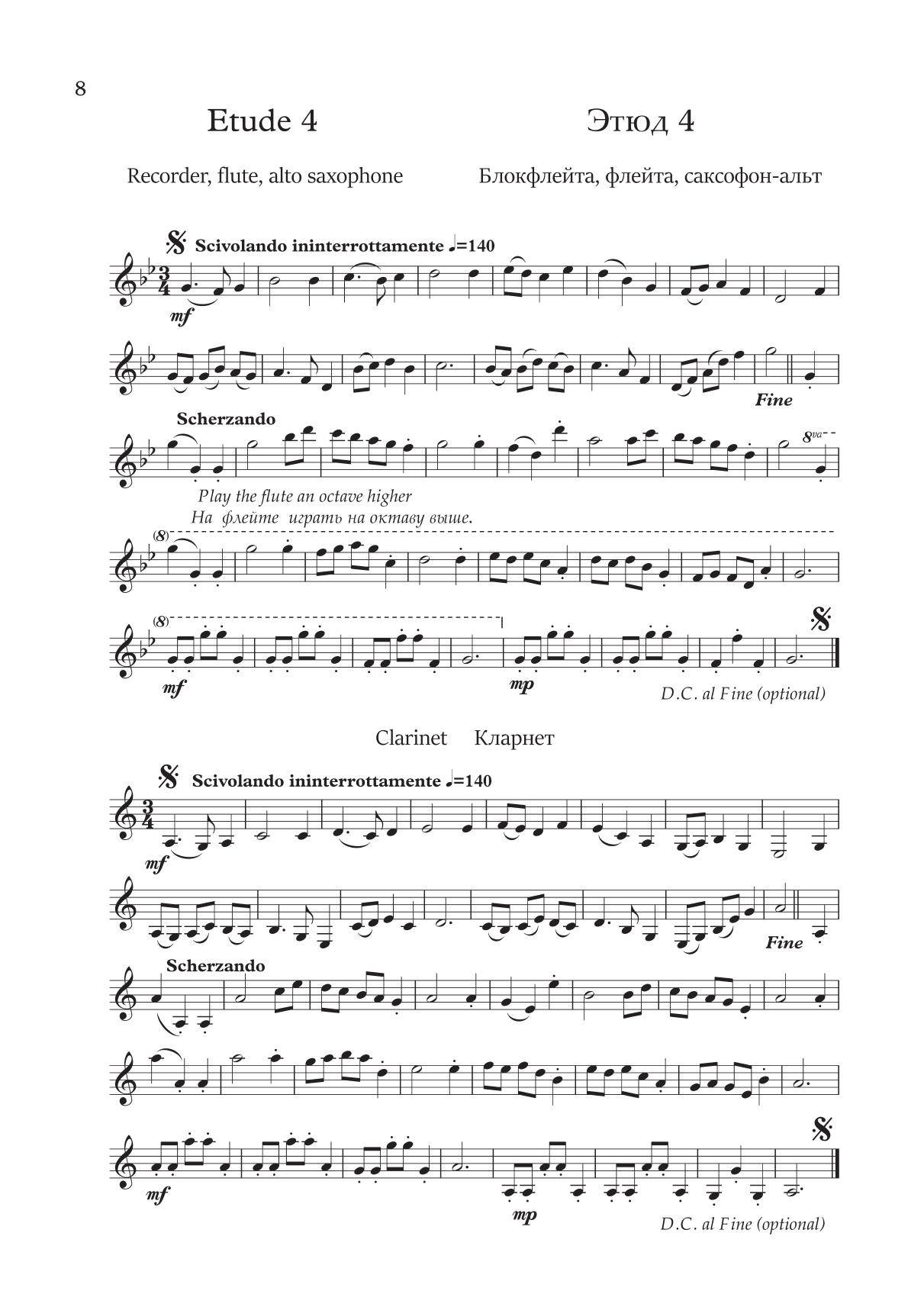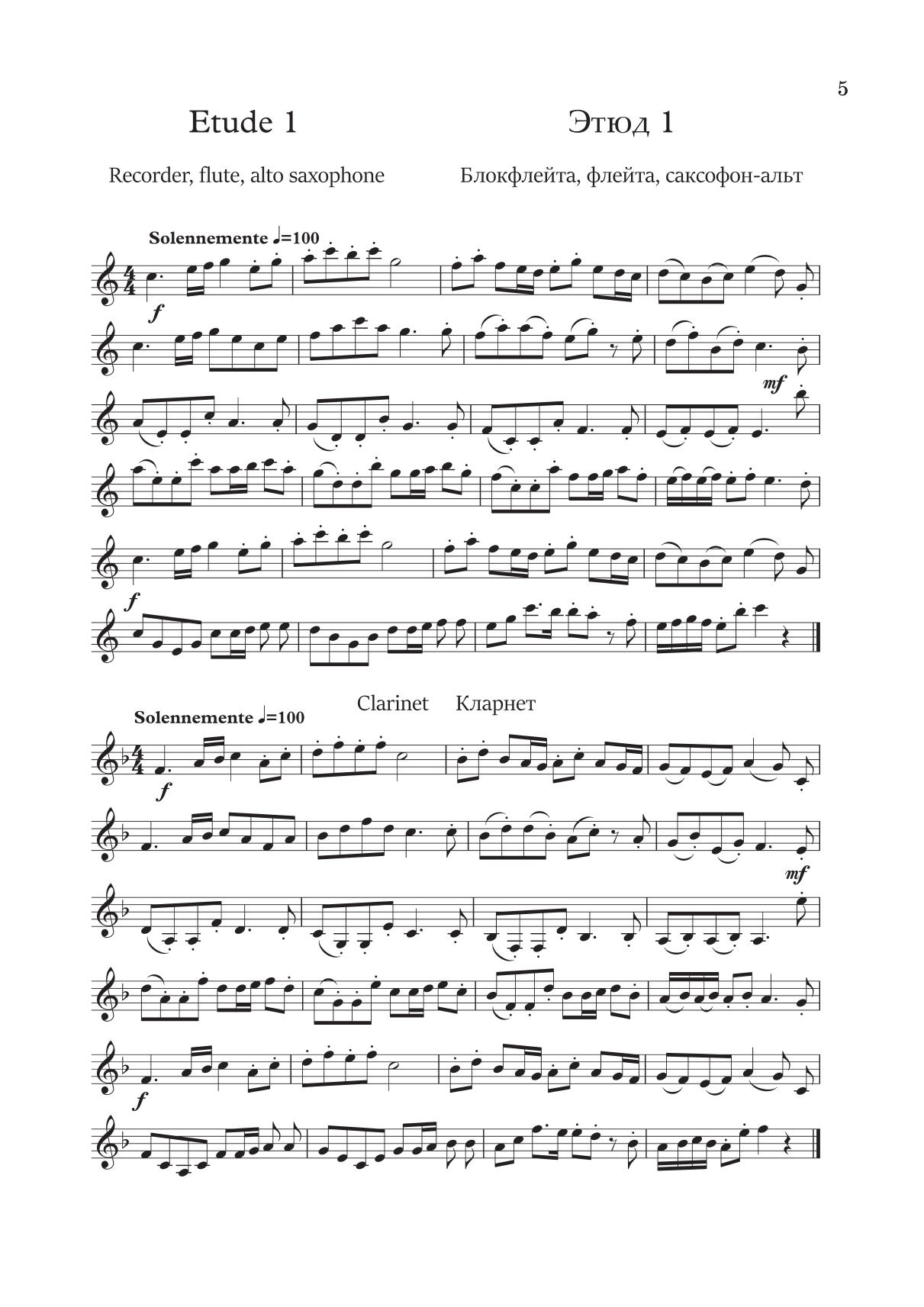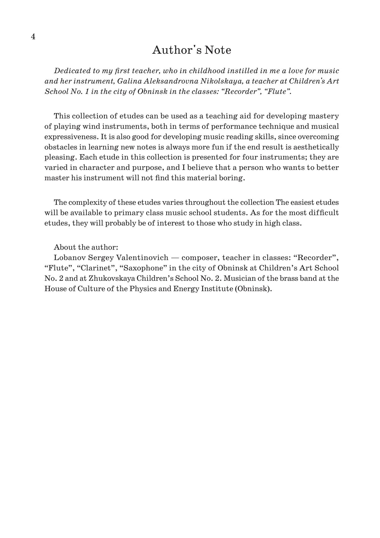 Настоящий сборник включает 33 мелодичных этюда для блокфлейты, флейты, кларнета и саксофона-альта композитора и преподавателя Лобанова Сергея Валентиновича. Главной задачей автора стало «сделать этюды мелодичными, не слишком сложными, чтобы исполнители, которые берутся за освоение музыкального инструмента, были счастливы использовать их в учёбе и преодолевали трудности с интересом. В сборнике представлены мелодии разной сложности, каждая из которых создаёт свою уникальную атмосферу». Сборник предназначен для учащихся музыкальных школ и студий, а также для исполнителей на деревянно-духовых инструментах, желающих разнообразить свой репертуар. This collection includes 33 melodic etudes for recorder, flute, clarinet and alto saxophone by composer and teacher Sergei Valentinovich Lobanov. The author’s main task was “to make the etudes melodic, not too complex, so that performers who take up mastering a musical instrument would be happy to use them in their studies and overcome difficulties with interest. The collection features melodies of varying complexity, each of which creates its own unique atmosphere”. The collection is intended for students of music schools and studios, as well as for woodwind instrument performers who want to diversify their repertoire.