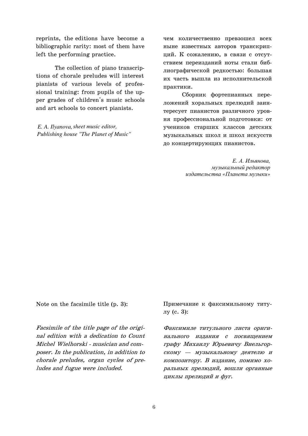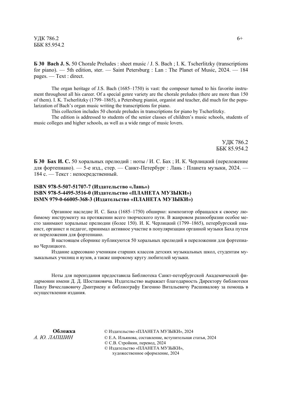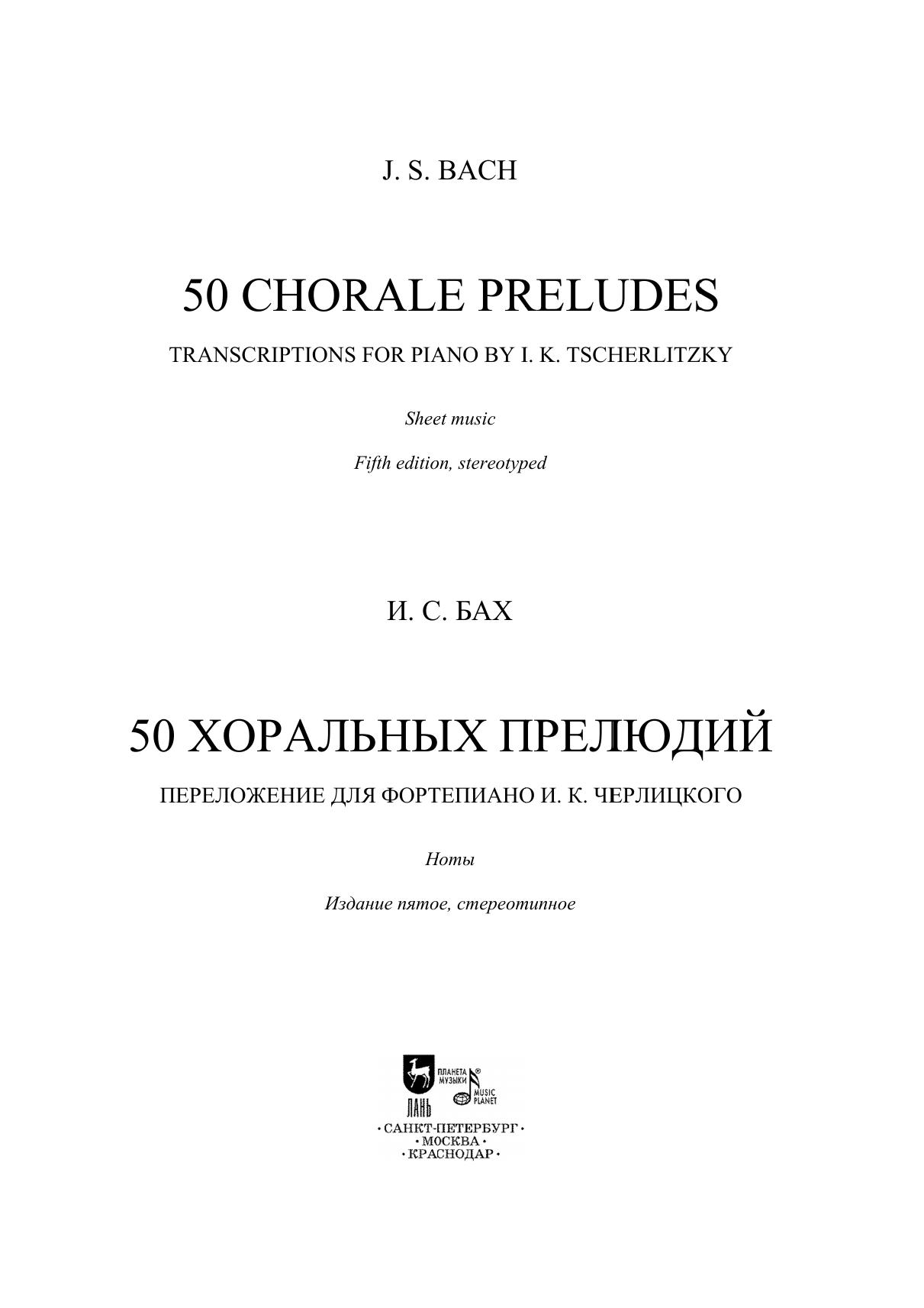 Органное наследие И. С. Баха (1685-1750) обширно: композитор обращался к своему любимому инструменту на протяжении всего творческого пути. В жанровом разнообразии особое место занимают хоральные прелюдии (более 150). И. К. Черлицкий (1799-1865), петербургский пианист, органист и педагог, принимал активное участие в популяризации органной музыки Баха путем ее переложения для фортепиано. В настоящем сборнике публикуются 50 хоральных прелюдий в переложении для фортепиано Черлицкого. Издание адресовано ученикам старших классов детских музыкальных школ, студентам музыкальных училищ и вузов, а также широкому кругу любителей музыки.
