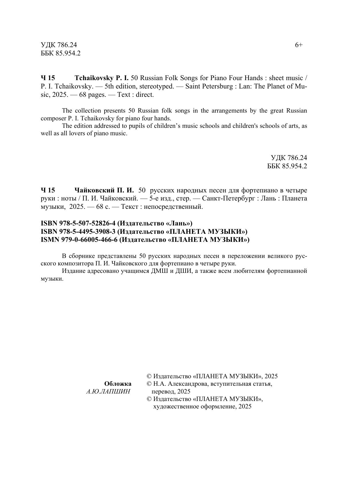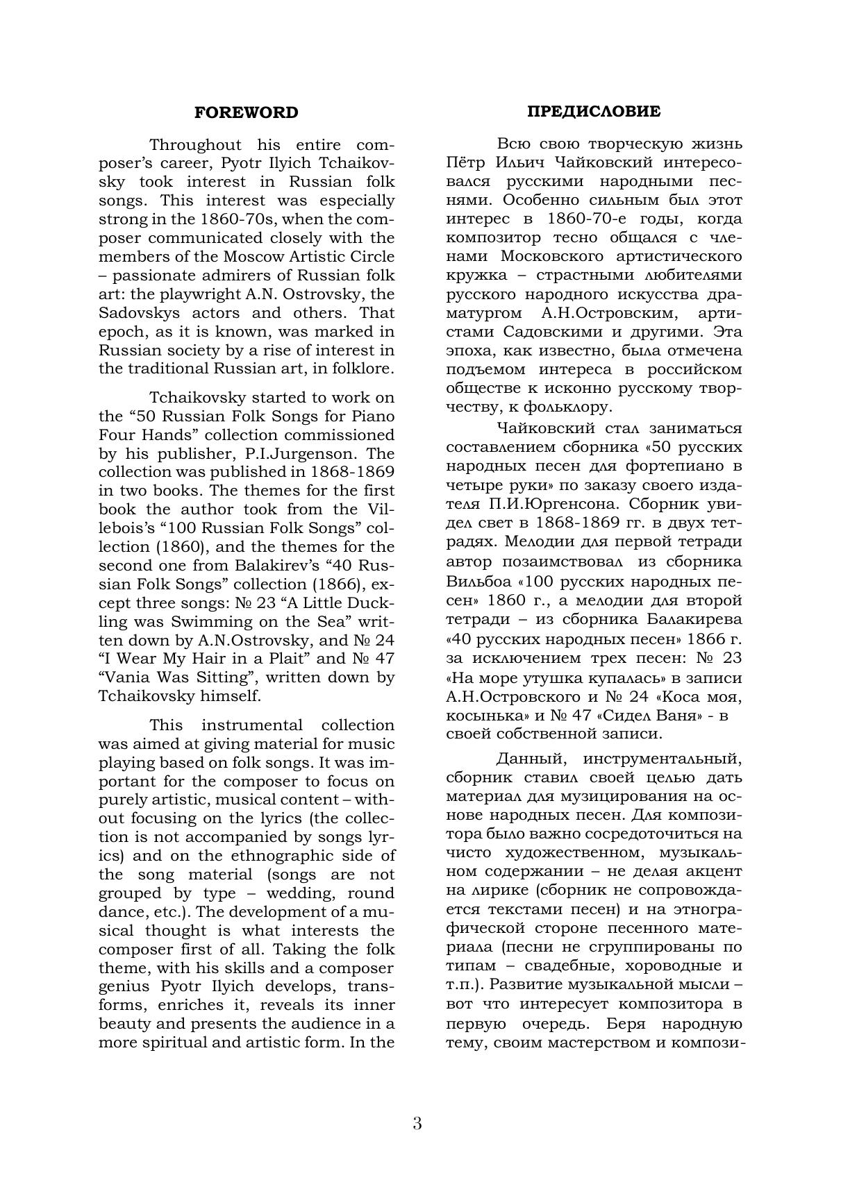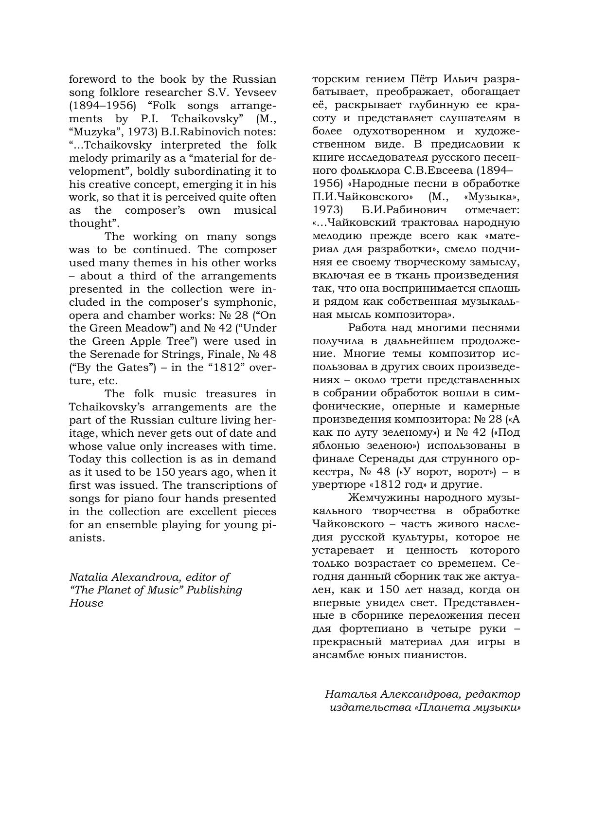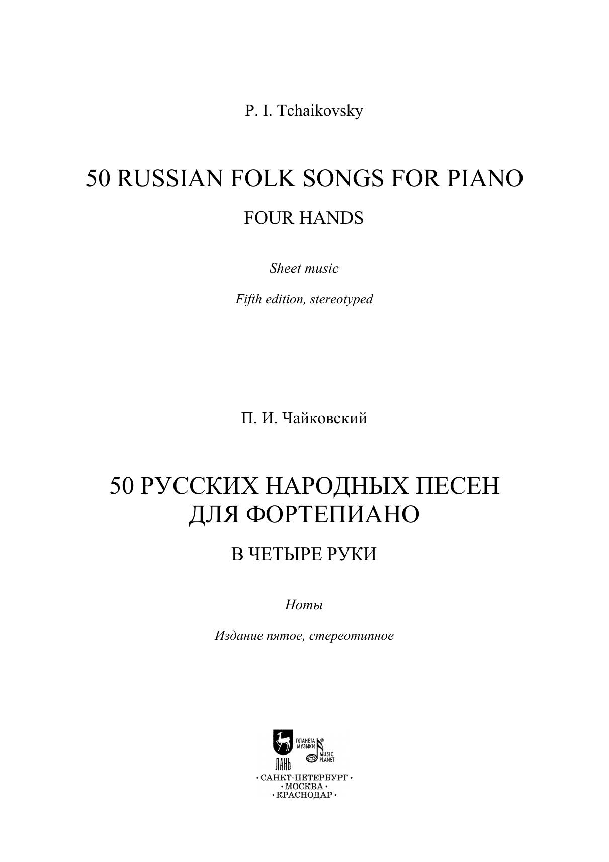 В сборнике представлены 50 русских народных песен в переложении великого русского композитора П. И. Чайковского для фортепиано в четыре руки. Издание адресовано учащимся ДМШ и ДШИ, а также всем любителям фортепианной музыки.