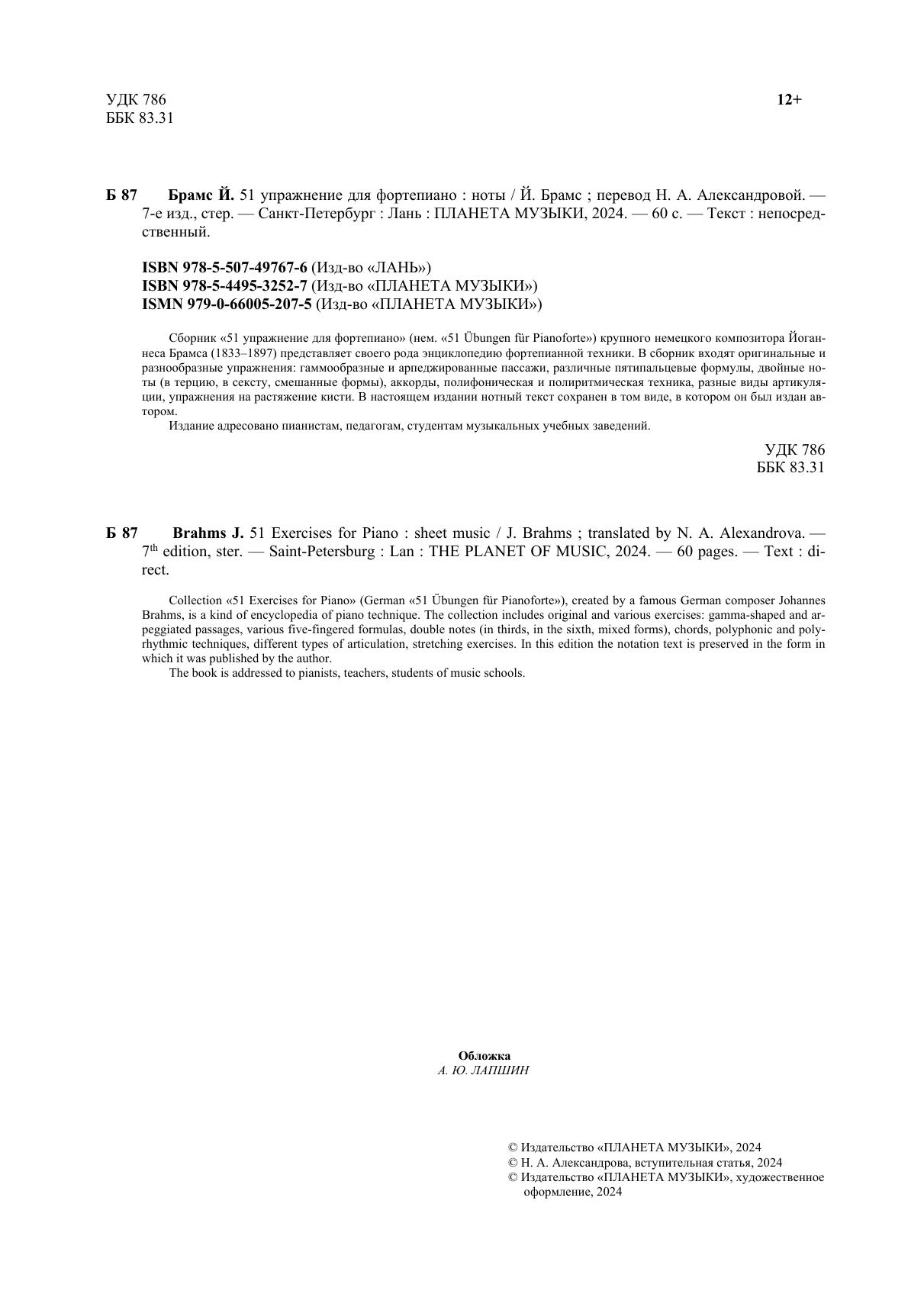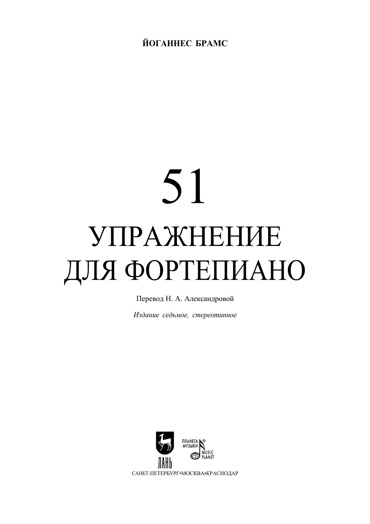 Сборник «51 упражнение для фортепиано» (нем. «51 Übungen für Pianoforte») крупного немецкого композитора Йоганнеса Брамса (1833–1897) представляет своего рода энциклопедию фортепианной техники. В сборник входят оригинальные и разнообразные упражнения: гаммообразные и арпеджированные пассажи, различные пятипальцевые формулы, двойные ноты (в терцию, в сексту, смешанные формы), аккорды, полифоническая и полиритмическая техника, разные виды артикуляции, упражнения на растяжение кисти. В настоящем издании нотный текст сохранен в том виде, в котором он был издан автором. Пособие адресовано пианистам, педагогам, студентам музыкальных учебных заведений. Collection «51 Exercises for Piano» (German «51 Übungen für Pianoforte»), created by famous German composer Johannes Brahms, is a kind of encyclopedia of piano technique. The collection includes original and various exercises: gamma-shaped and arpeggiated passages, various five-fingered formulas, double notes (in thirds, in the sixth, mixed forms), chords, polyphonic and polyrhythmic techniques, different types of articulation, stretching exercises. In this edition, the notation text is preserved in the form in which it was published by the author. The book is addressed to pianists, teachers, students of music schools.