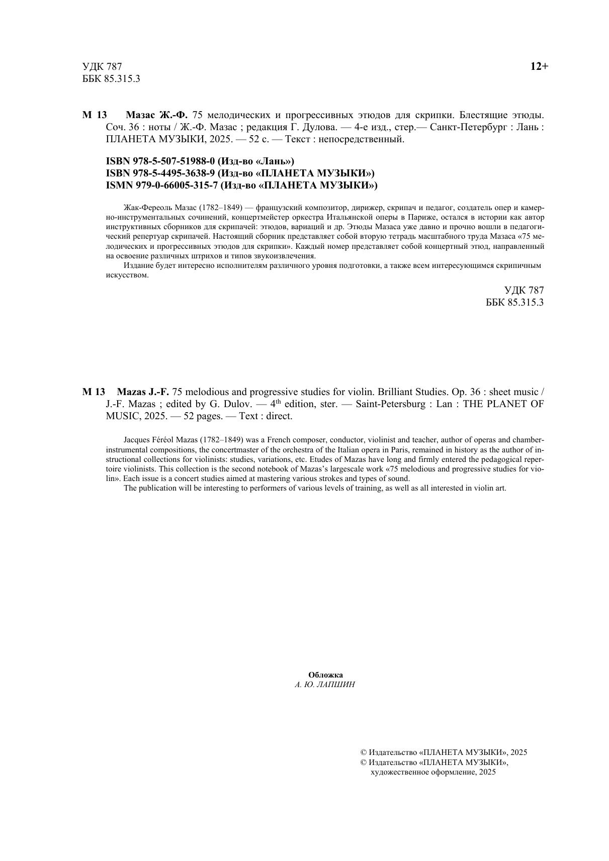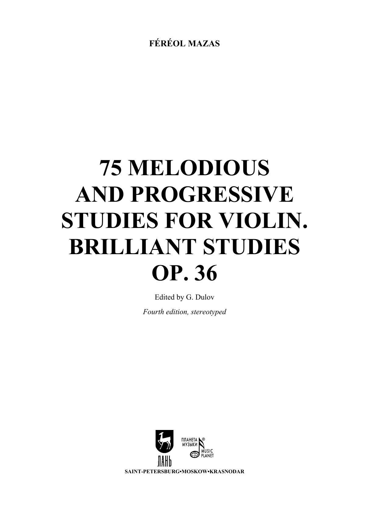 Жак-Фереоль Мазас (1782–1849) — французский композитор, дирижер, скрипач и педагог, создатель опер и камерно-инструментальных сочинений, концертмейстер оркестра Итальянской оперы в Париже, остался в истории как автор инструктивных сборников для скрипачей: этюдов, вариаций и др. Этюды Мазаса уже давно и прочно вошли в педагогический репертуар скрипачей. Настоящий сборник представляет собой вторую тетрадь масштабного труда Мазаса «75 мелодических и прогрессивных этюдов для скрипки». Каждый номер представляет собой концертный этюд, направленный на освоение различных штрихов и типов звукоизвлечения. Издание будет интересно исполнителям различного уровня подготовки, а также всем интересующимся скрипичным искусством. Jacques Fйrйol Mazas (1782–1849) was a French composer, conductor, violinist and teacher, author of operas and chamber-instrumental compositions, the concertmaster of the orchestra of the Italian opera in Paris, remained in history as the author of instructional collections for violinists: studies, variations, etc. Etudes of Mazas have long and firmly entered the pedagogical repertoire violinists. This collection is the second notebook of Mazas’s large-scale work «75 melodious and progressive studies for violin». Each issue is a concert studies aimed at mastering various strokes and types of sound. The publication will be interesting to performers of various levels of training, as well as all interested in violin art.