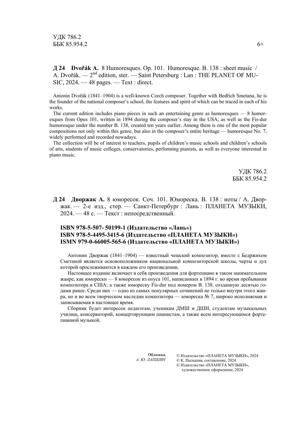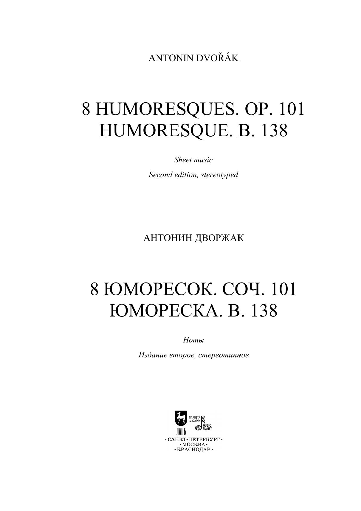 Антонин Дворжак (1841–1904) – известный чешский композитор, вместе с Бедржихом Сметаной является основоположником национальной композиторской школы, черты и дух которой прослеживаются в каждом его произведении. Настоящее издание включает в себя произведения для фортепиано в таком занимательном жанре, как юморески – 8 юморесок из опуса 101, написанных в 1894 г. во время пребывания композитора в США, а также юмореску Fis-dur под номером B. 138, созданную десятью годами ранее. Среди них – одно из самых популярных сочинений не только внутри этого жанра, но и во всем творческом наследии композитора – юмореска № 7, широко исполняемая и записываемая в настоящее время. Сборник будет интересен педагогам, ученикам ДМШ и ДШИ, студентам музыкальных училищ, консерваторий, концертирующим пианистам, а также всем интересующимся фортепианной музыкой. Antonin Dvořák (1841–1904) is a well-known Czech composer. Together with Bedřich Smetana, he is the founder of the national composer’s school, the features and spirit of which can be traced in each of his works. The current edition includes piano pieces in such an entertaining genre as humoresques – 8 humoresques from Opus 101, written in 1894 during the composer's stay in the USA, as well as the Fis-dur humoresque under the number B. 138, created ten years earlier. Among them is one of the most popular compositions not only within this genre, but also in the composer’s entire heritage – humoresque No. 7, widely performed and recorded nowadays. The collection will be of interest to teachers, pupils of children's music schools and children's schools of arts, students of music colleges, conservatories, performing pianists, as well as everyone interested in piano music.