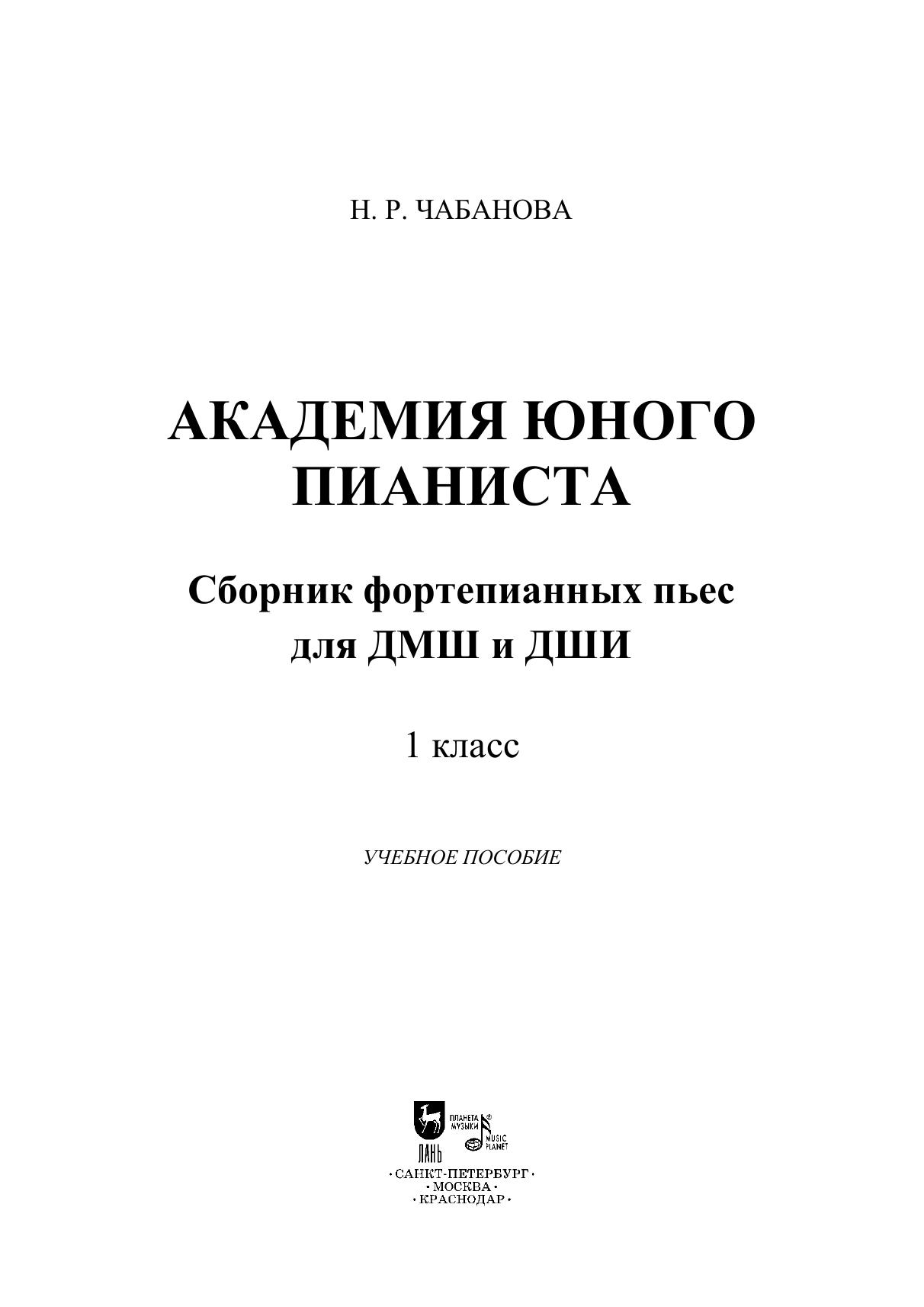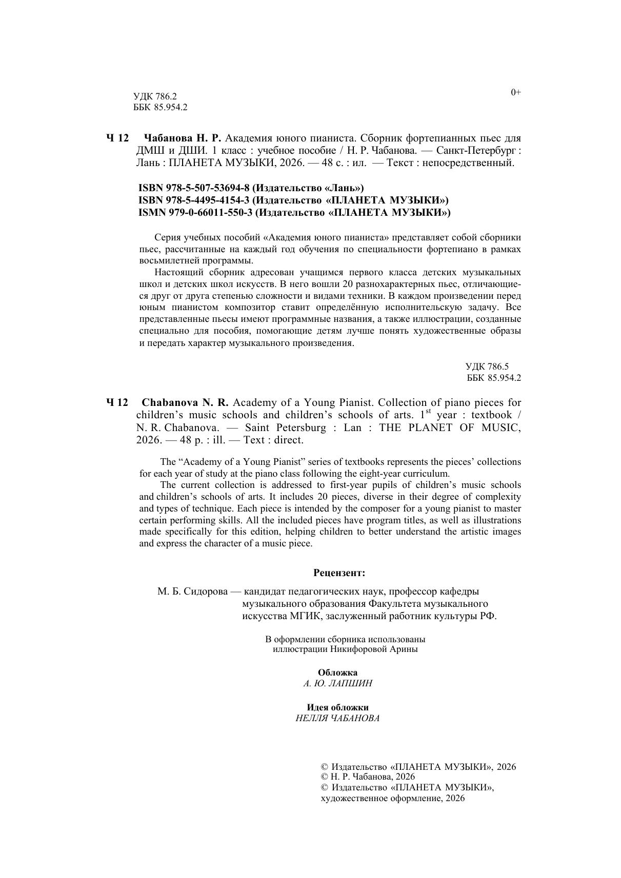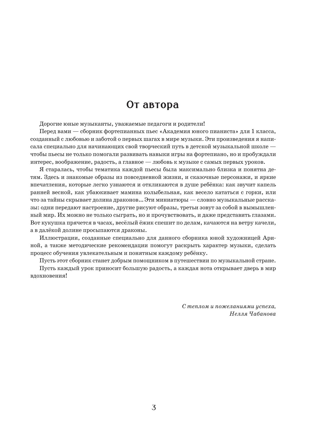 Серия учебных пособий «Академия юного пианиста» представляет собой сборники пьес, рассчитанные на каждый год обучения по специальности фортепиано в рамках восьмилетней программы. Настоящий сборник адресован учащимся первого класса детских музыкальных школ и детских школ искусств. В него вошли 20 разнохарактерных пьес, отличающиеся друг от друга степенью сложности и видами техники. В каждом произведении перед юным пианистом композитор ставит определённую исполнительскую задачу. Все представленные пьесы имеют программные названия, а также иллюстрации, созданные специально для пособия, помогающие детям лучше понять художественные образы и передать характер музыкального произведения. The “Academy of a Young Pianist” series of textbooks represents the pieces’ collections for each year of study at the piano class following the eight-year curriculum. The current collection is addressed to first-year pupils of children’s music schools and children’s schools of arts. It includes 20 pieces, diverse in their degree of complexity and types of technique. Each piece is intended by the composer for a young pianist to master certain performing skills. All the included pieces have program titles, as well as illustrations made specifically for this edition, helping children to better understand the artistic images and express the character of a music piece.